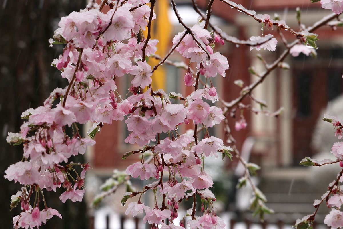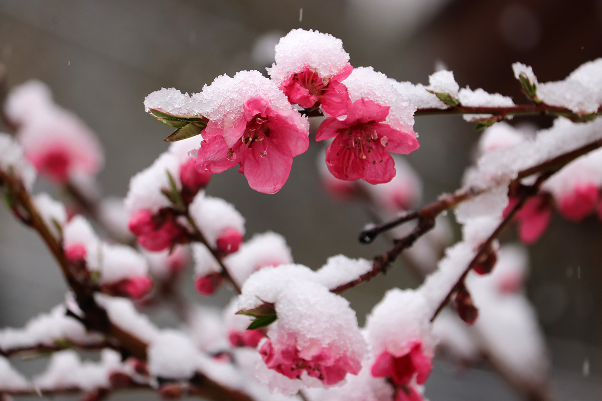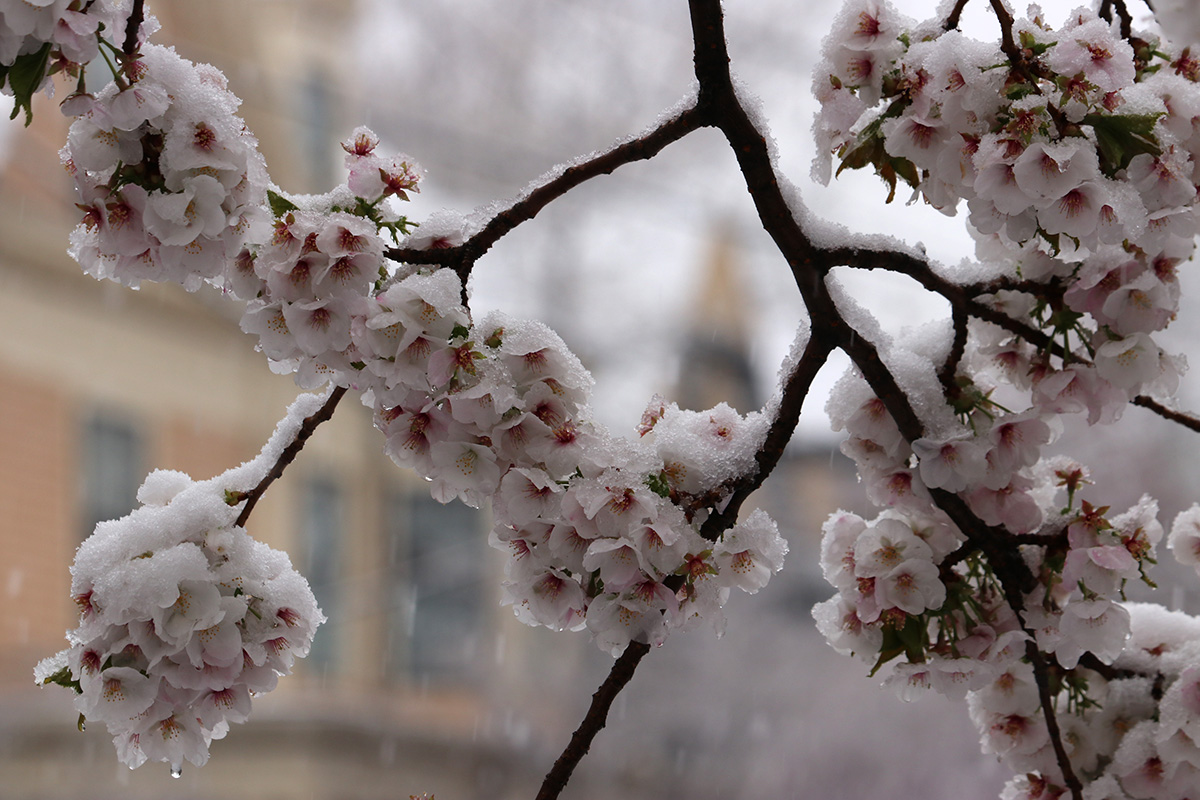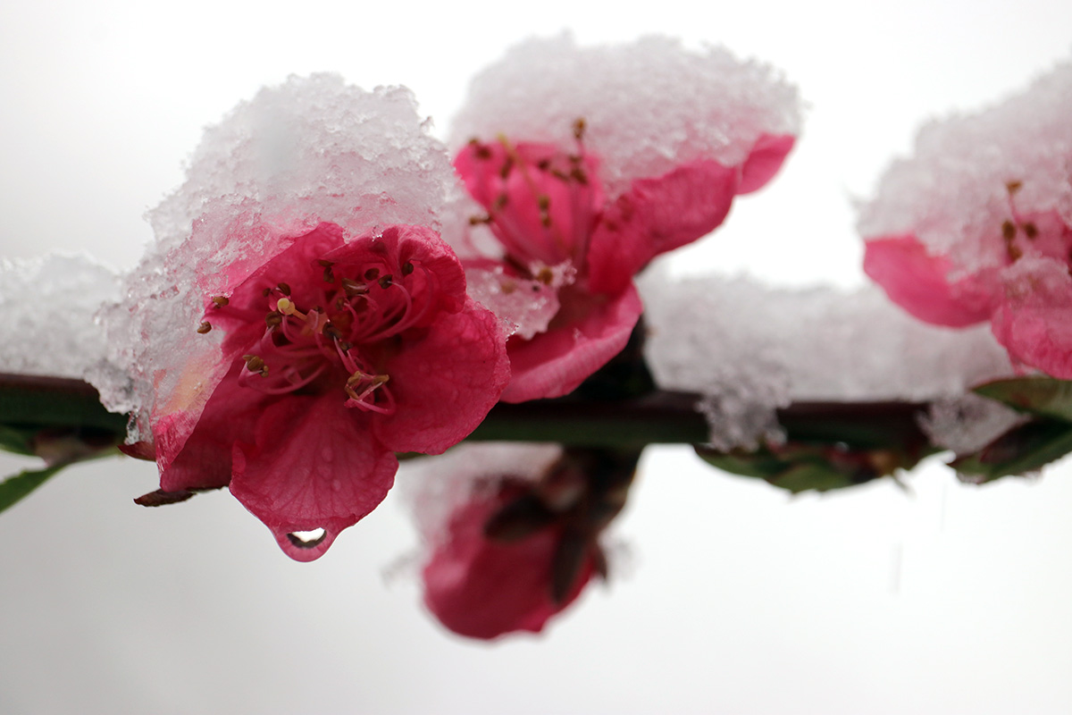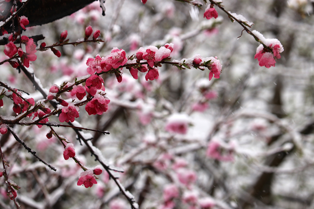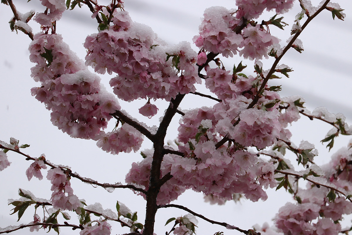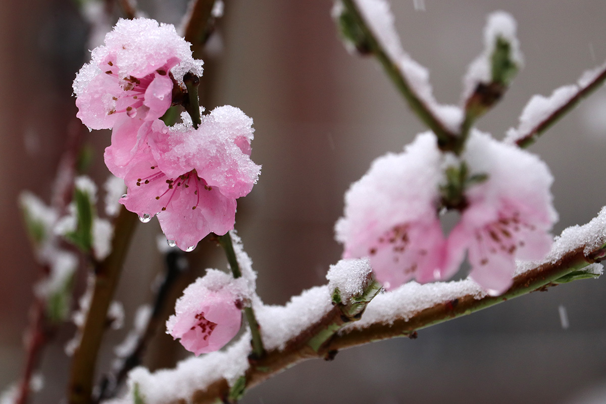 i circled the block, photographing some flowering trees, including yoshino cherries and peach blossoms. i seemed to be the first person out there since it snowed because i didn't see any other foot prints.