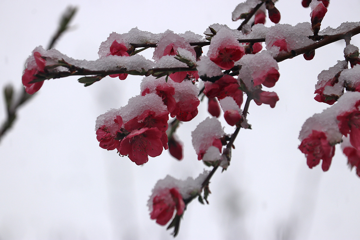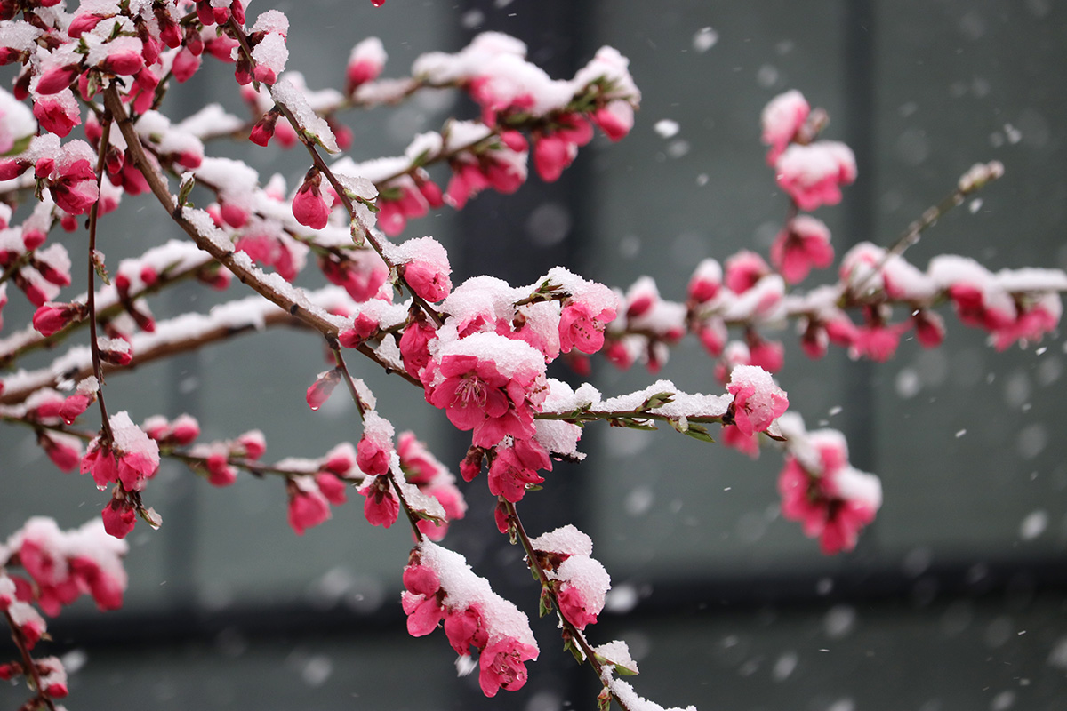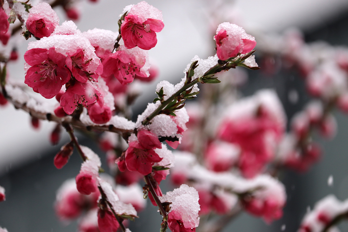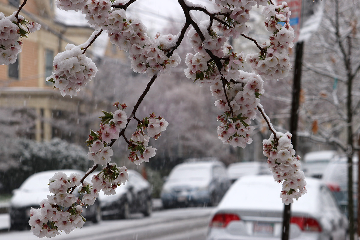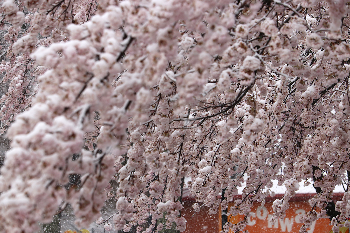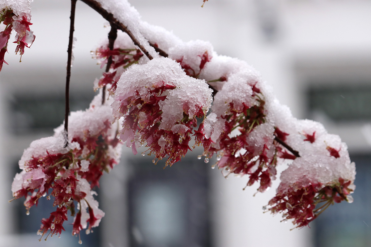 i circled the block, photographing some flowering trees, including yoshino cherries and peach blossoms. i seemed to be the first person out there since it snowed because i didn't see any other foot prints.
