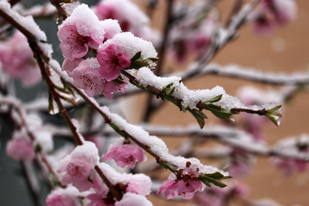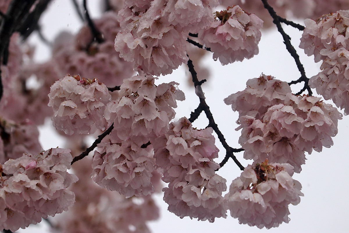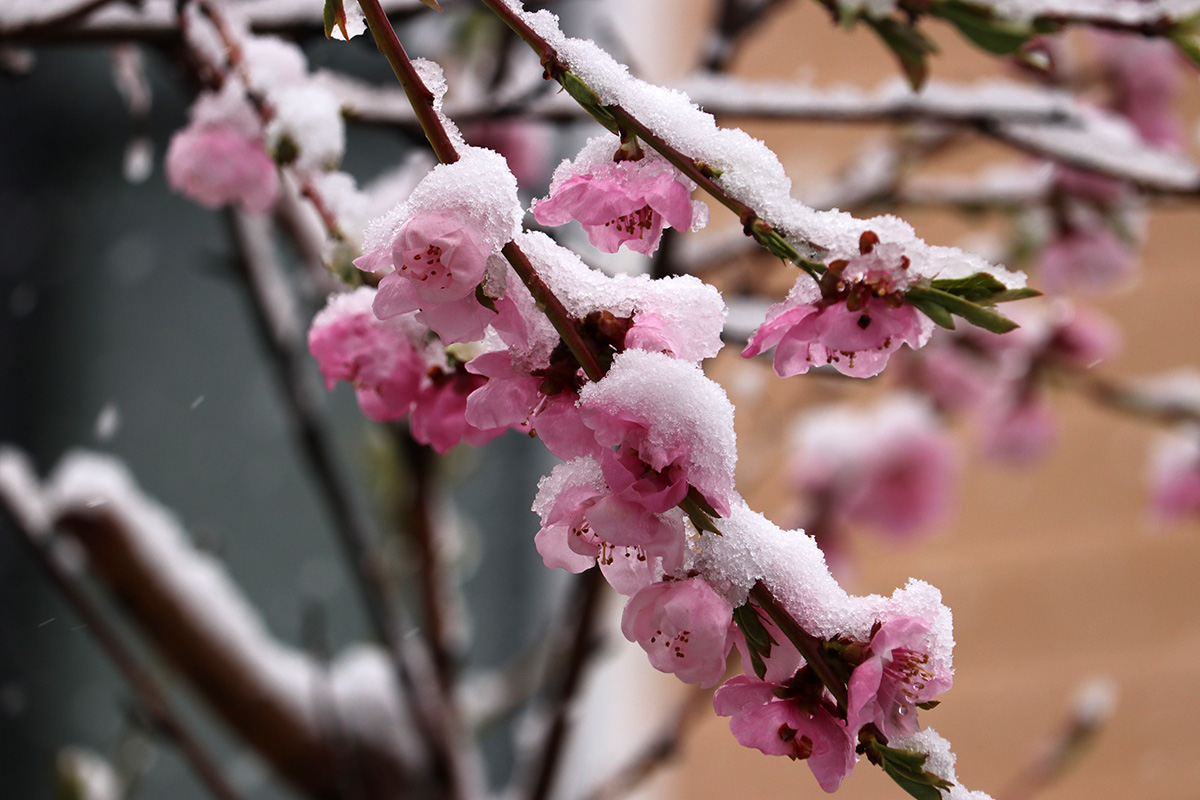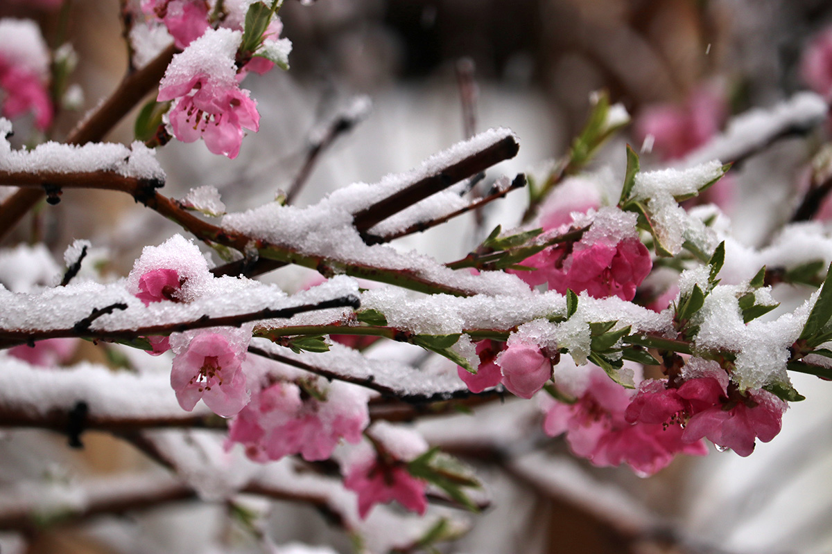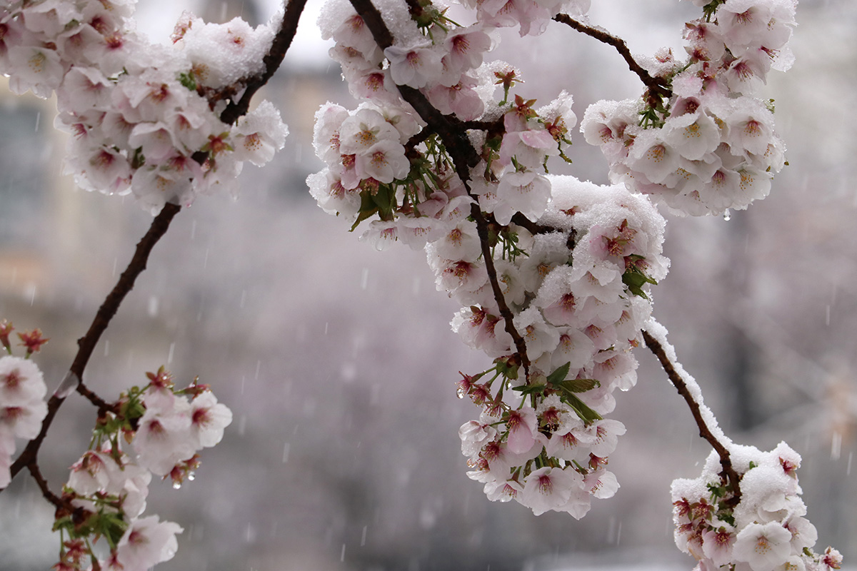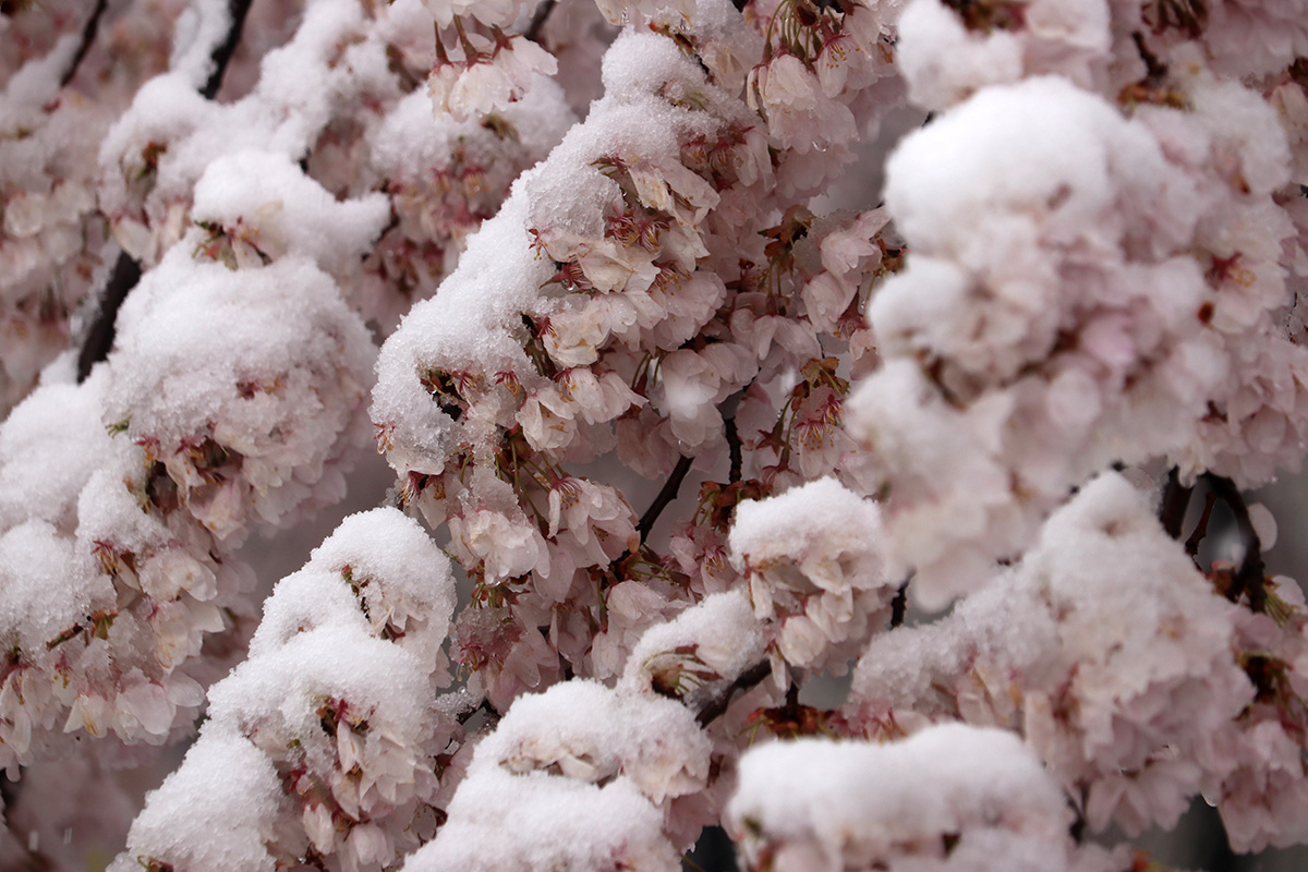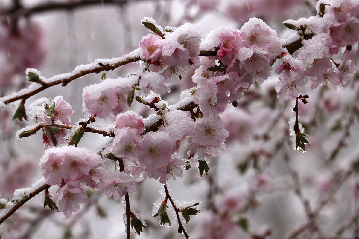i circled the block, photographing some flowering trees, including yoshino cherries and peach blossoms. i seemed to be the first person out there since it snowed because i didn't see any other foot prints.