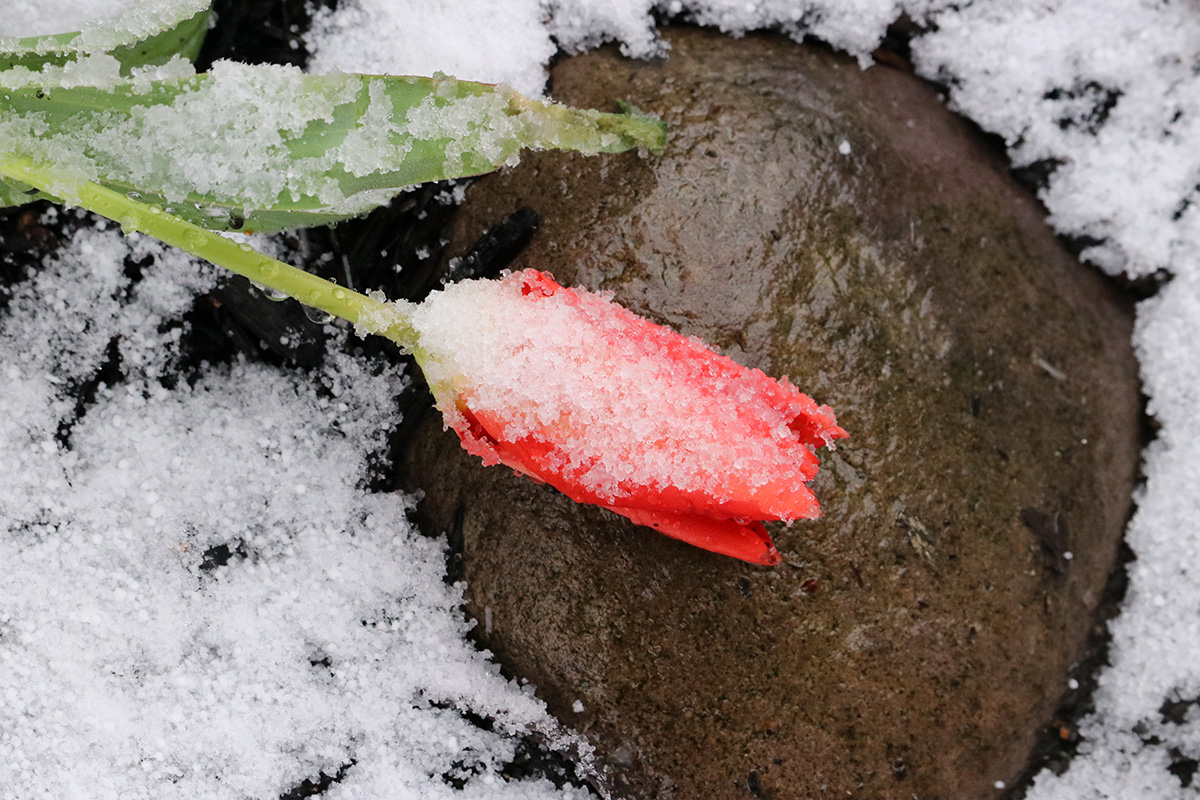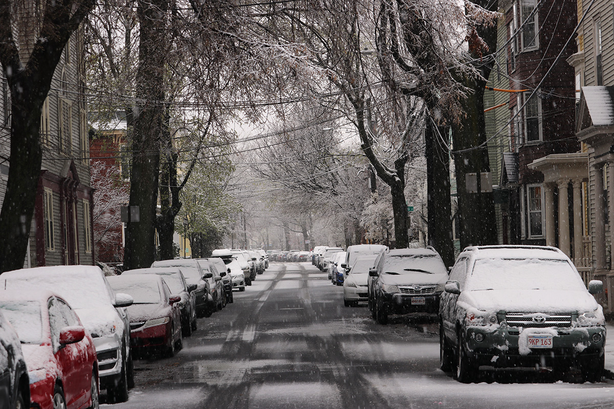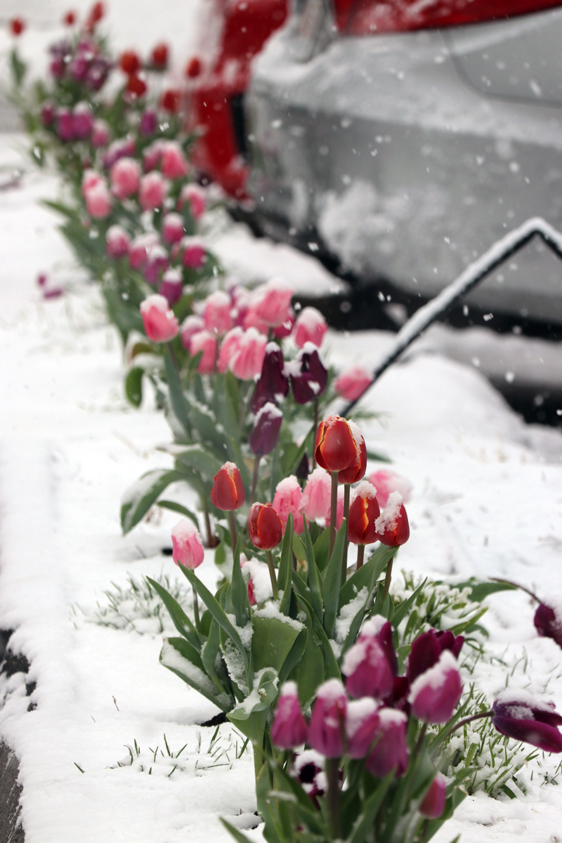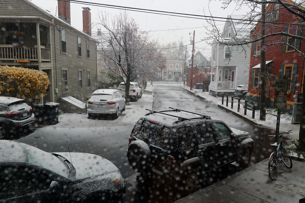 my mother called me at 9:30am this morning. i was still asleep. she said it was snowing and told me i should go outside and take some photos. i'd heard it'd be snowing in western MA and high elevation places, but i wasn't expecting it to snow here in the boston area. even stranger, the temperature was in the upper 30's, not cold enough to sustain snow, yet here we are. this seemed like the latest it's ever snowed here in the boston area, but i'd forgotten that it snowed late last year as well, on april 18th. 2 inches fell that time, and i even had to clean the snow off of the solar panels.
