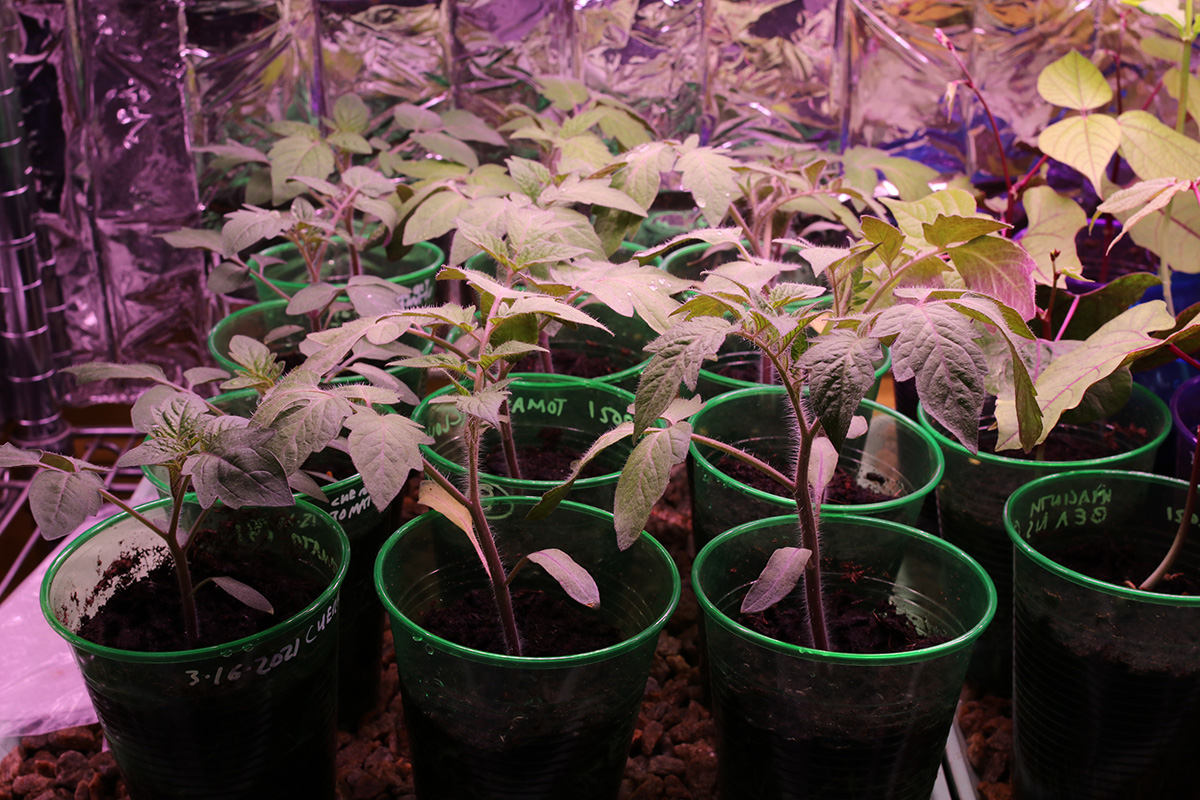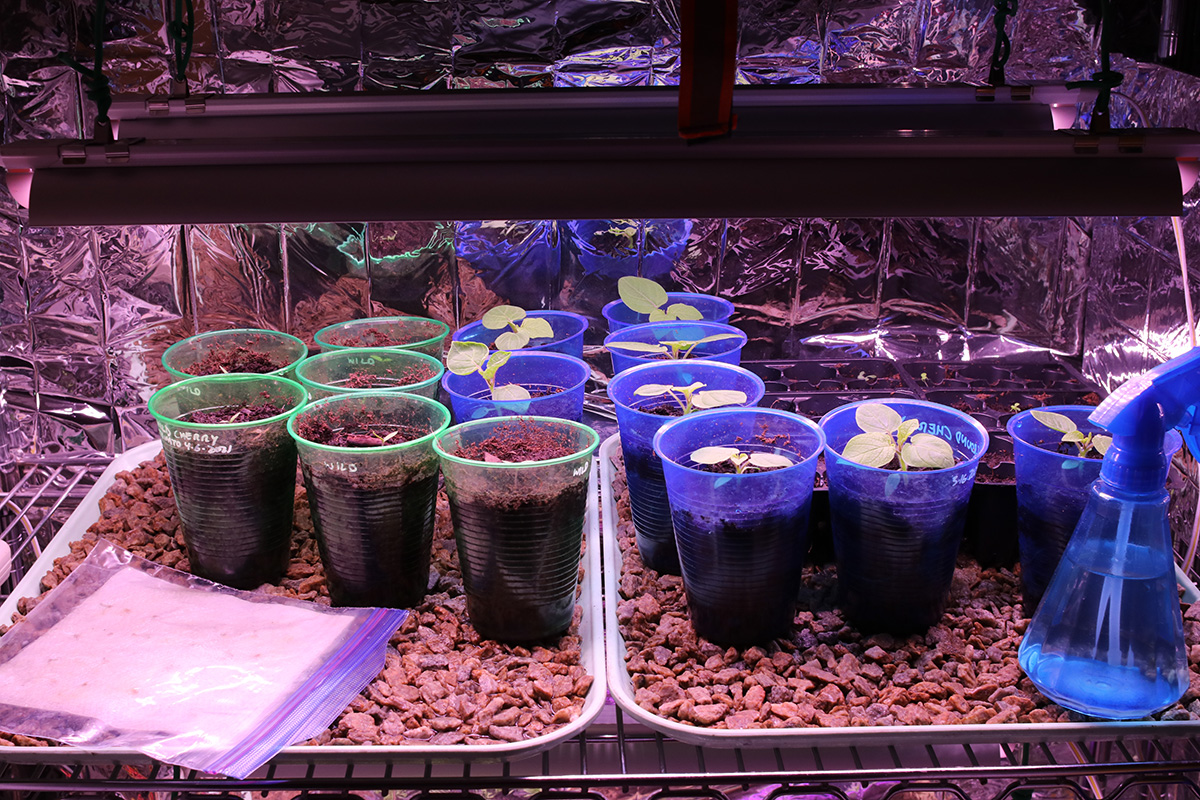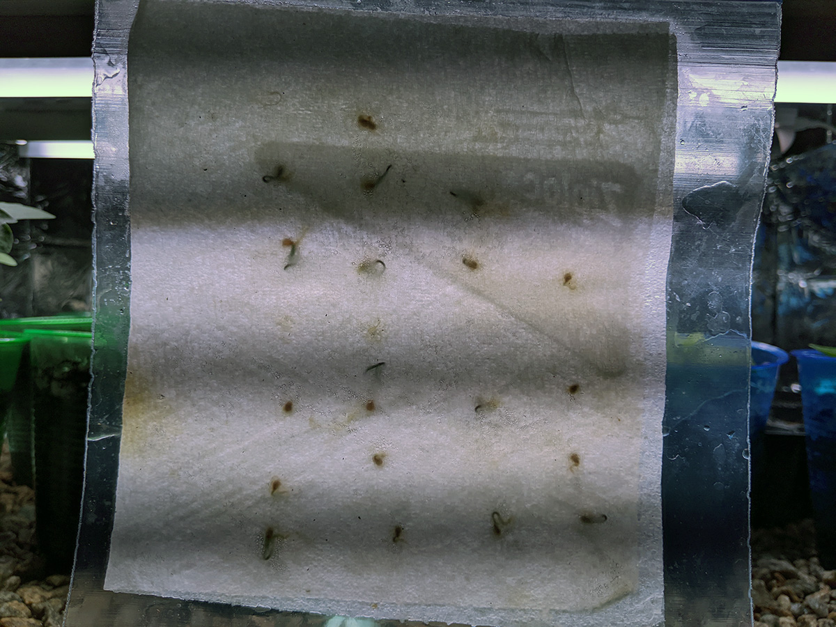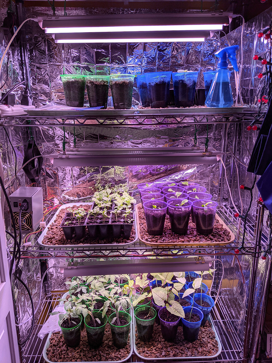 i watered my grow closet plants and did some rearranging. i swapped the location of the two middle shelf trays. the eggplants were sitting right in front of the fan and the constant cool breeze seemed to be stunting the eggplants, which prefer hot temperatures. the wild tomato seedlings are doing well, i just regret not starting them the same time as my other tomato seedlings, which already have a month headstart. my bag of pre-germinating seedlings seemed to have all sprouted but i don't have anymore room for them.