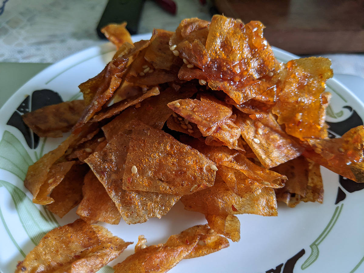 for lunch my mother heated up some ikea rösti potato pancakes she had in the freezer. i also had a glass of warm soy milk blended with some cooked buttercup squash. following the tradition of snacking whenever i'm over at my parent's place, i had some fried tofu skin, then later corn chips with guacamole.
