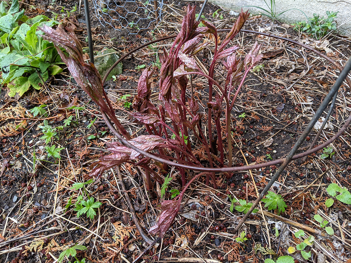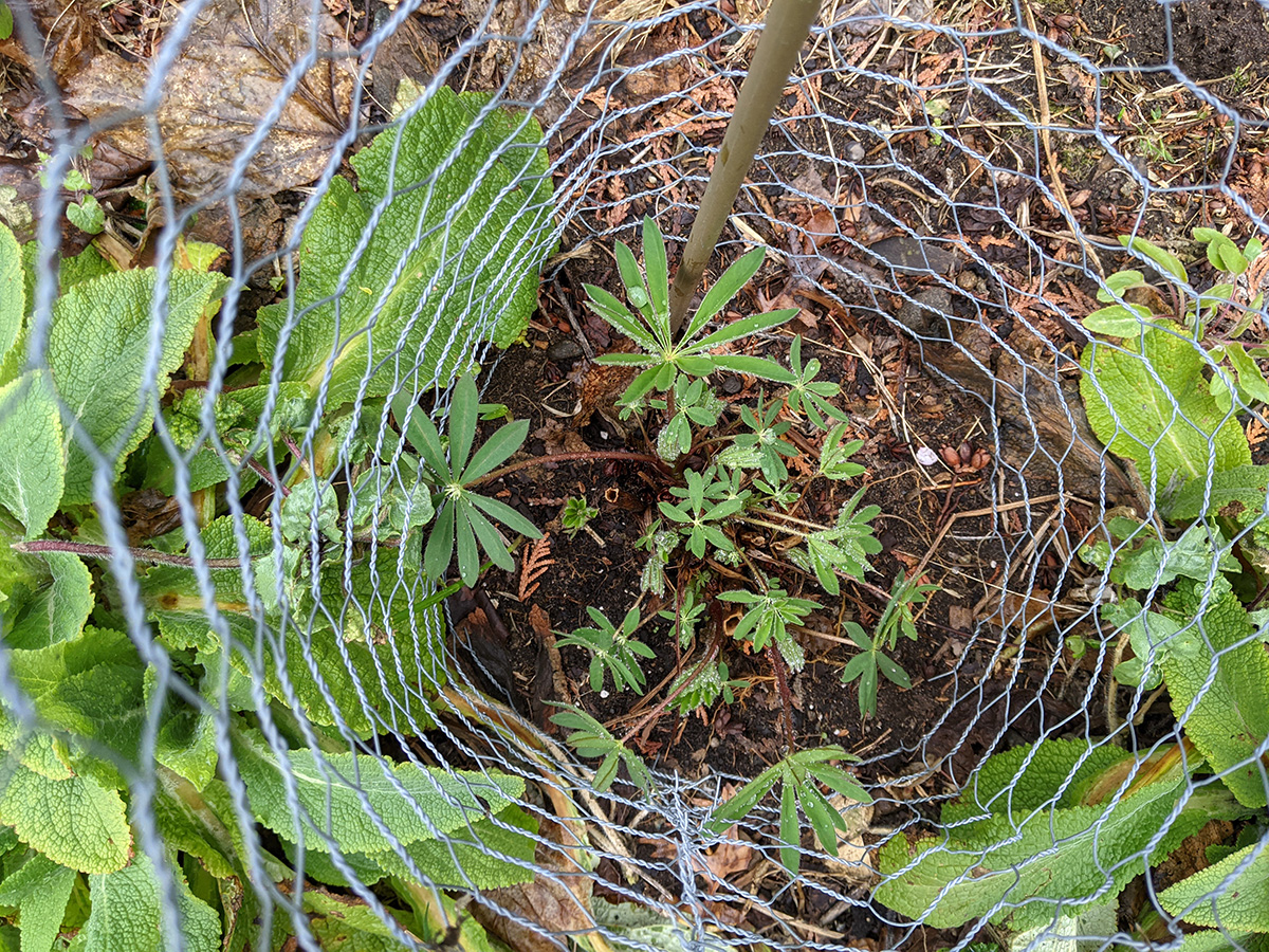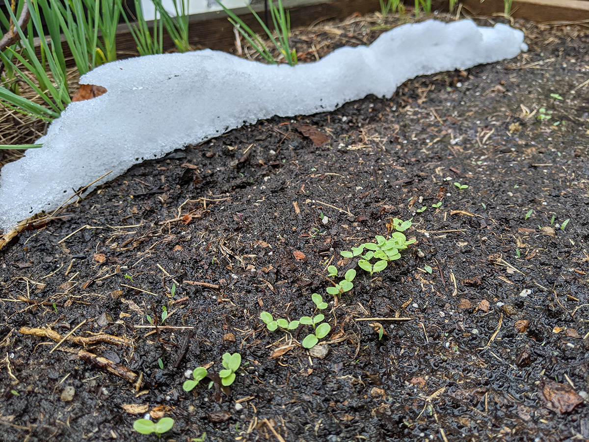 the rain seemed to have done the backyard some good, as plants looked lush. the garlic bed - still covered in some snow - looked to be in good shape, strong looking stalks of garlic. more lettuce seedlings have emerged under the row cover. lupines continue to develop, and the tiny seedlings i transplanted on monday all survived and seemed to be doing well. the quince bush didn't look to have lost a single petal in the storm. peonies continue to emerge from the ground. the grass seeds i sowed nearly 3 weeks ago have also finally germinated.