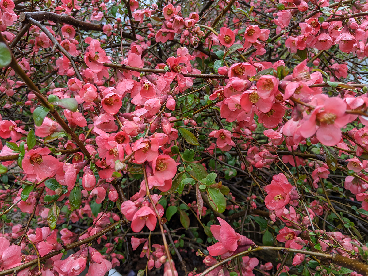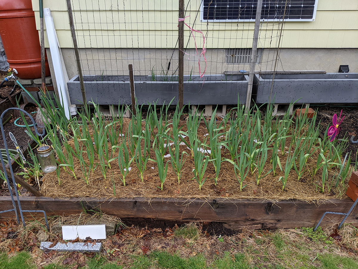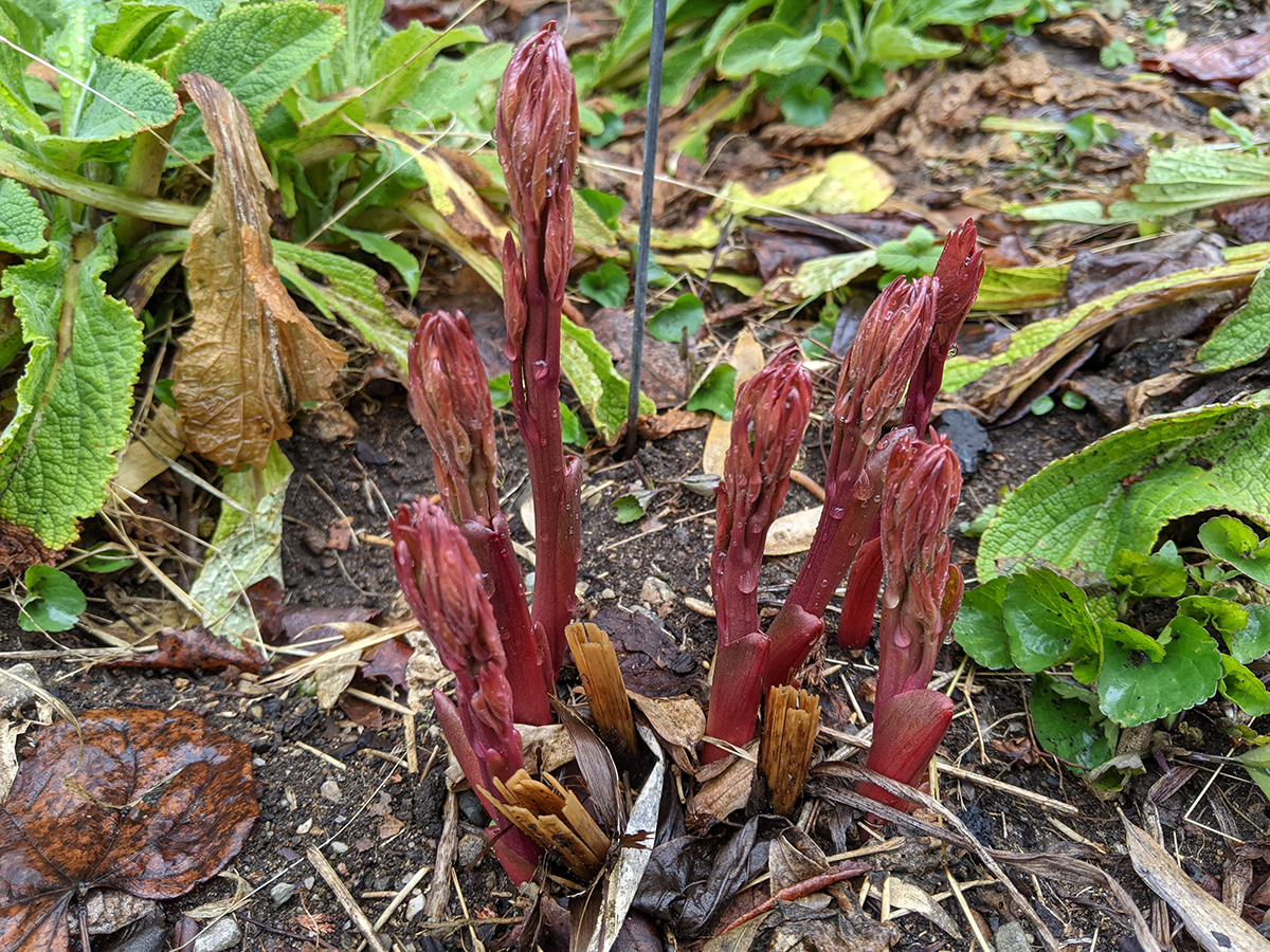 the rain seemed to have done the backyard some good, as plants looked lush. the garlic bed - still covered in some snow - looked to be in good shape, strong looking stalks of garlic. more lettuce seedlings have emerged under the row cover. lupines continue to develop, and the tiny seedlings i transplanted on monday all survived and seemed to be doing well. the quince bush didn't look to have lost a single petal in the storm. peonies continue to emerge from the ground. the grass seeds i sowed nearly 3 weeks ago have also finally germinated.