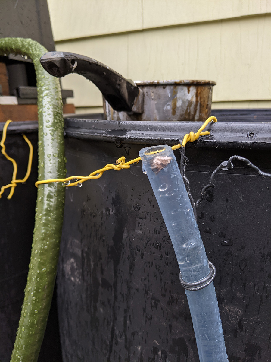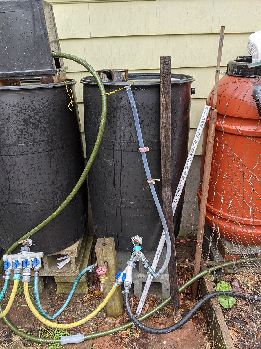 all the rain barrels were full from the nearly 2" of rain we've had since thursday evening. it was a long duration event, which is perfect for slowly filling up the barrels. my father also showed me the new barrel he attached to the front of the house, using the 4-way manifold that arrived on thursday.