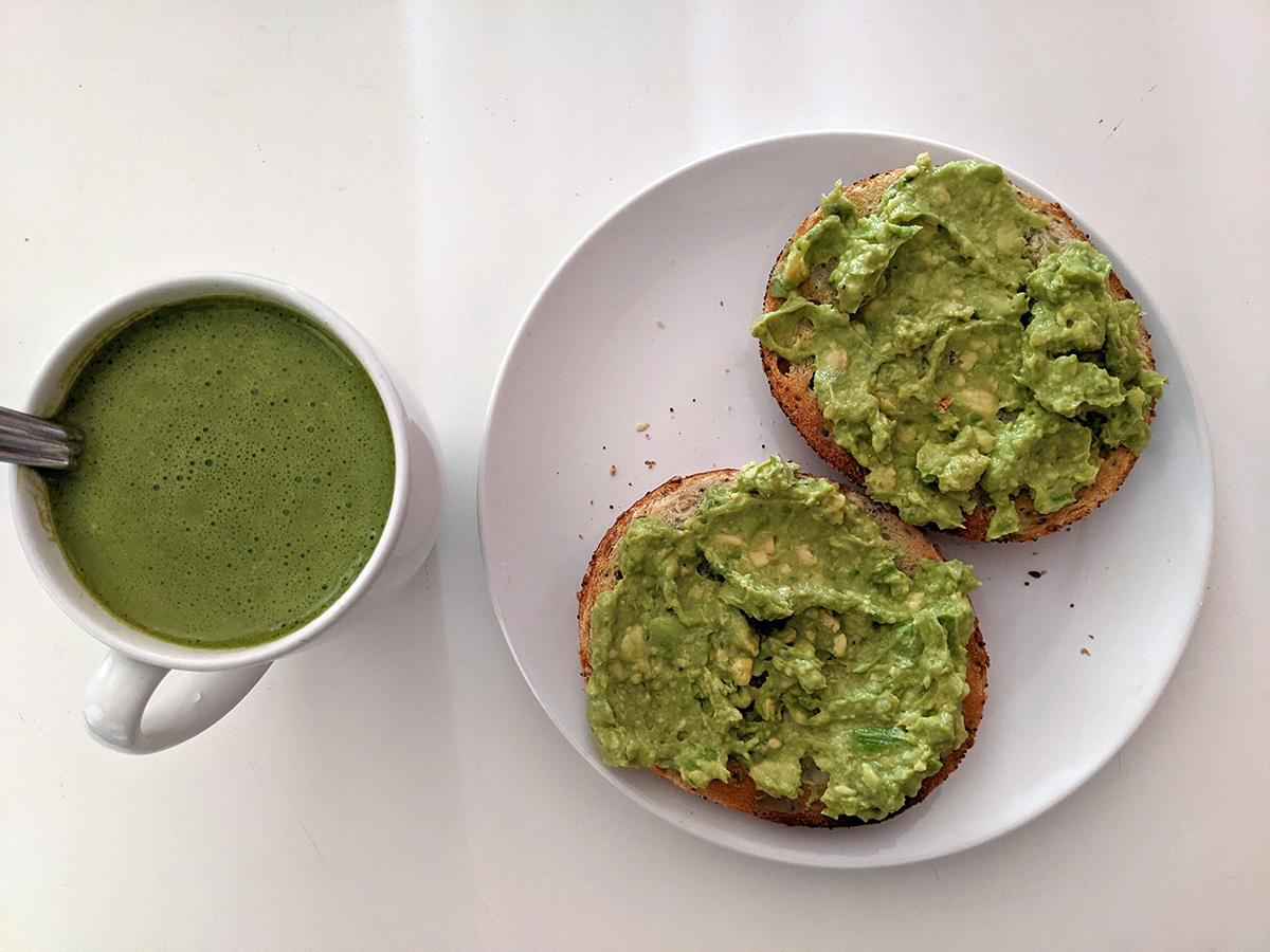 i had a very healthy lunch: matcha latte with fresh guacamole on toasted everything bagel. i had one last avocado in the fridge in had to use it, and the bagel was from a package of frozen ones my mother gave me last week.