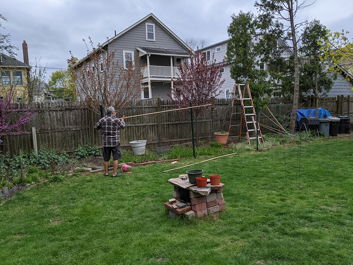 my father and i went out into the backyard in the late afternoon. we were trying to figure out how much to expand the southern garden bed so we can grow beans and bitter melons. but then i figured out instead of expanding, we could just push in about 8 inches and grow in the existing bed. we hammered down 3 u-posts and my father tied up some bamboo poles.