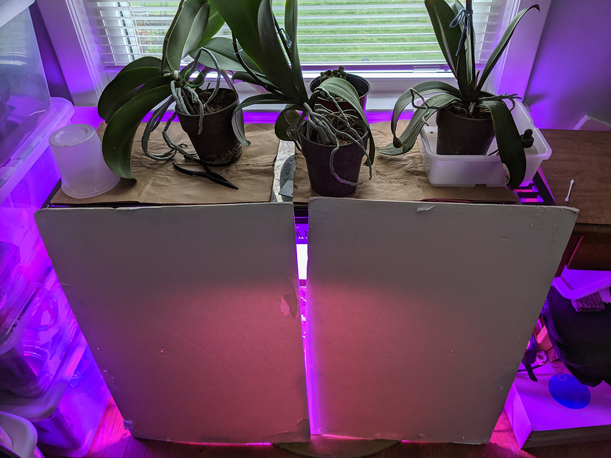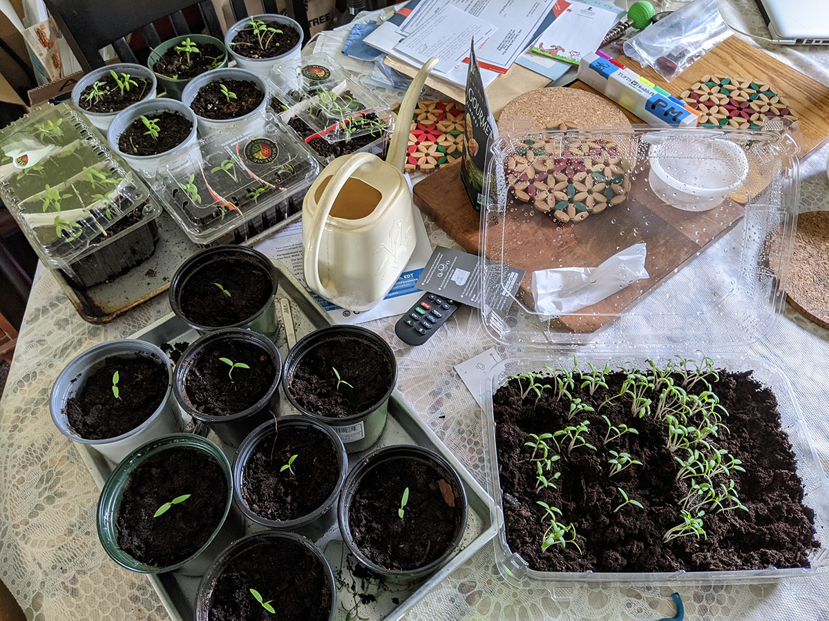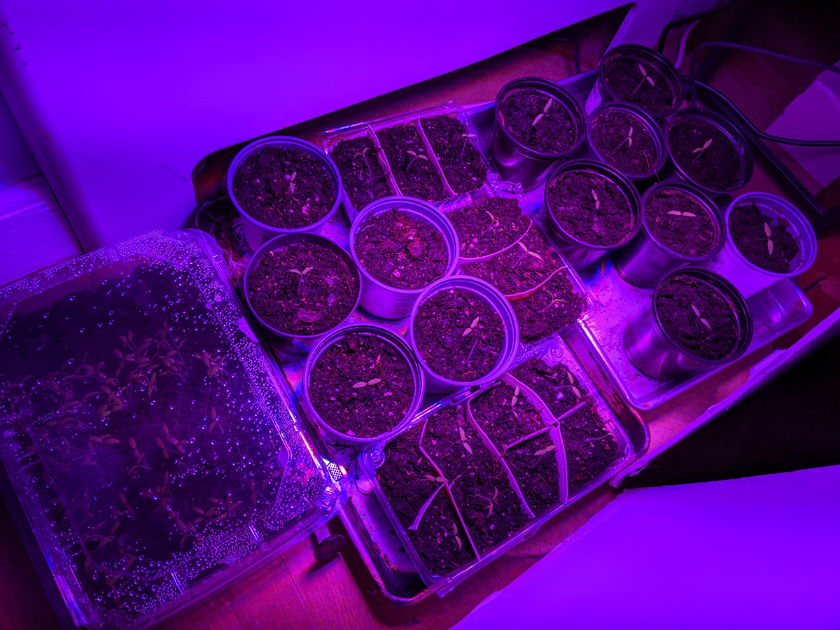 later my father moved all the tomato seedlings to a makeshift plurple grow light stand in the bedroom. just for a few days, before the weather gets warm enough that he can either put the seedlings in the sunroom or outside.