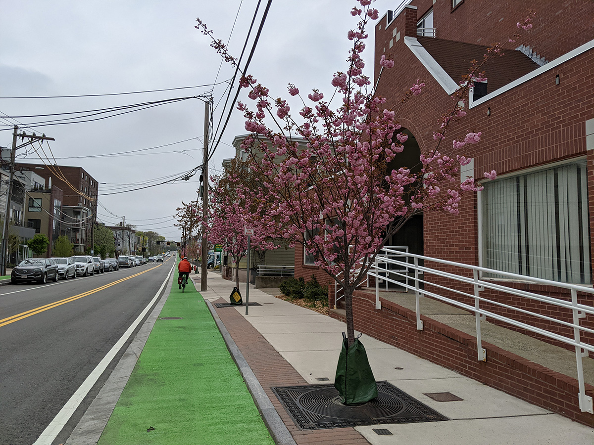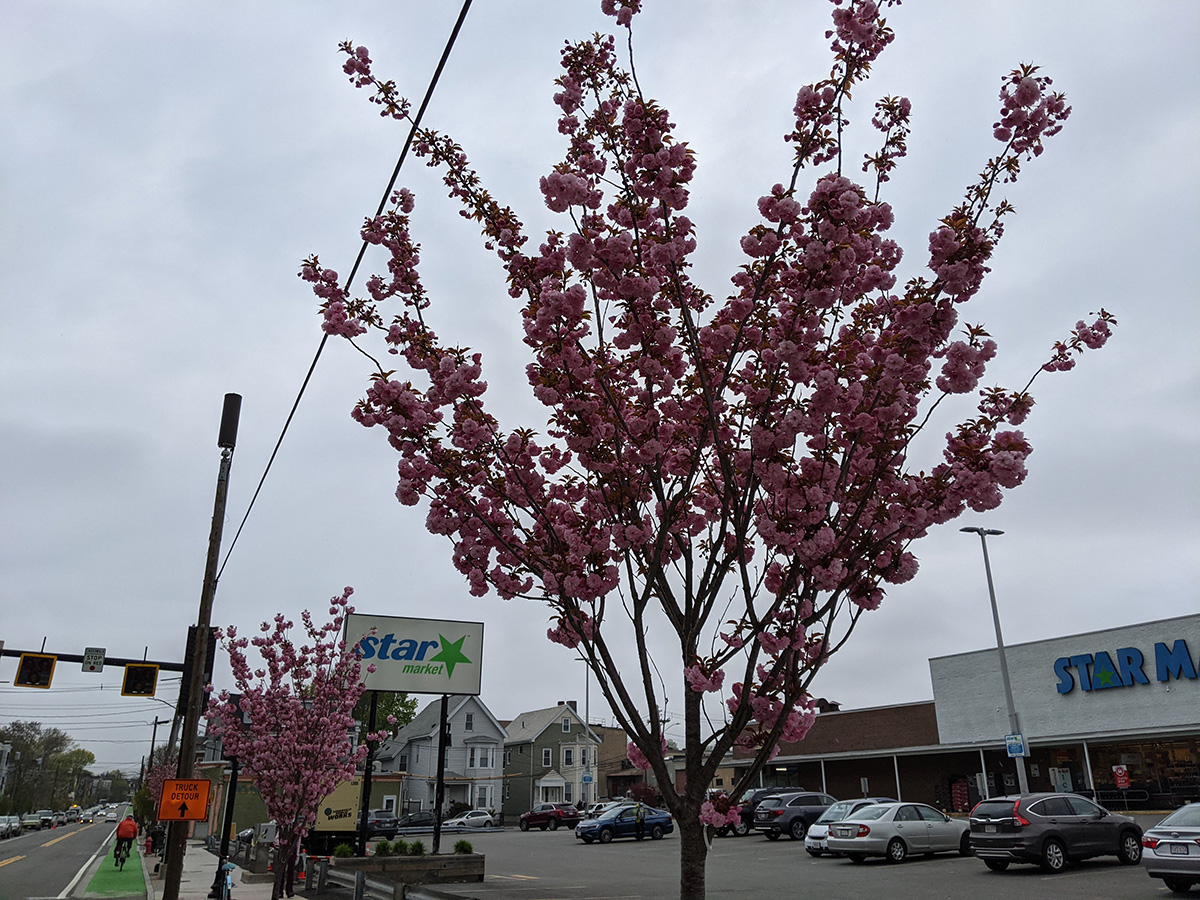 it started to drizzle while i was riding home. that didn't stop me from admiring all the flowering kwanzan cherry trees i passed along the way, one hand on the handlebar, one hand snapping photos with my camera phone.