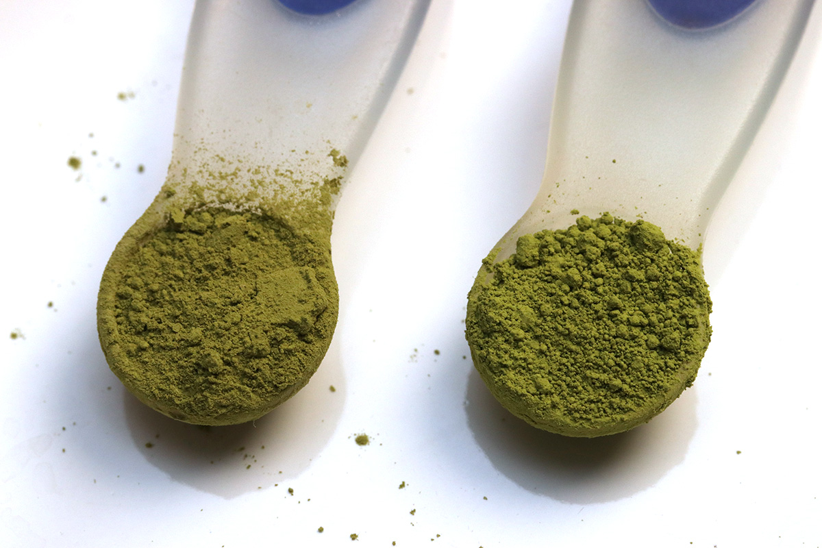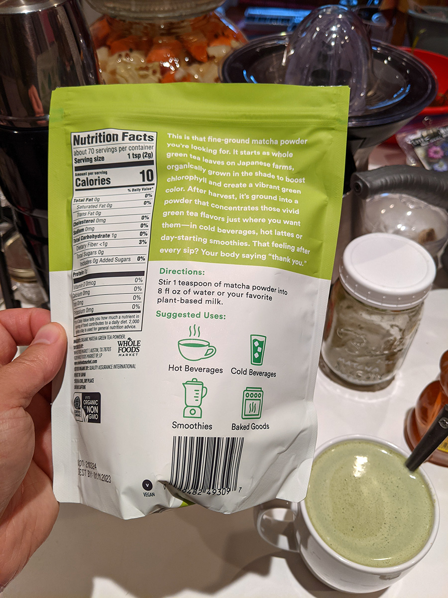 matcha is expensive, but at $3/ounce, the whole foods 365 brand is one of the cheapest i've seen (for culinary grade). having said that though, when i casually went on amazon to look up matcha again, suddenly i started finding organic pure matcha powder as low as $1/ounce. did amazon and whole foods scam me into buying their more expensive product? only difference was the cheaper matcha all came from china, while the whole foods one i bought was from japan. after i finish this latest batch, i might try the cheaper one to see if there's any difference. i scooped out a teaspoon of old and new matcha and compared the two. the old matcha - kiss me organics ($3.75/ounce) - was a little bit darker, but i think that's just because of oxidization. i expect the 365 matcha to turn darker over time as well.