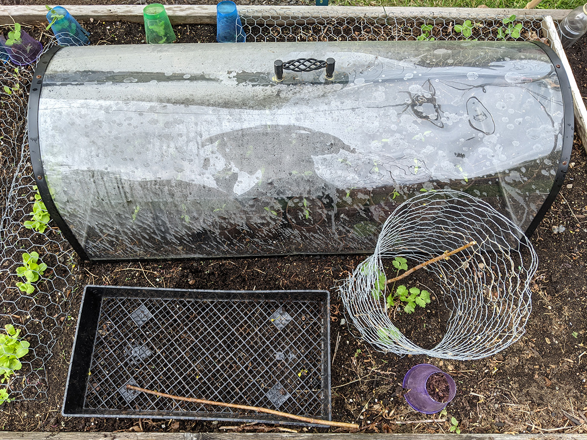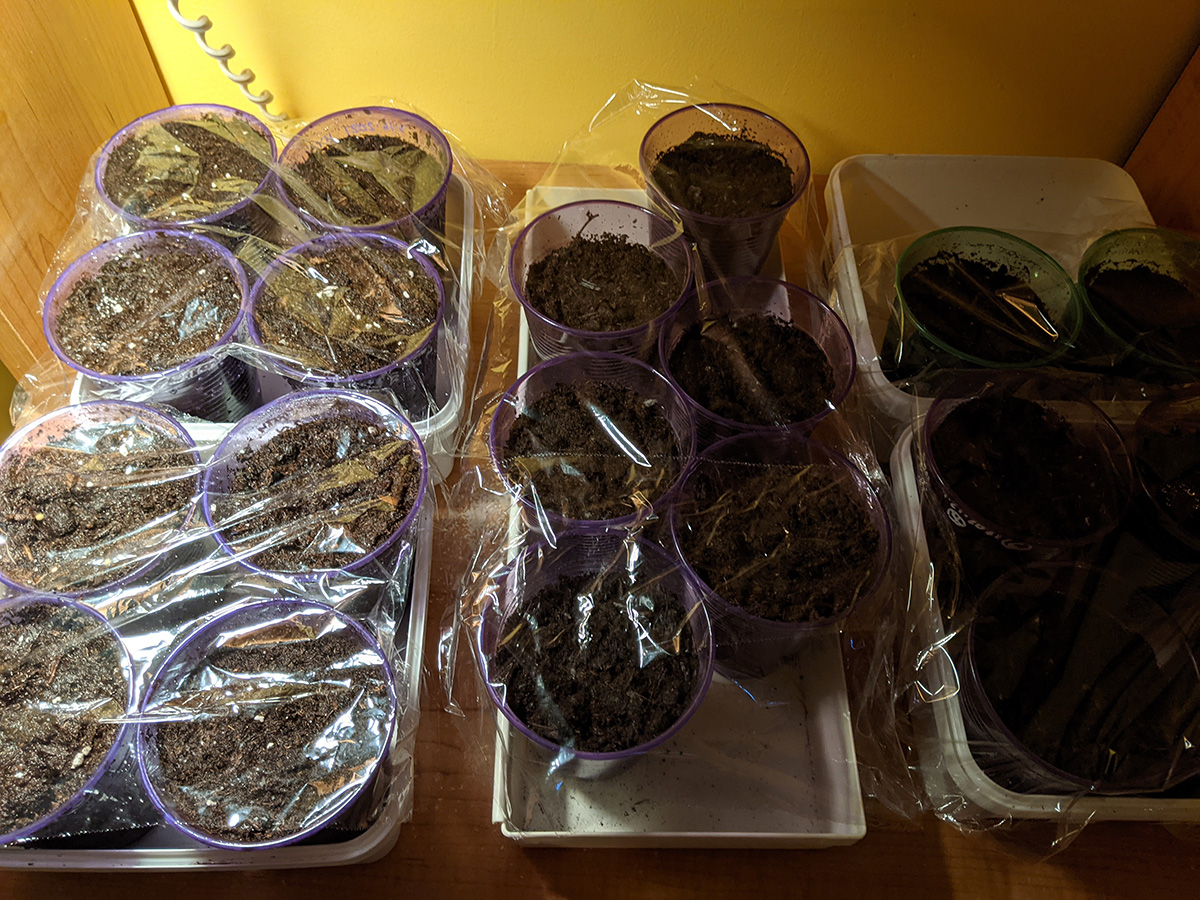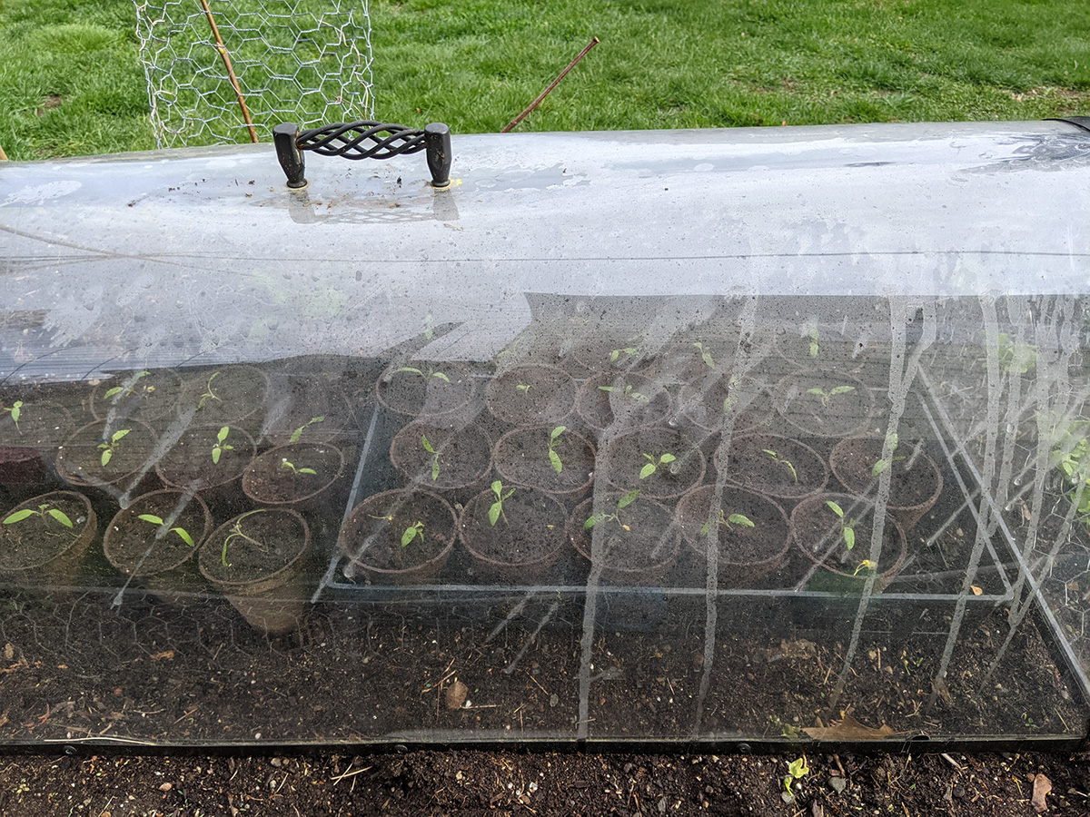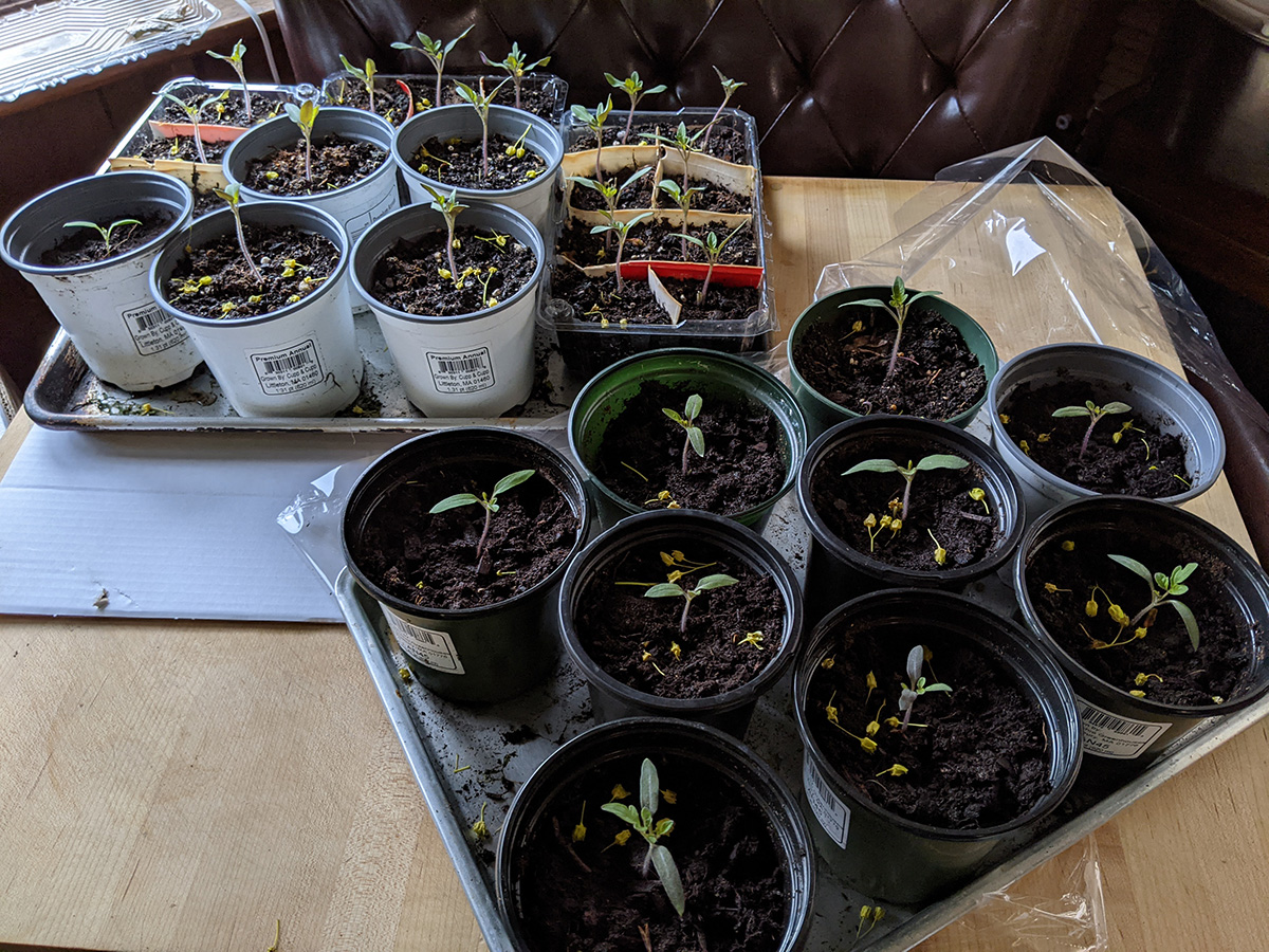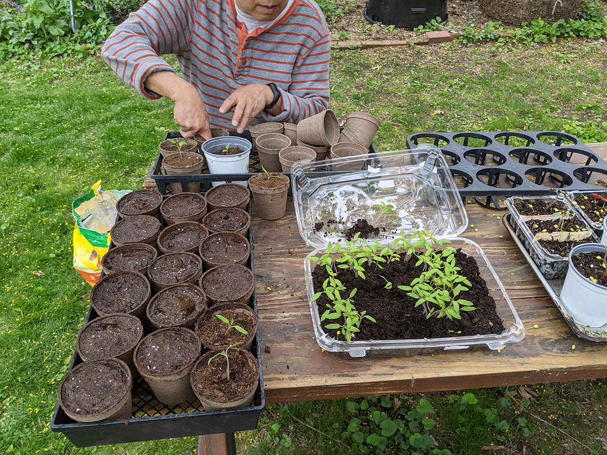 we came back around 3pm. in the backyard we started filling the peat jiffy pots (30) with potting soil, then planting a wild cherry tomato seedlings into each one. they were kind of difficult to water, the potting soil seemed to contain some peat, which strange enough prevent the water from soaking into the soil. the jiffy pots were also dry, and we watered them with a combination of misting from the hose sprayer and soaking them in a bucket full of water. instead of raising them indoors, we put them outside underneath a row cover. once they get big enough, we'll give them away for free at the cafe.