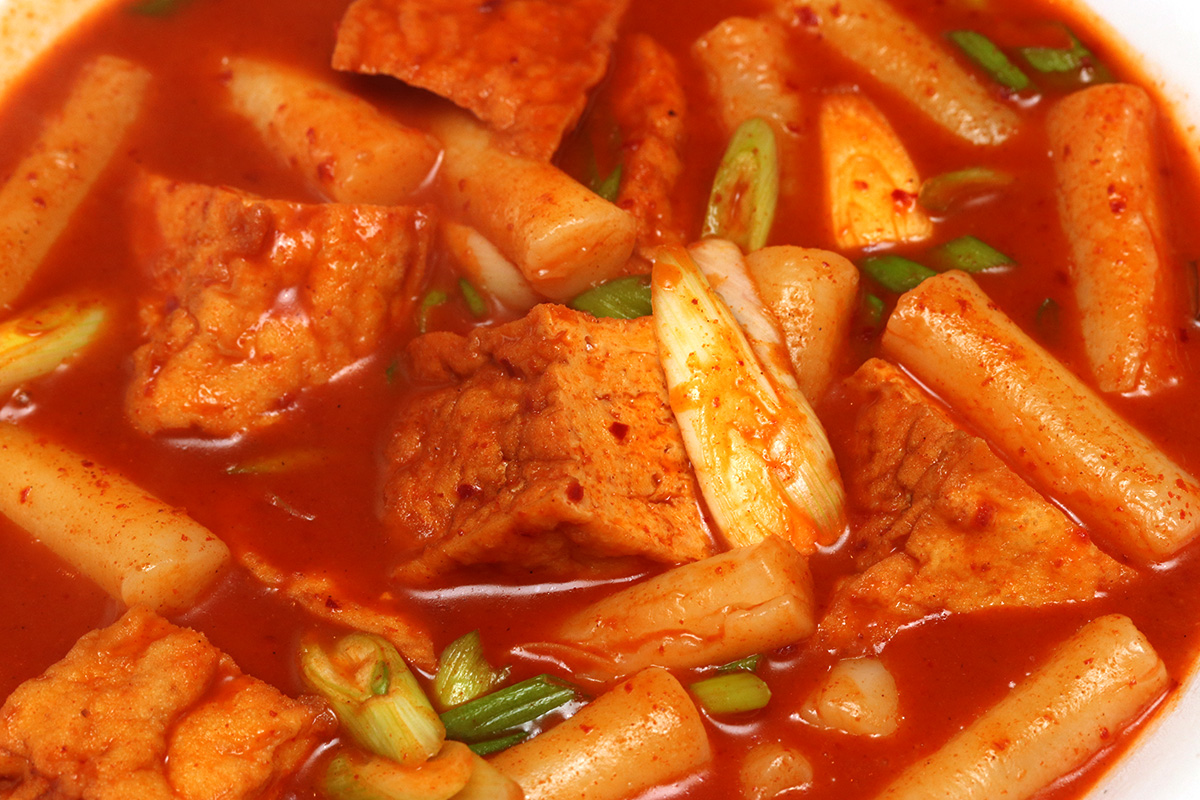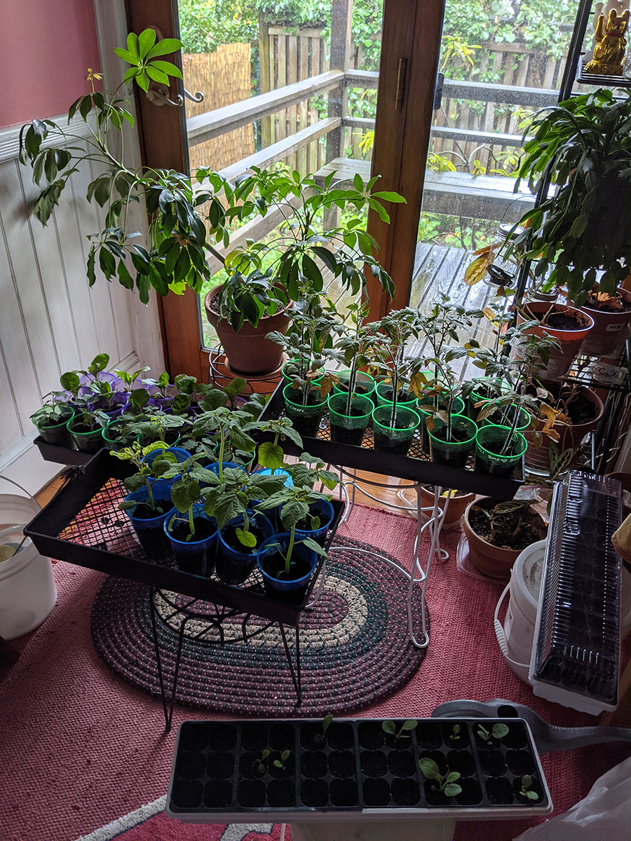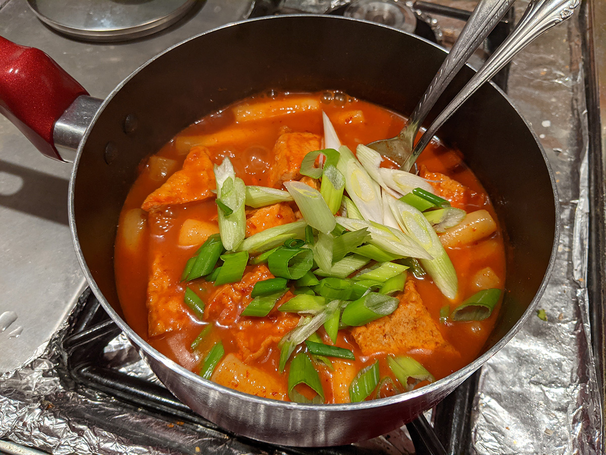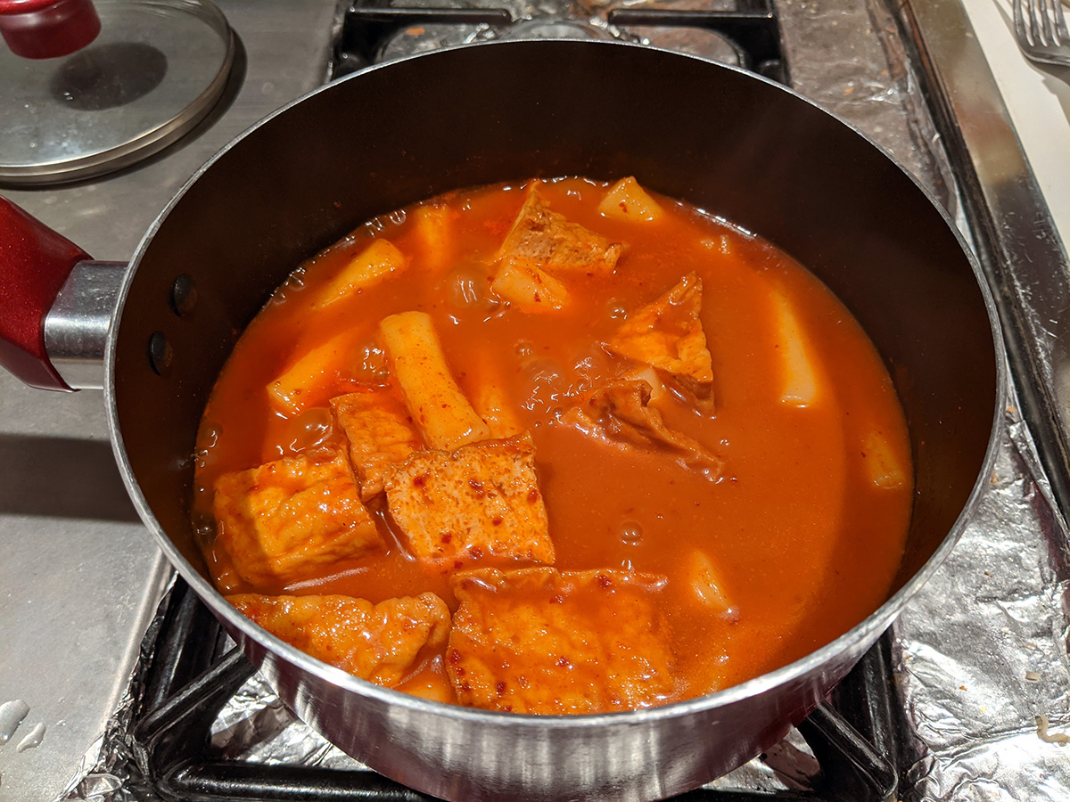 i had some leftover frozen rice cakes as well a container of leftover frozen tofu. i left them cooking in the spicy tteokbokki sauce while i took care of the grow closet, watering some gravel trays as well as potted seedlings.
