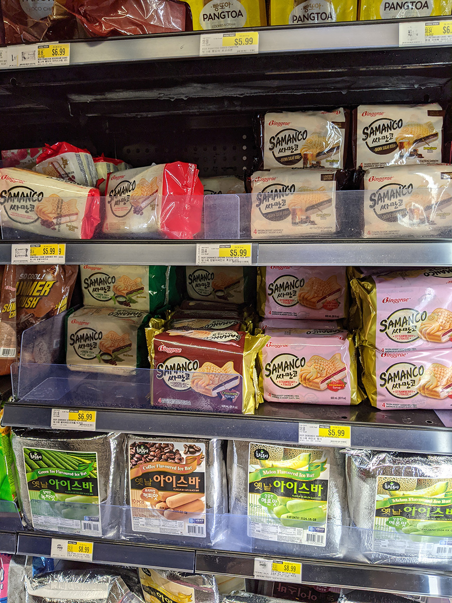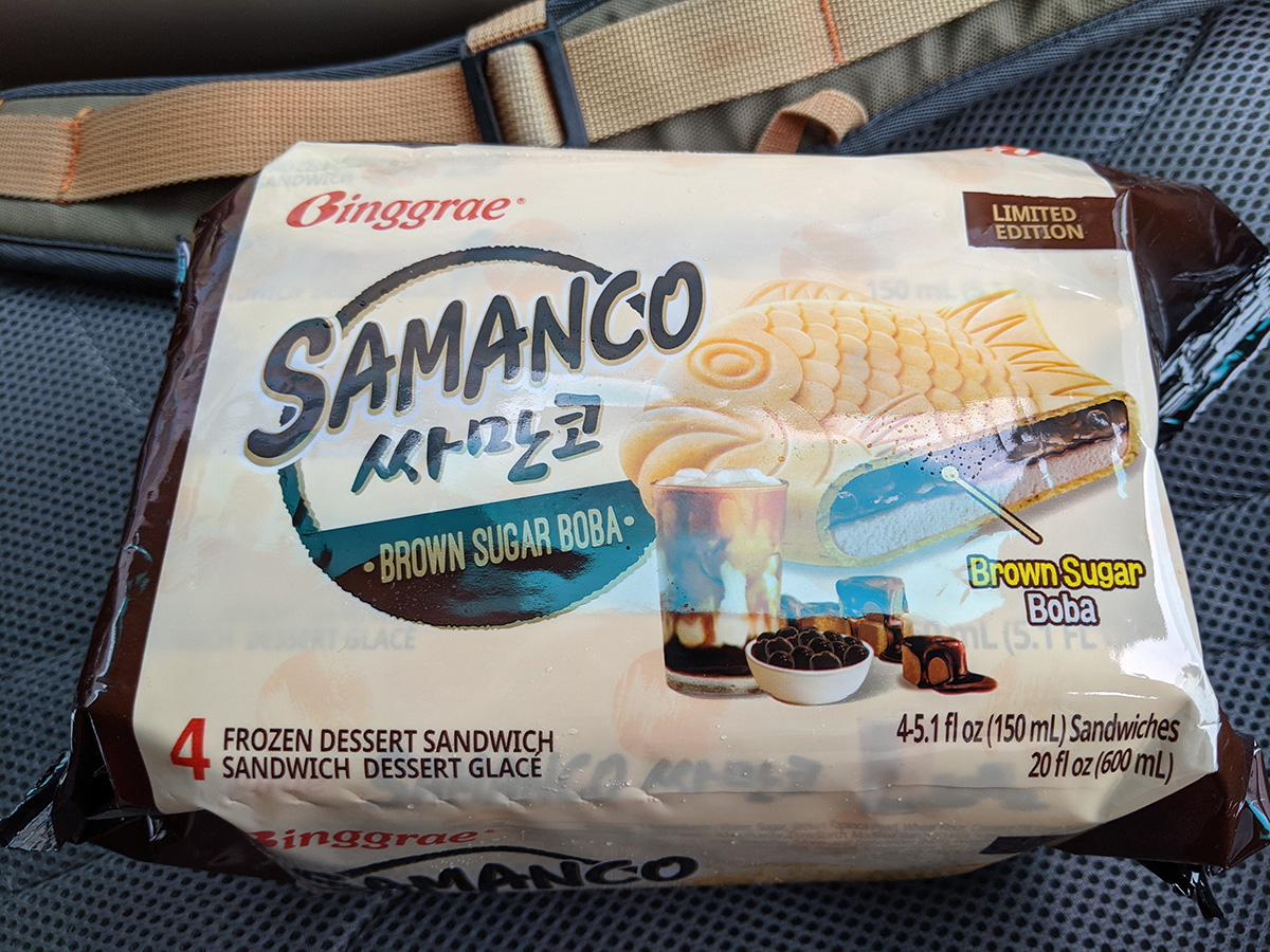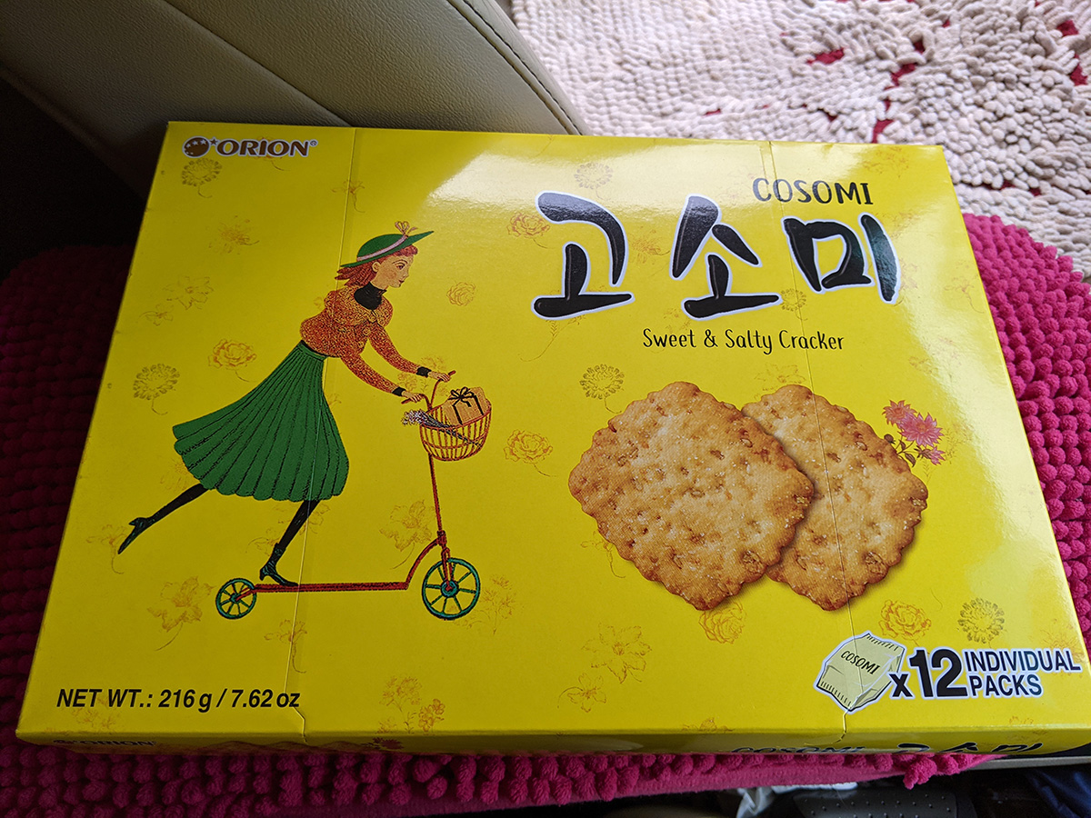 by then the rain had stopped. my sister drove me to h-mart. while she sat in the car, i went in to get some fish ice cream sandwiches (brown sugar boba flavor), and some crackers that my sister wanted. she described it as "yellow, with a picture of a girl on a bicycle" but i couldn't find anything that matched the description. i ended up calling her to ask if it was in a bag or a box, she walked me through the store to tell me where to find it, turns out i was standing right in front of it, though somebody had flipped the box over so i didn't see the bicycling girl (actually she's on a scooter).