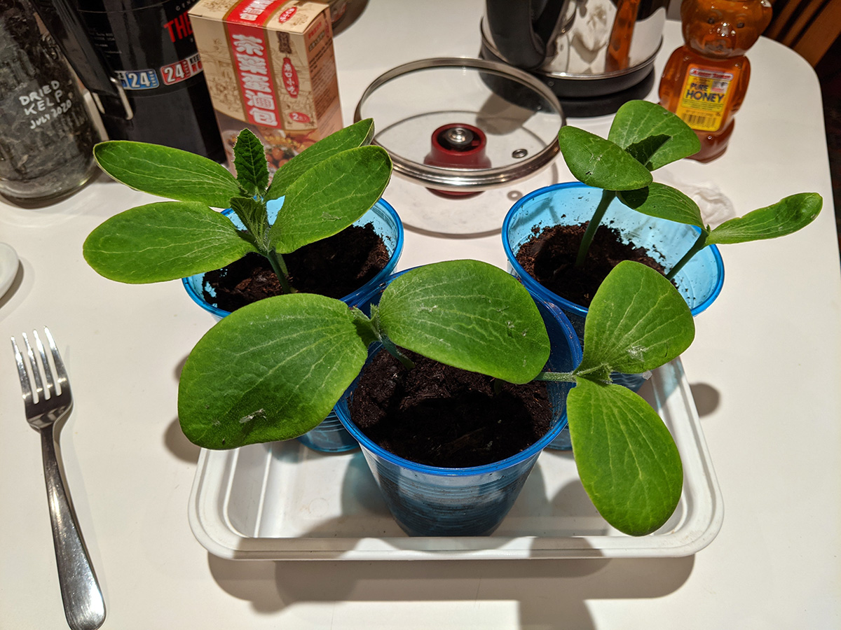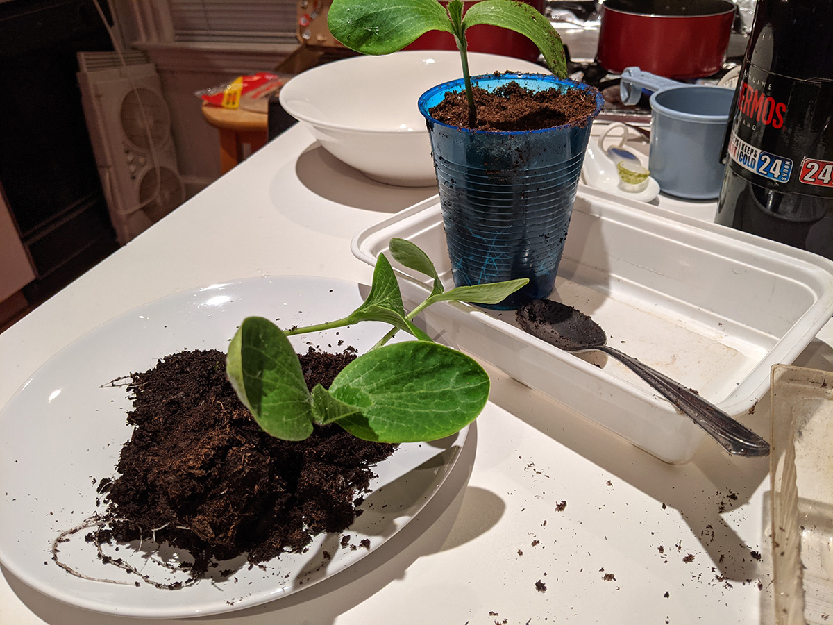 i started making dinner around 8pm, some korean rice cakes. first step was to make the seaweed broth, which requires 15 minutes of simmering. while i waited, i split apart 3 potted buttercup squashes that had double seedlings. i should've done this a long time ago, but only got more potting soil yesterday. the seedlings that i removed might not too well since the roots were damaged during the removal, but if they surprise we'll have some bonus squashes.