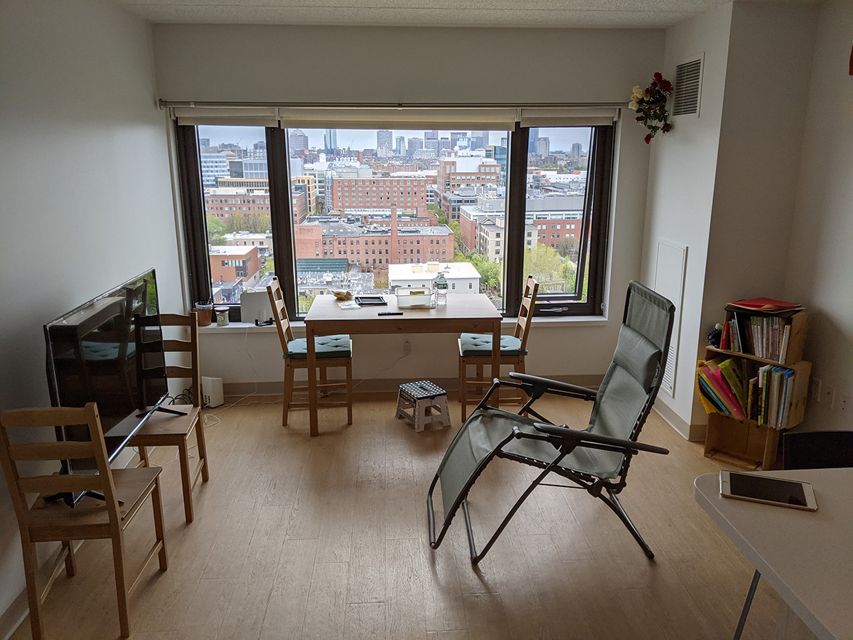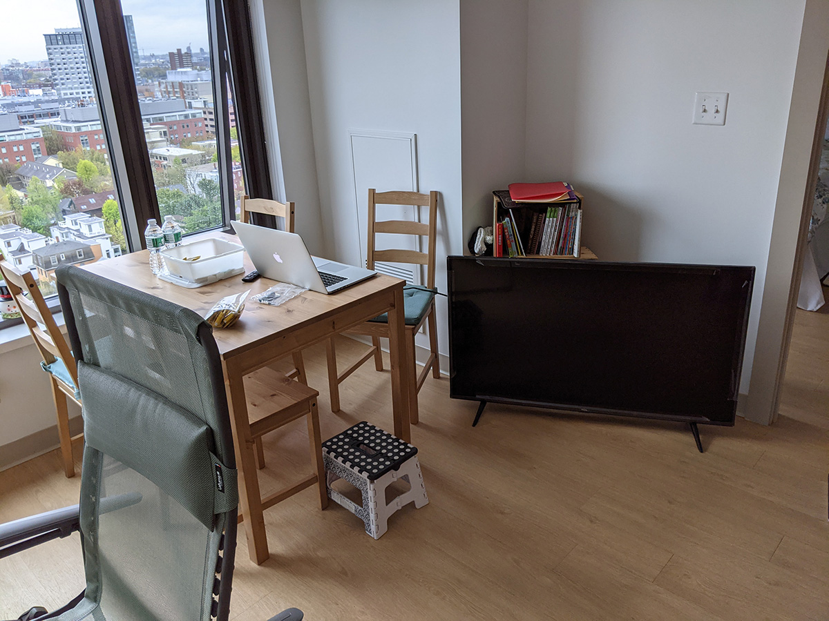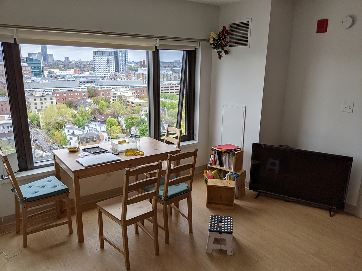 my sister and i rearranged some of her godmother's living room furniture. with the dining table and the HDTV, and a tv stand followed by a future sofa, there wasn't enough space for all the furnitures. the table by the window is a nice place to eat or work on the computer, with a great view of boston. we tried putting the HDTV by the wall near the bedroom where there's an existing alcove space, but the HDTV was too wide for that area, the only way would be to put it on a slant. we ended up moving the table so the long side was up against the window, and taking two chairs and turning them into a makeshift HDTV stand. it didn't seem like we were there for very long, but we didn't leave until 2pm.
