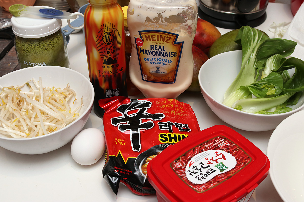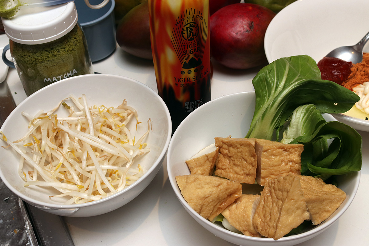 i didn't start making dinner until 9:30pm. once again i was having luxury korean ramen. i had some baby bokchoi and bean sprouts that my mother gave me earlier, and i also added some tofu wedges this time. depending on whether or not you count an egg as meat, i inadvertently made myself a big bowl of vegetarian ramen. i tried one of the tiger sugar drinks (2/$5); it tasted just like milk tea, nothing particularly special about it other than the brand.