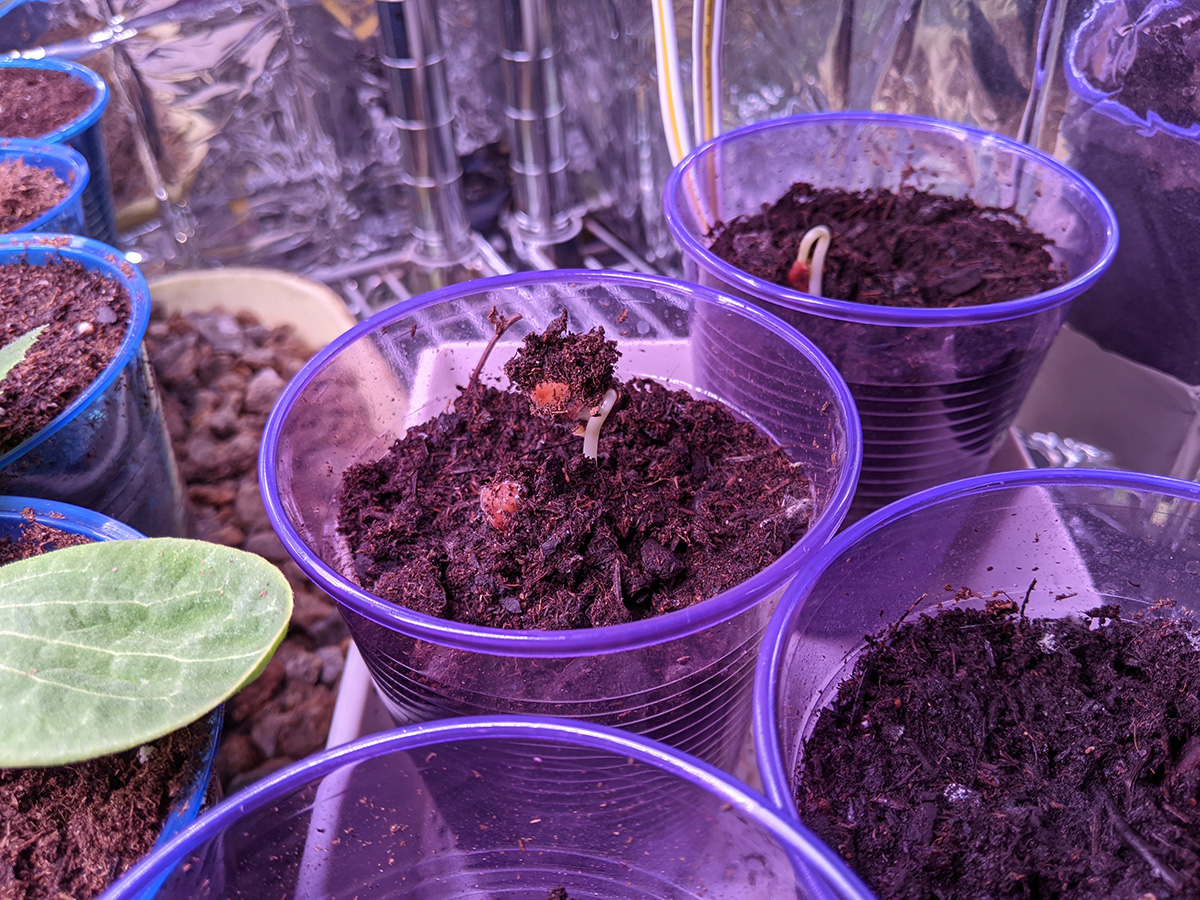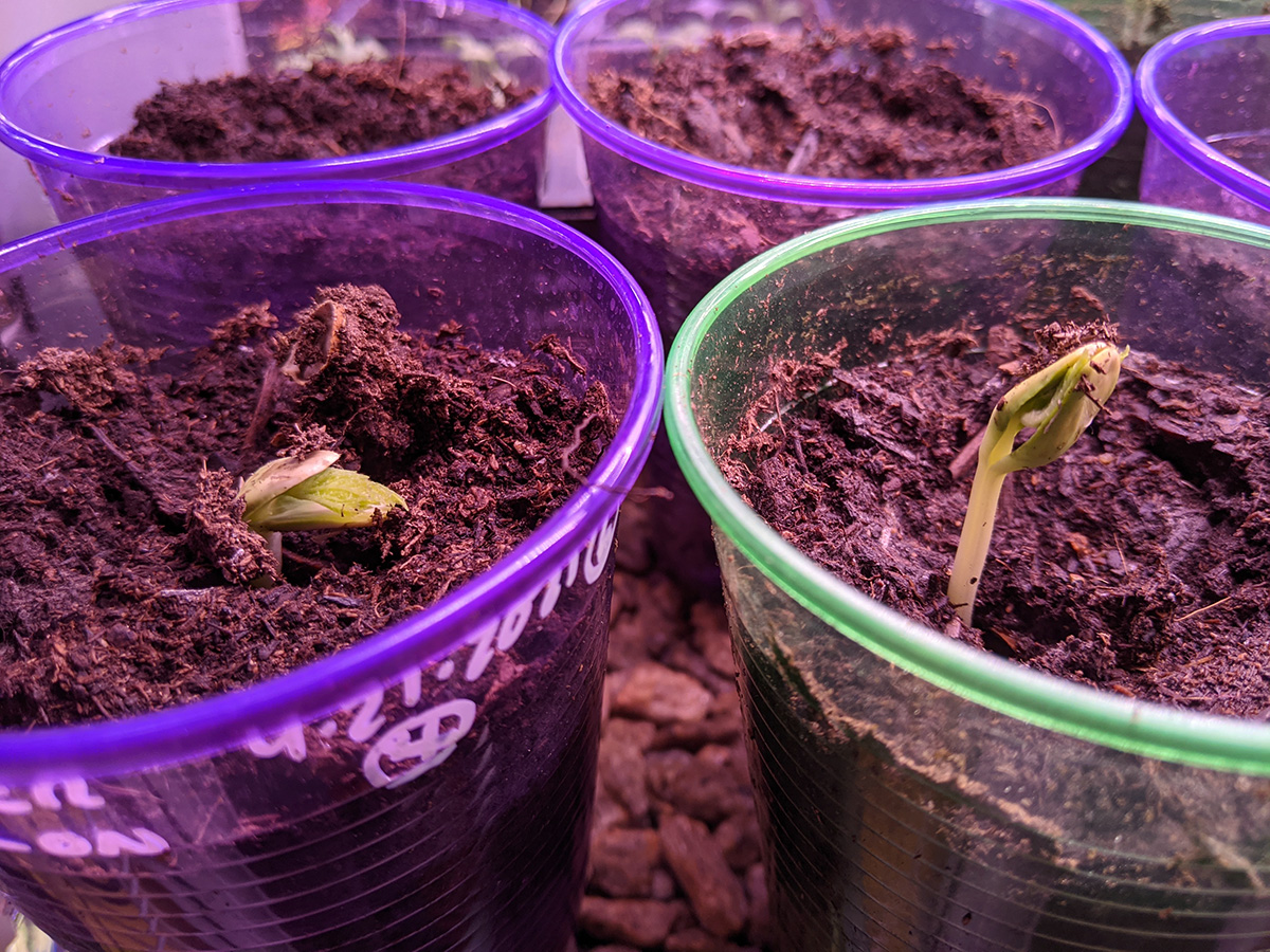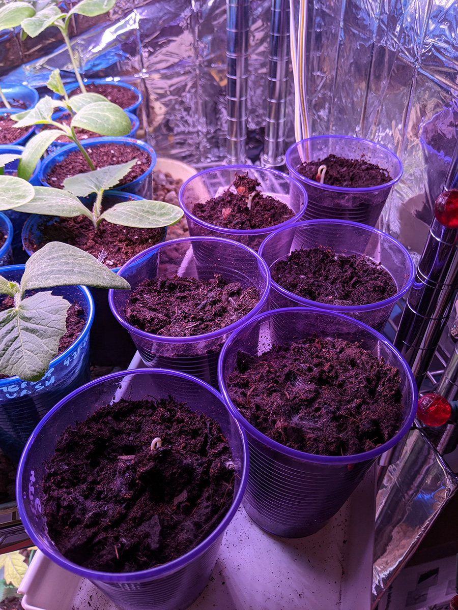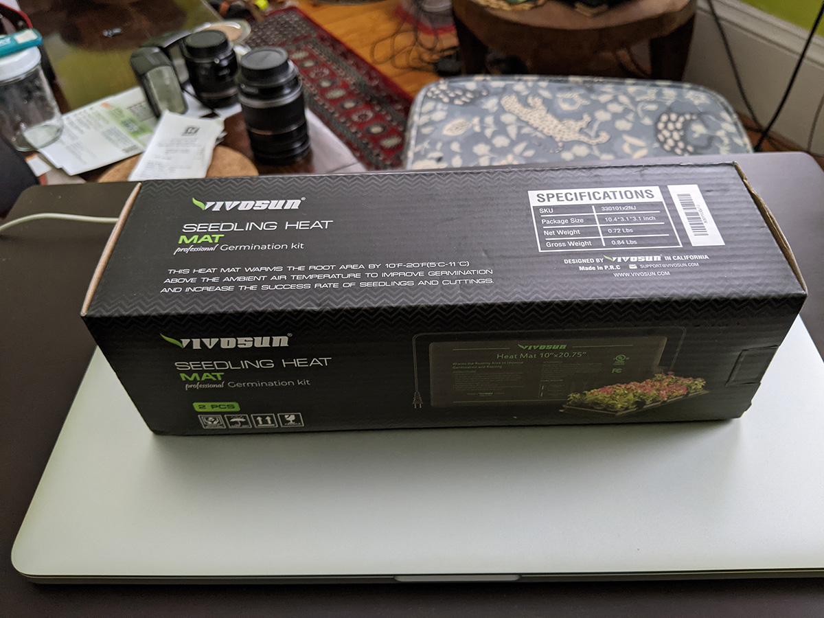 i returned home by 4:45pm. i thought about going to the community garden to water my plants, but it was getting colder (temperature dropping down to the lower 50's) and i'd been cycling all day, it was time for a rest. waiting on my doorstep was the pair of vivosun seedling heat mats. i was going to try it out with some of my ungerminated seedlings, but when i looked in my grow closet, i was surprised to find 3 of the hyacinth beans had sprouted. i'd planted them on april 27th, and just 10 days later they germinated. compared that to my father, who's hyacinth beans are heading into the 4th week waiting to sprout. i moved the germinated beans to the lighted shelves. also a second bitter melon had sprouted.