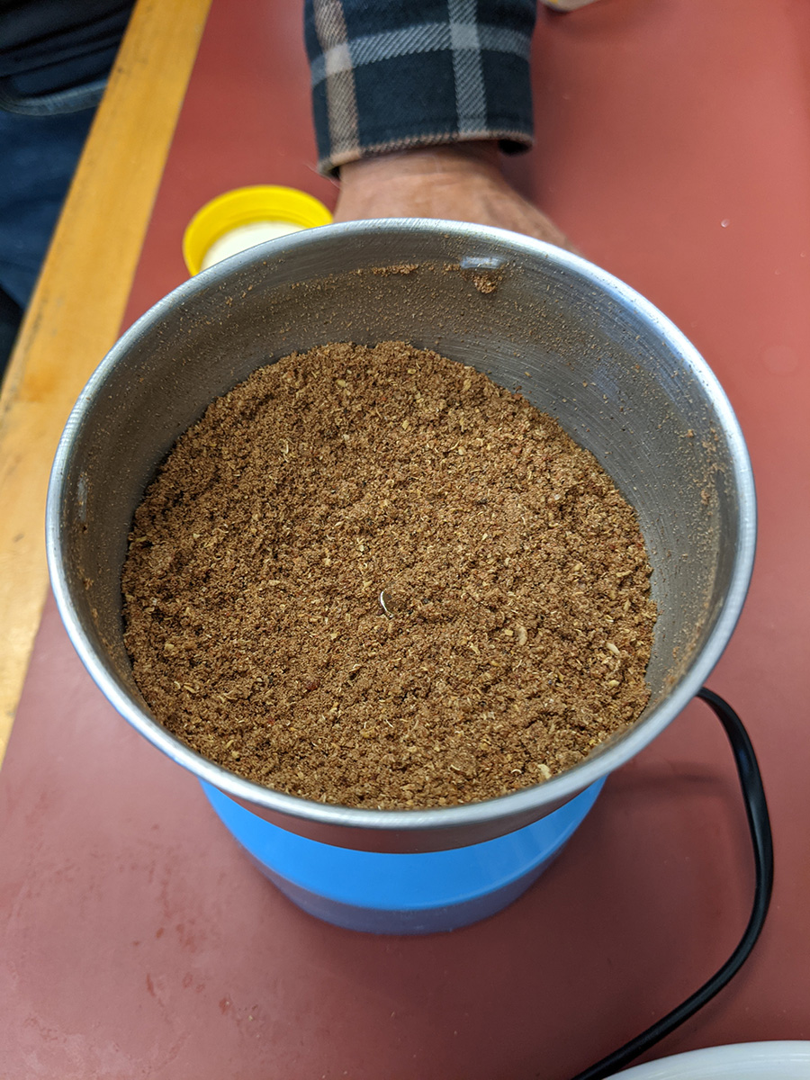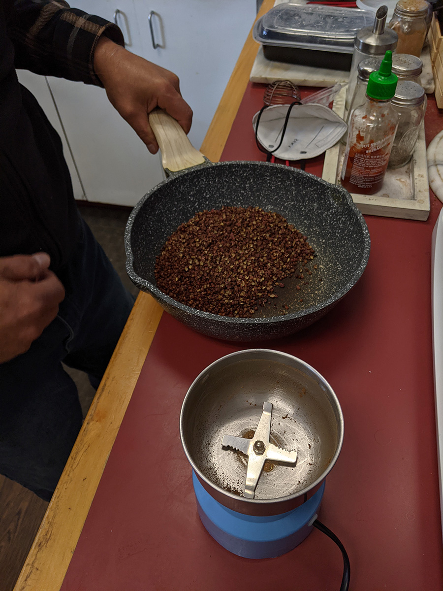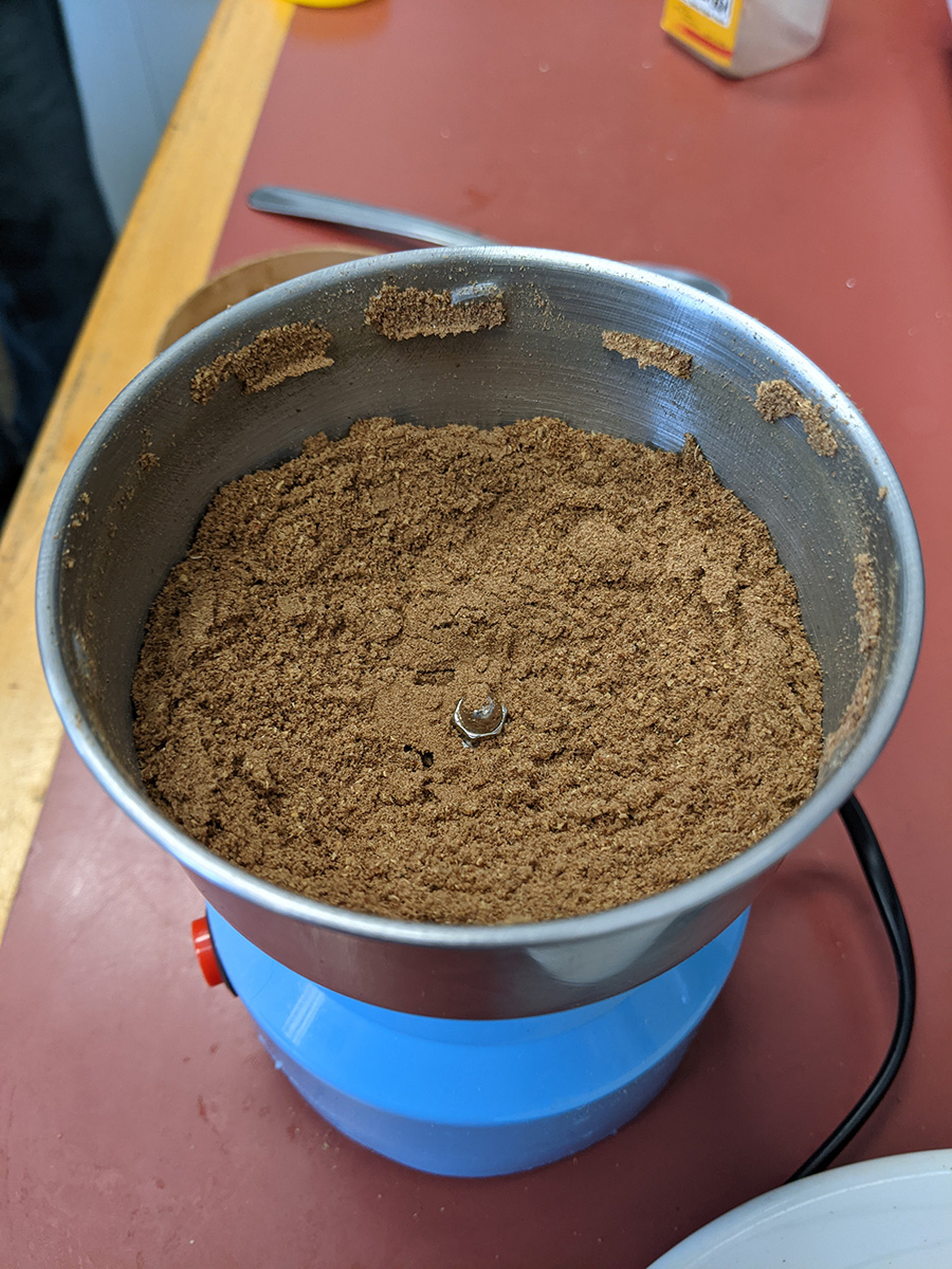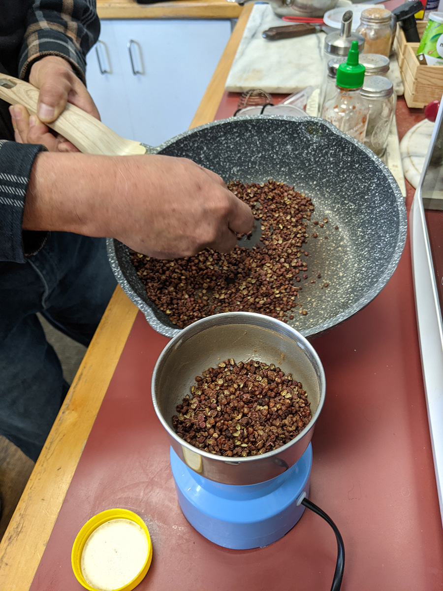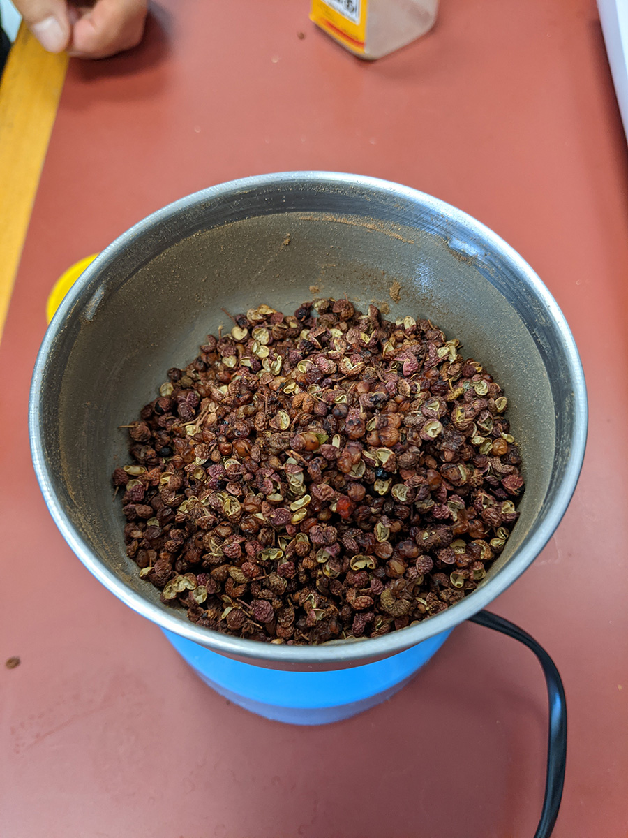 my mother also prepared the sichuan peppercorn by first roasting them in a pan before pulverizing them into a fine powder with the electric grinder. my father realized how dangerous it was after we finished grinding, because the grinder was still plugged there. there are no safety features with the grinder, had we accidentally pressed the button, it would've chopped our fingers off. the grinder is not a toy!