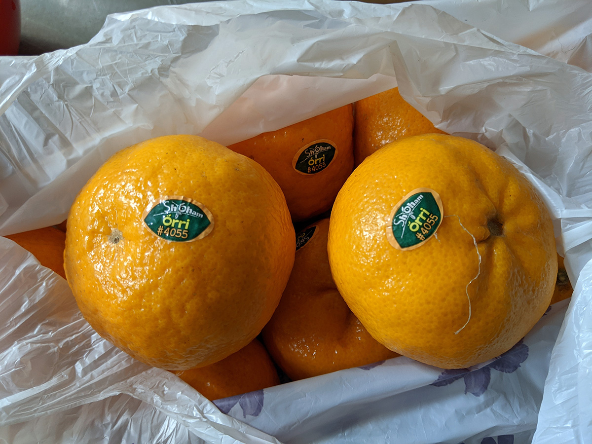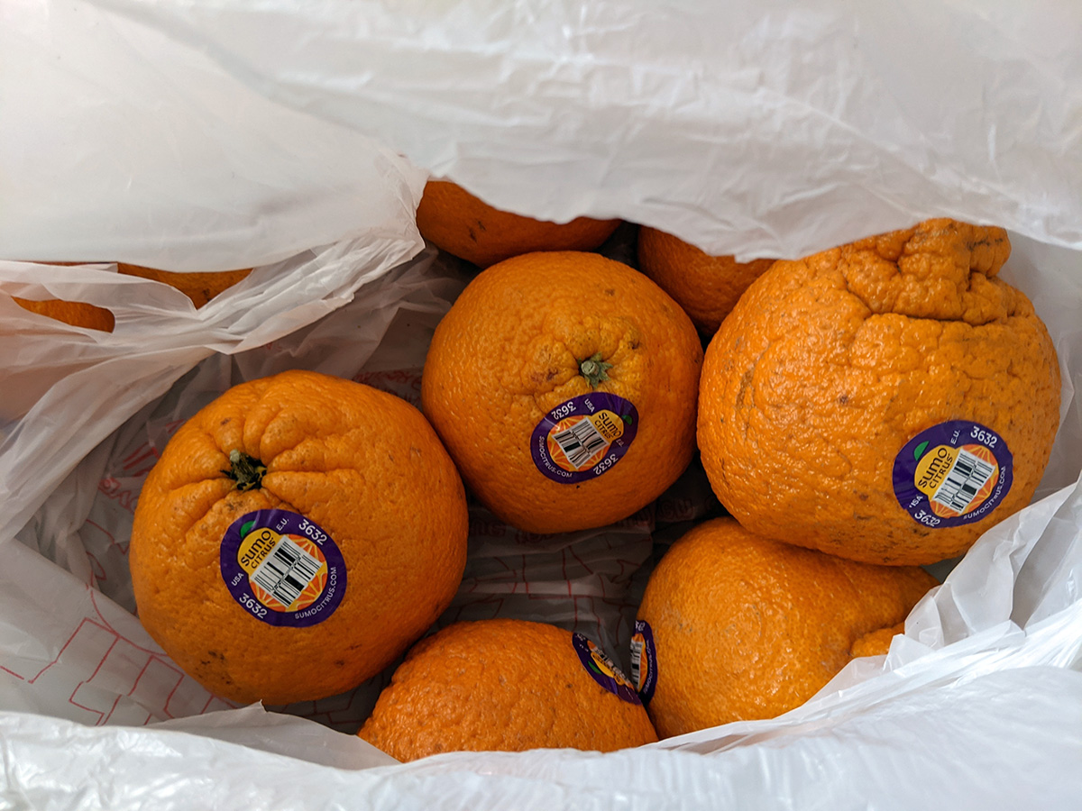 from chinatown i cut across downtown crossing and post office square to haymarket. i got there by 2:30pm. i was hoping to get more cara cara oranges, but the vendor i bought them from last week were only selling regular navel oranges, and now they were 7 for $2 (not 9 for $2 from last week). so instead of juicing oranges, i bought some peeling oranges instead. one vendor was selling "shalom" oranges for 5/$2. i asked them how they were, he said very sweet, which convinced me to get 10 instead (he gave me 11 as a bonus). i also bought from another vendor that was selling "sweet" oranges for 5/$1 (bought 10) which later i discovered were just sumo oranges.