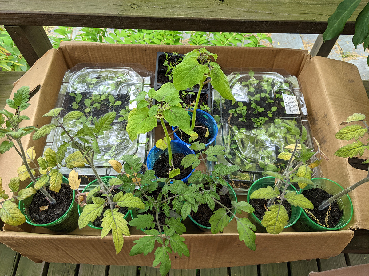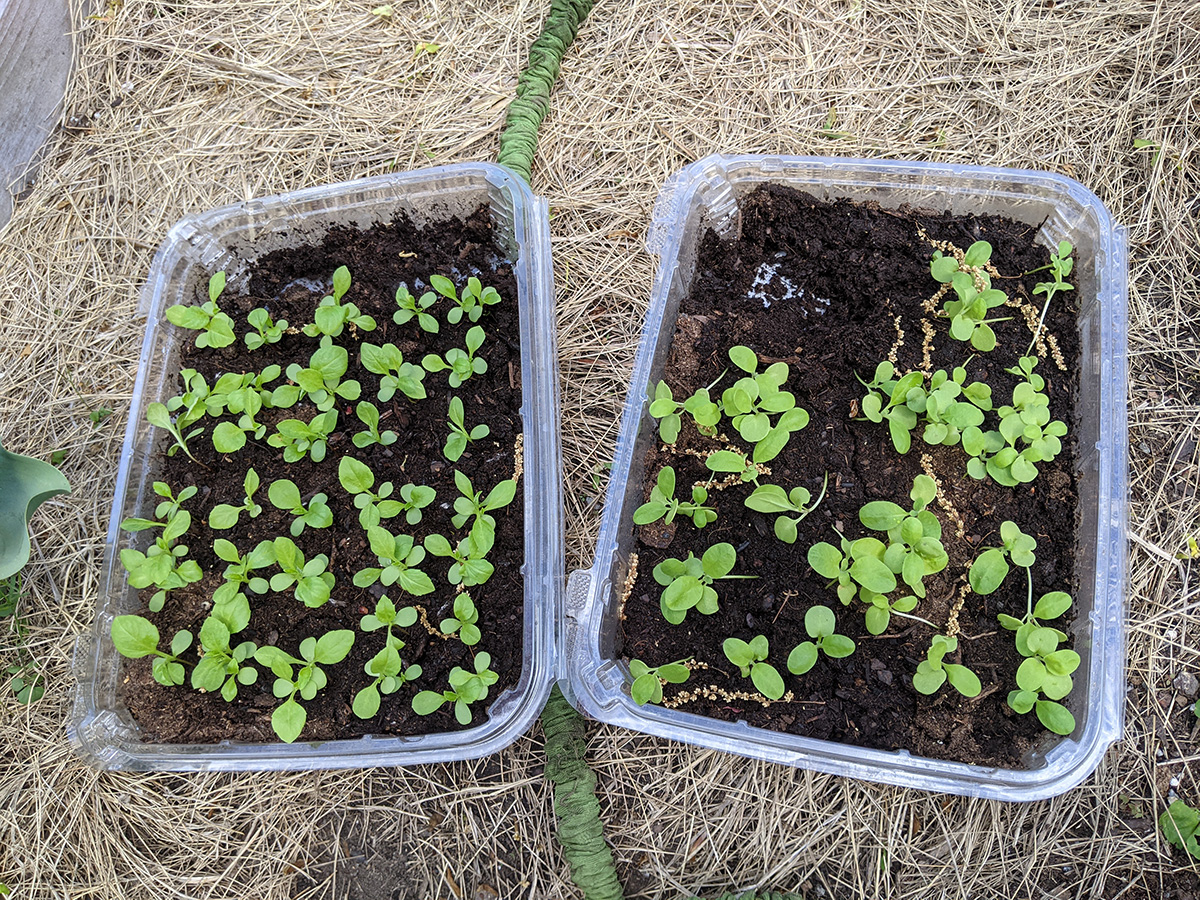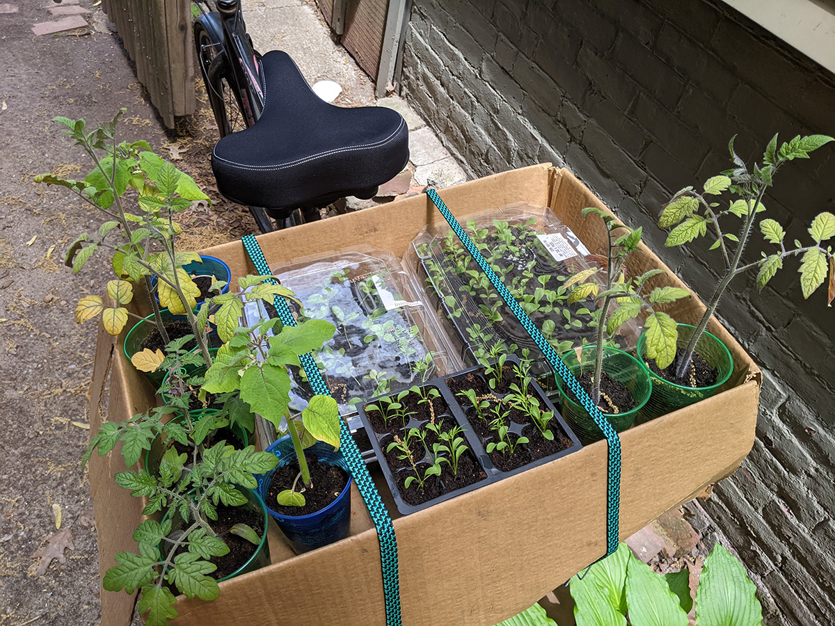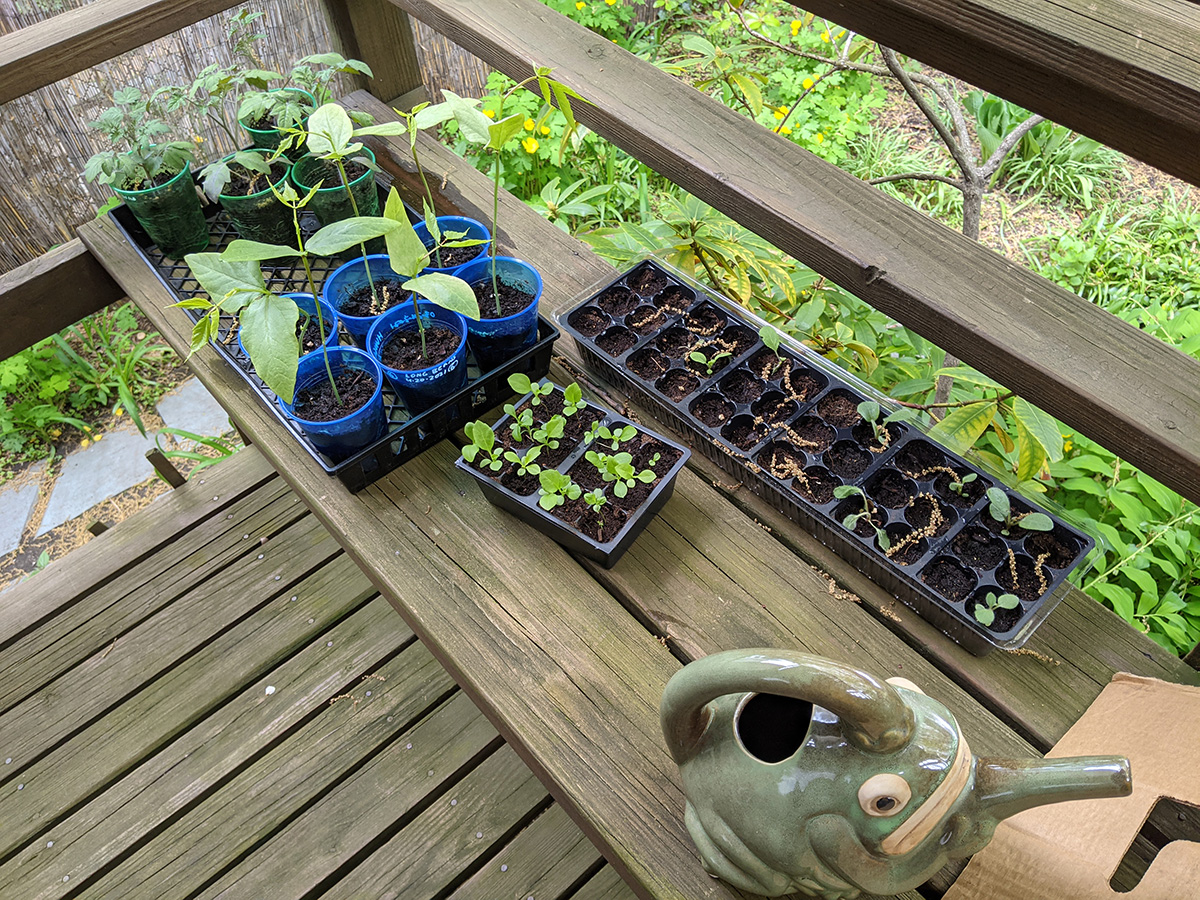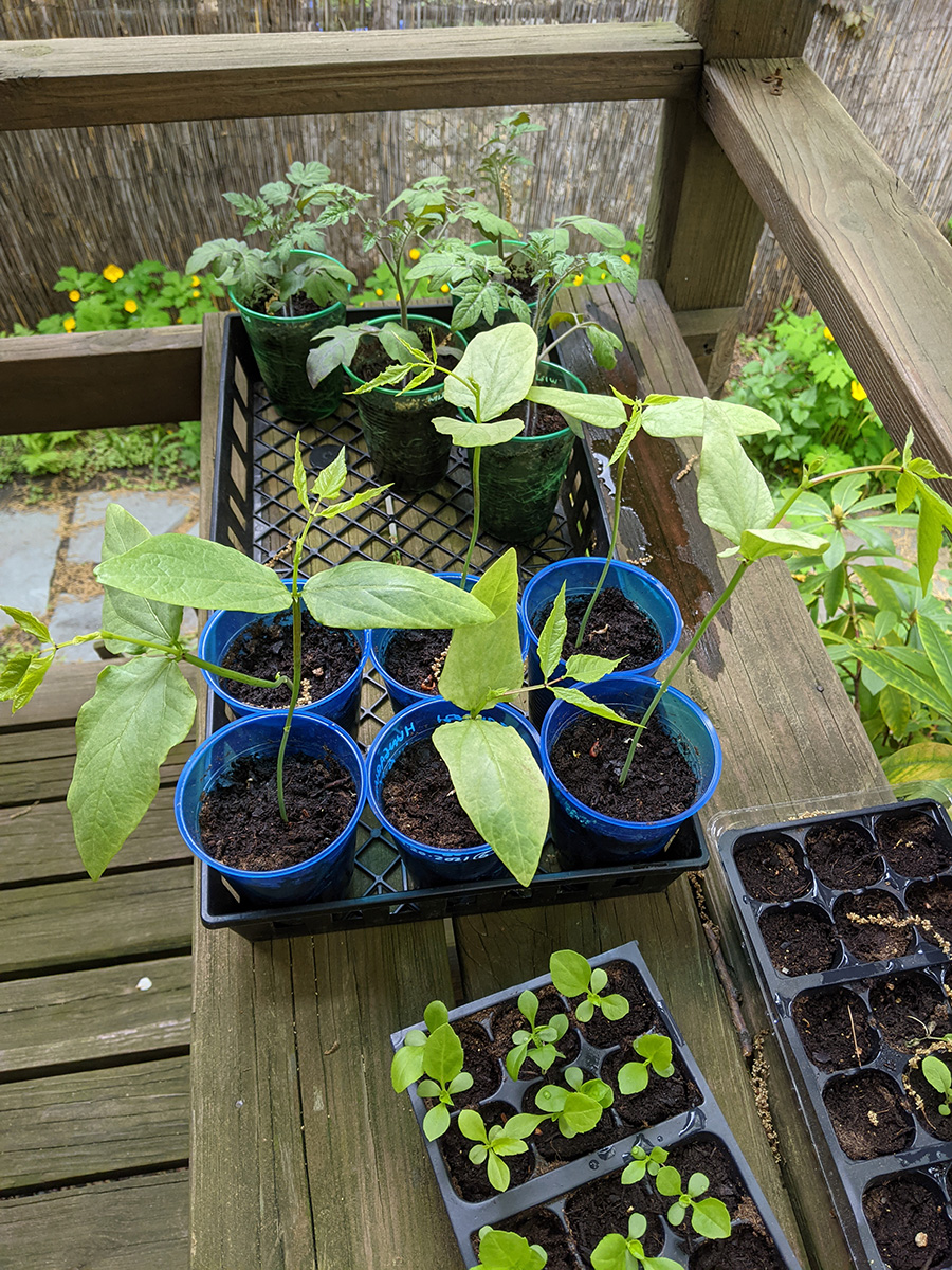 today was plant moving day for my seedlings. i've been slowly hardening up them outside on my backyard porch, and yesterday i left them outside the whole night. i've been waiting for the night time temperature to be above 50 degrees, and the long range forecast showed that was the case starting today.