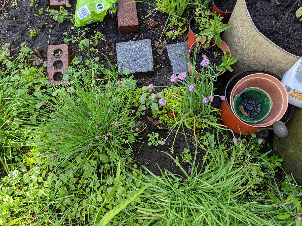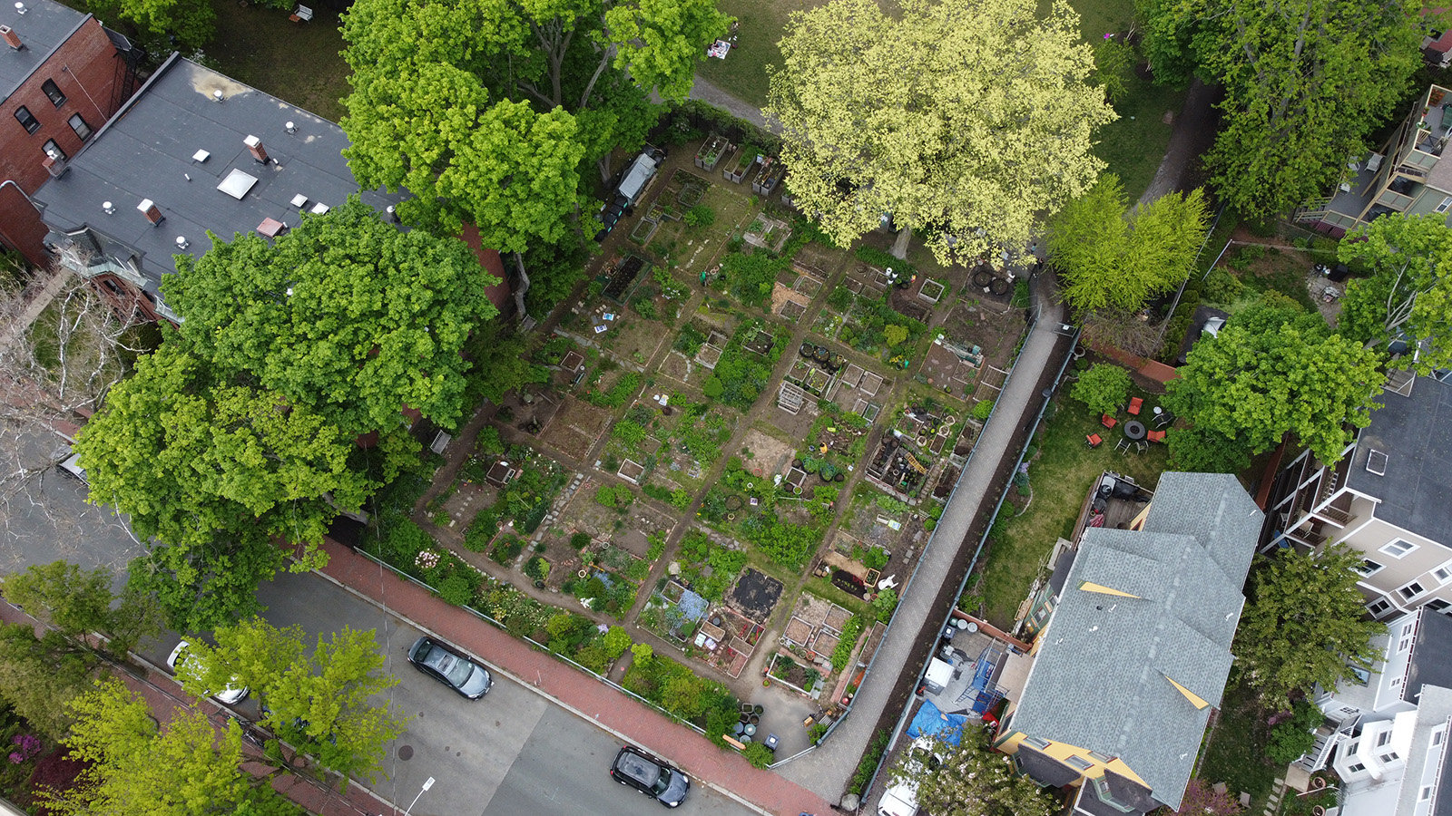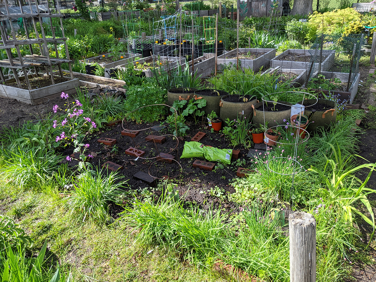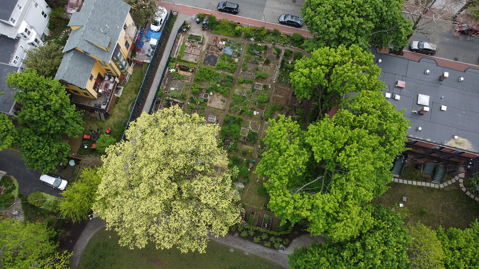 once i was alone in the garden, i quickly dug out my DJI mini 2 drone and flew it up in the air to get some photos (only to about 200ft). i was surprised the fly app didn't crash once. there were some children playing in the park behind the community garden (i didn't flip over them) but nobody seemed to notice what i was doing. i tried to do a catch landing but it jerked out of my hand so i landed in the uneven path and the right rear props hit some grass before coming to a stop.