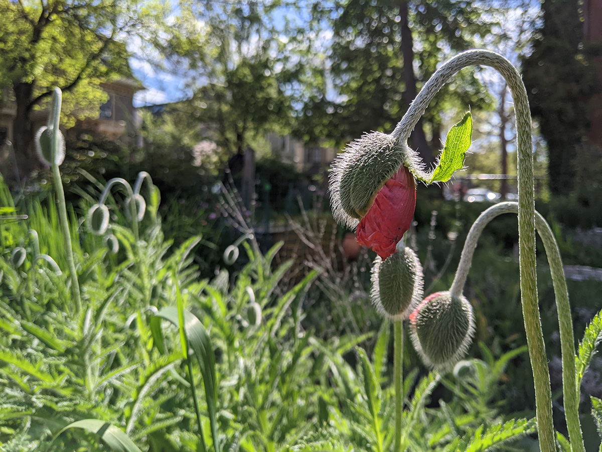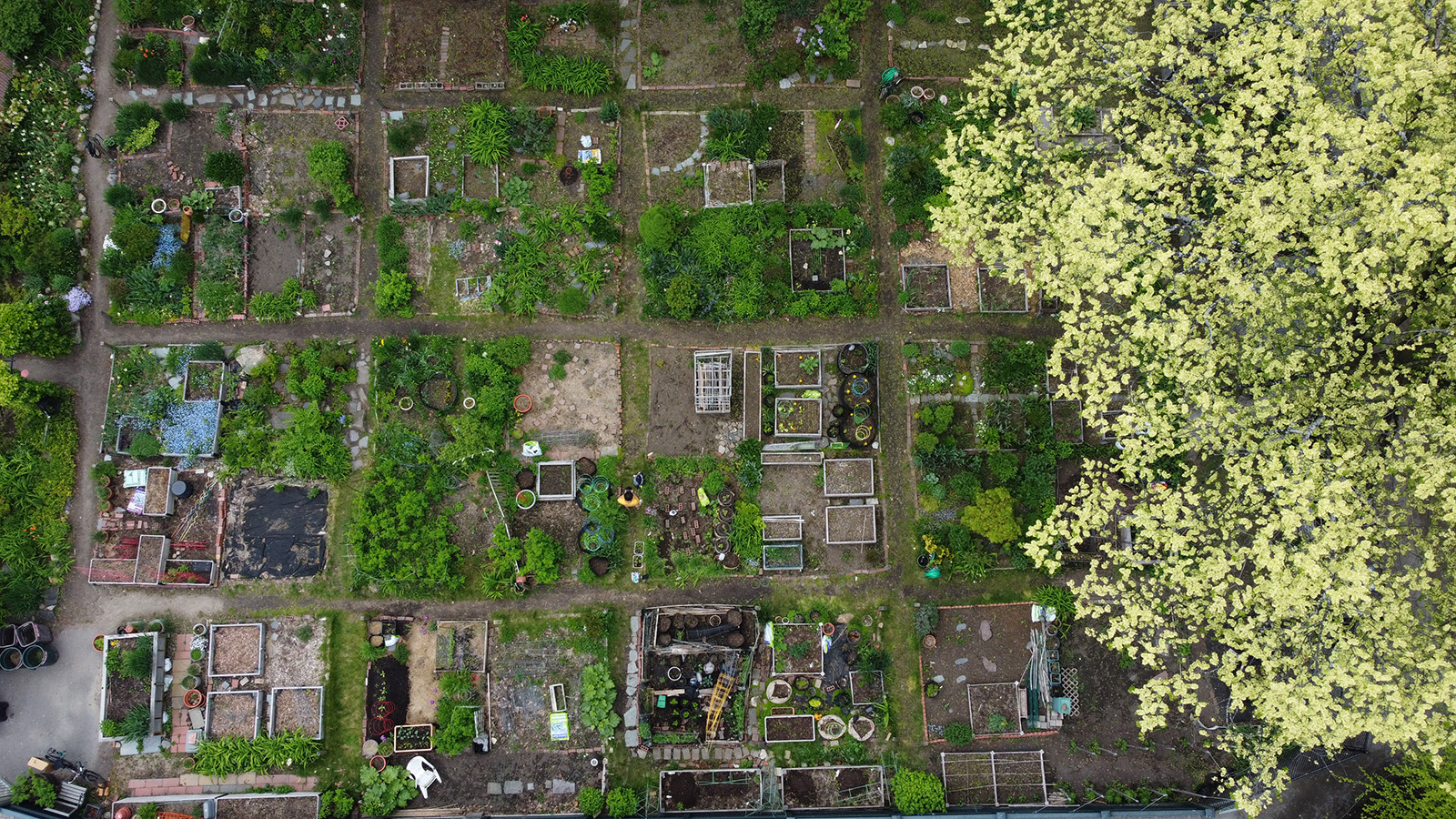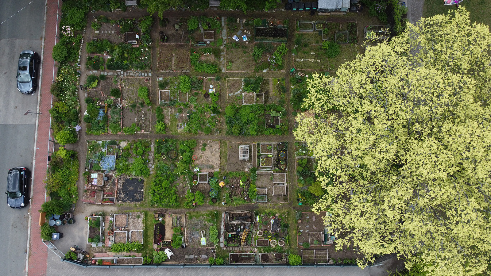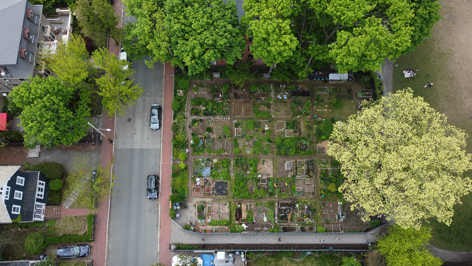 once i was alone in the garden, i quickly dug out my DJI mini 2 drone and flew it up in the air to get some photos (only to about 200ft). i was surprised the fly app didn't crash once. there were some children playing in the park behind the community garden (i didn't flip over them) but nobody seemed to notice what i was doing. i tried to do a catch landing but it jerked out of my hand so i landed in the uneven path and the right rear props hit some grass before coming to a stop.