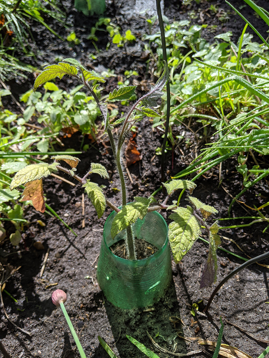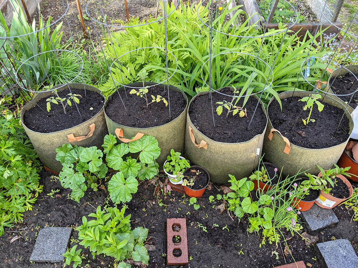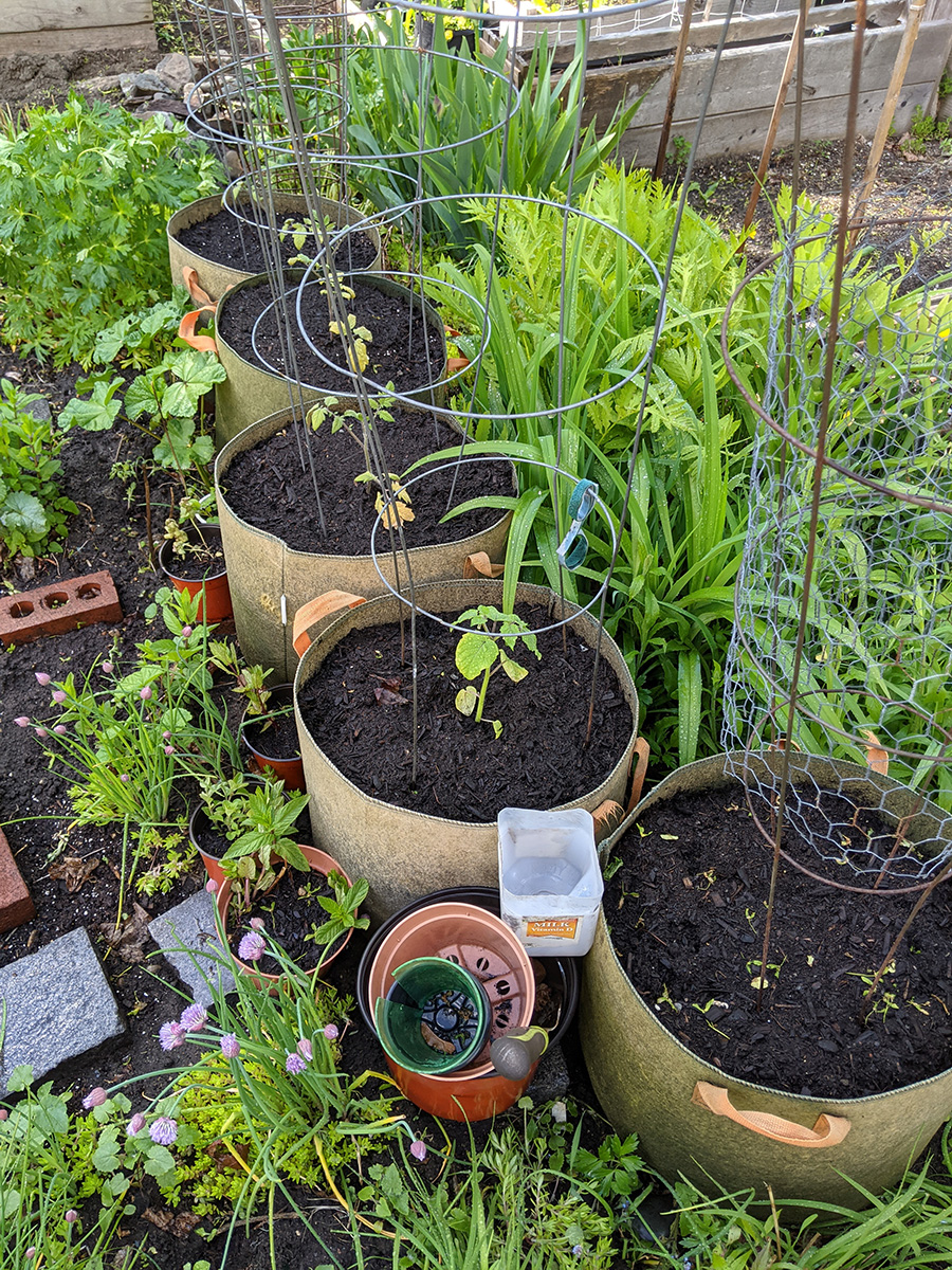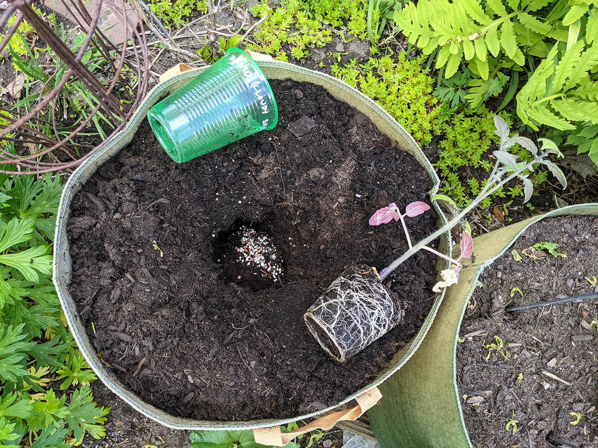i saw lynn in the garden working on her plot. i carefully unpacked all my plants. i have 5 grow bags, and decided to plant 2 'cloudy day' tomatoes, 1 cherry tomato, and 1 ground cherry in the bags, leave one free for a future 'ping tung' eggplant. the rest i planted in the soil. with the tomatoes and ground cherries, i made sure to add about a tablespoon of espoma plant food fertilizer grandules (10-10-10) into the hole before i planted. i also planted some of the tomatoes especially deep since they were so leggy. the wild tomatoes were fine though because i started them later.