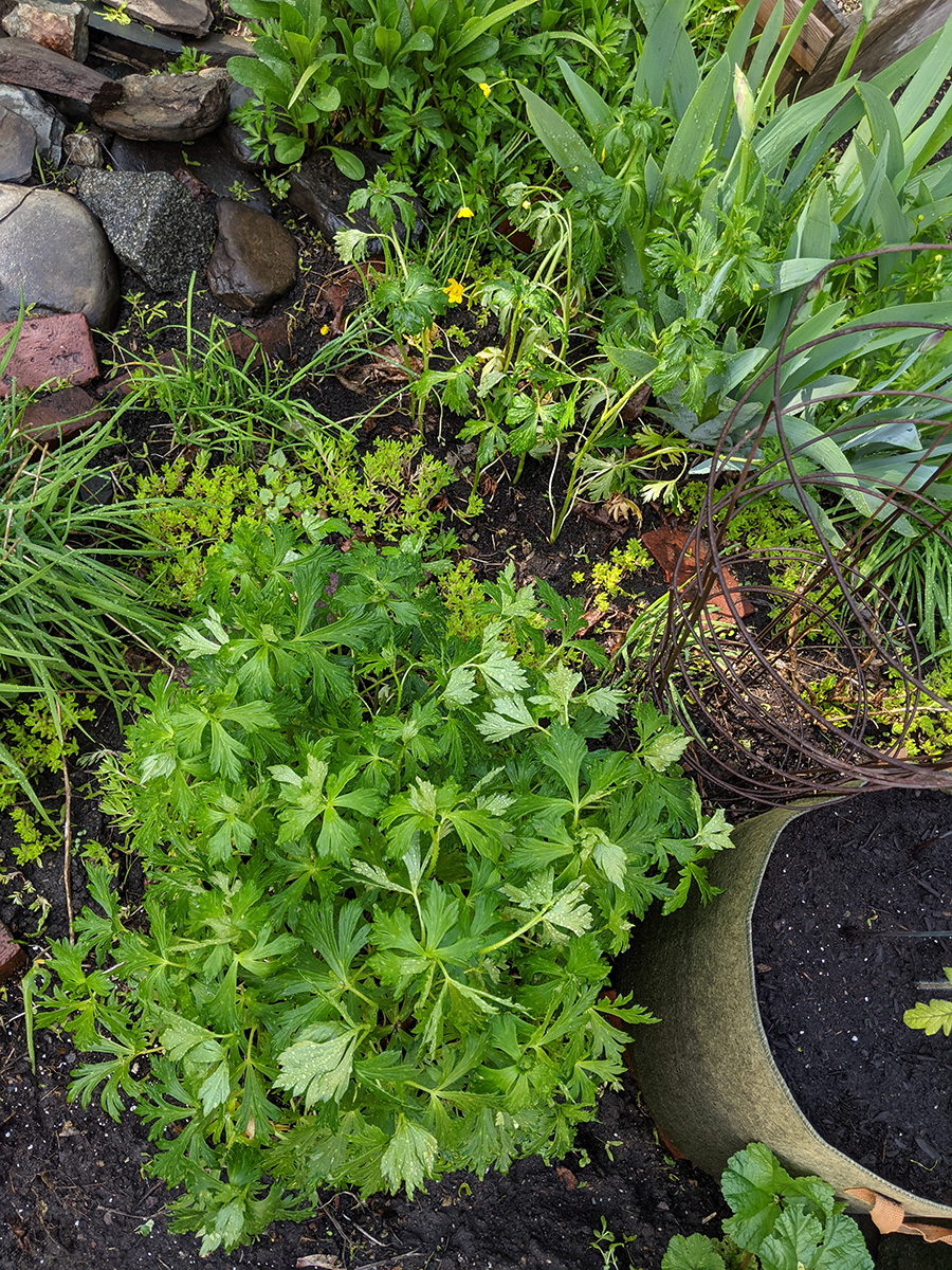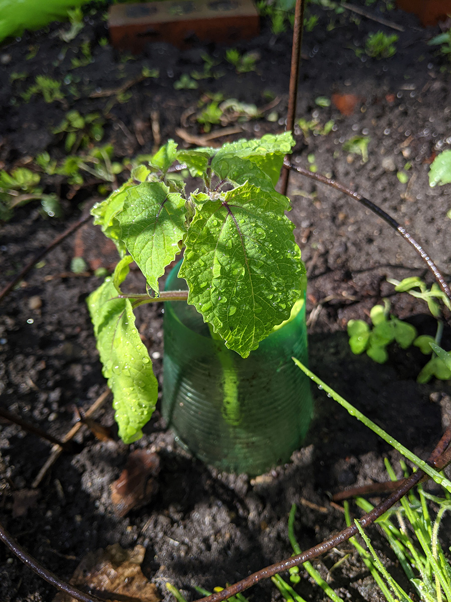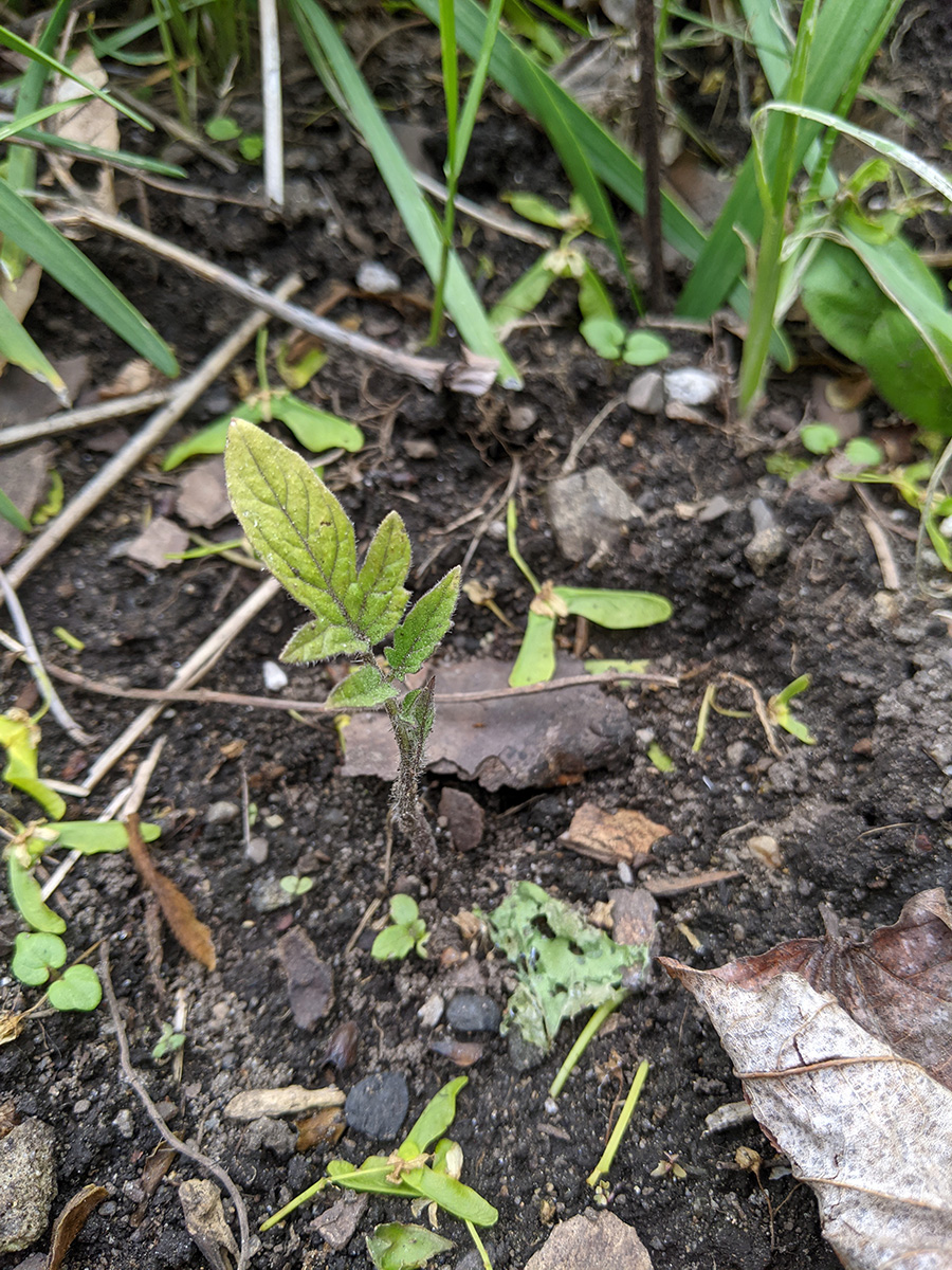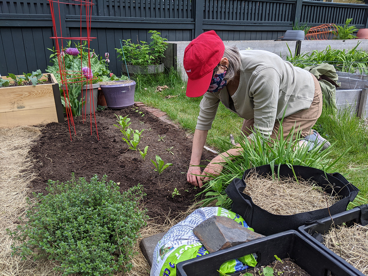 i saw lynn in the garden working on her plot. i carefully unpacked all my plants. i have 5 grow bags, and decided to plant 2 'cloudy day' tomatoes, 1 cherry tomato, and 1 ground cherry in the bags, leave one free for a future 'ping tung' eggplant. the rest i planted in the soil. with the tomatoes and ground cherries, i made sure to add about a tablespoon of espoma plant food fertilizer grandules (10-10-10) into the hole before i planted. i also planted some of the tomatoes especially deep since they were so leggy. the wild tomatoes were fine though because i started them later.