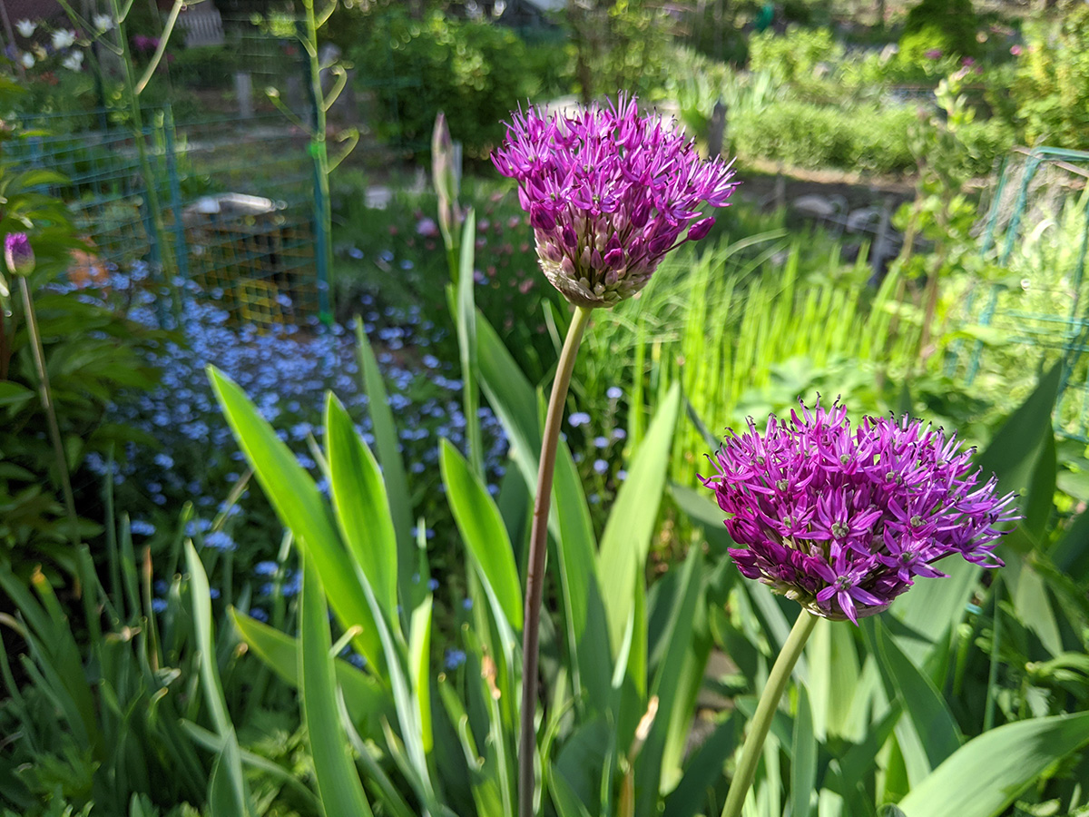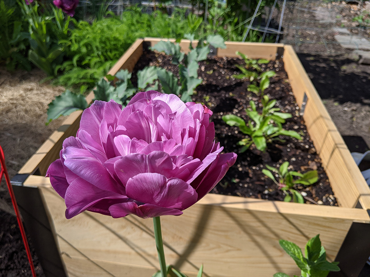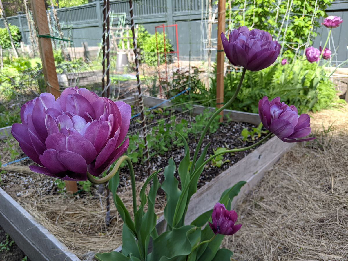 i chatted with lynn and she showed me her plot. i'm very jealous of her garden because everything is so organized, she said she liked my plot because it's always changing, she never knows what she'll find. besides the organization, she also organizes by colors depending on the season: springtime she likes purple and blue flowers, while summertime she prefers warmer colors. so she planted some orange calendulas and red gamphoras, and currently some purple peony tulips are blooming. she also had a huge garlic chive plant. i let her have some of my asters and stocks because i had so much. she was very thankful as she had used up her garden budget buying soil for her raised bed.