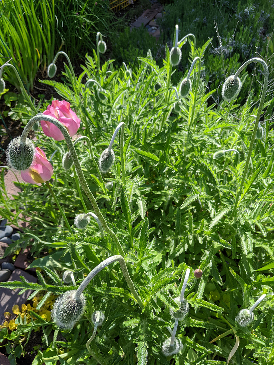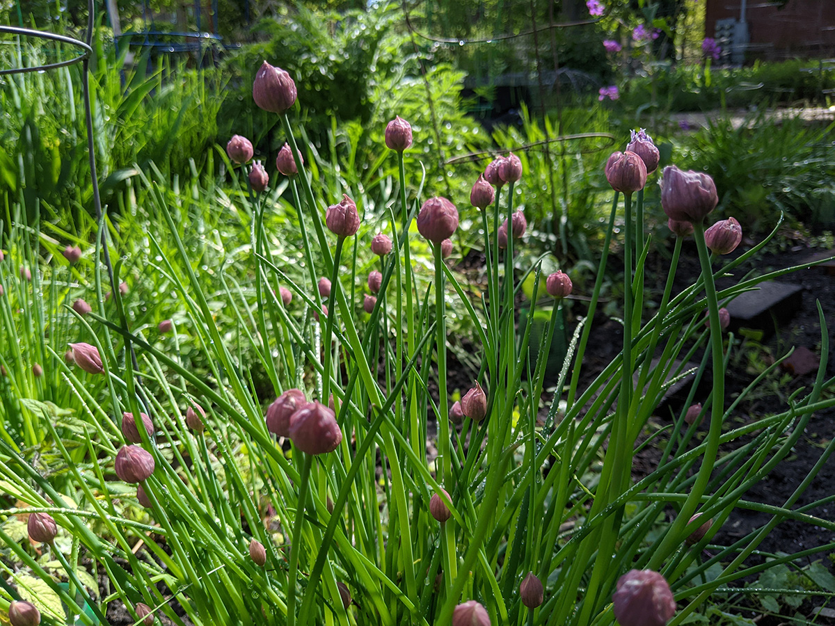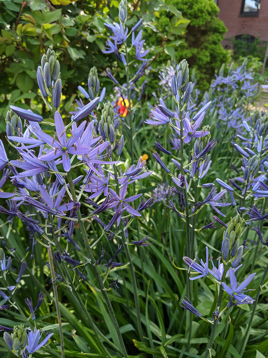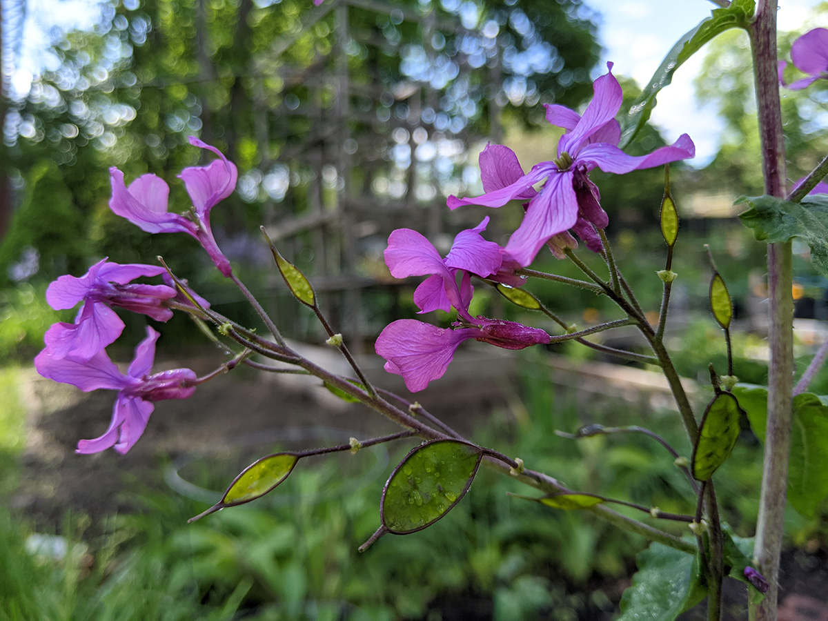 i chatted with lynn and she showed me her plot. i'm very jealous of her garden because everything is so organized, she said she liked my plot because it's always changing, she never knows what she'll find. besides the organization, she also organizes by colors depending on the season: springtime she likes purple and blue flowers, while summertime she prefers warmer colors. so she planted some orange calendulas and red gamphoras, and currently some purple peony tulips are blooming. she also had a huge garlic chive plant. i let her have some of my asters and stocks because i had so much. she was very thankful as she had used up her garden budget buying soil for her raised bed.