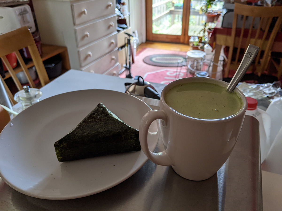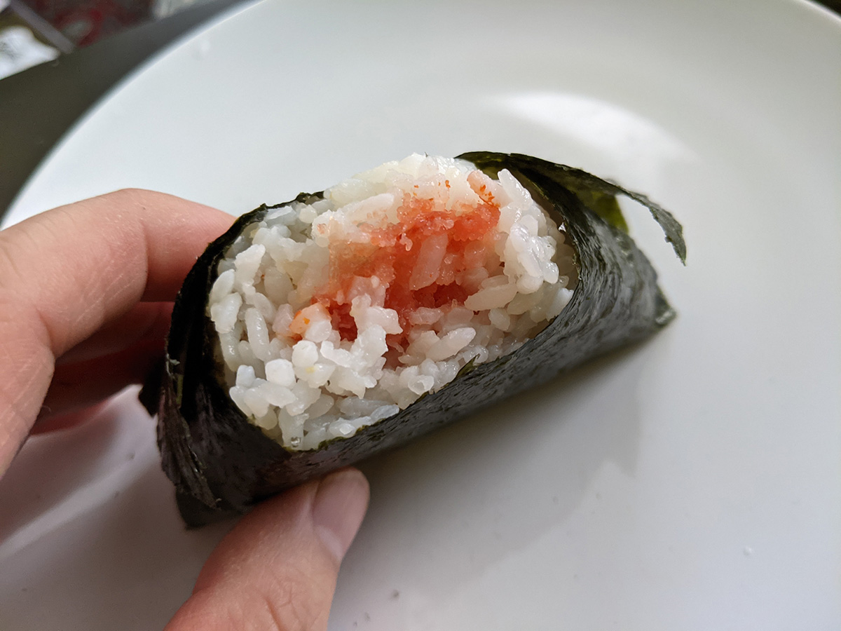 for lunch i had the spicy pollack roe onigiri and a matcha latte. i've found that even though the whole foods matcha powder tastes pretty much the same as my previous matcha, when i whisk it it doesn't completely dissolve, and there are always tiny clumps of matcha left behind afterwards. as for the onigiri, i bit into some reddish spiciness right away, but like the eel, the flavor wasn't very strong and there wasn't a lot of it, it was still mostly rice. i won't be buying onigiri from maruichi anytime soon.