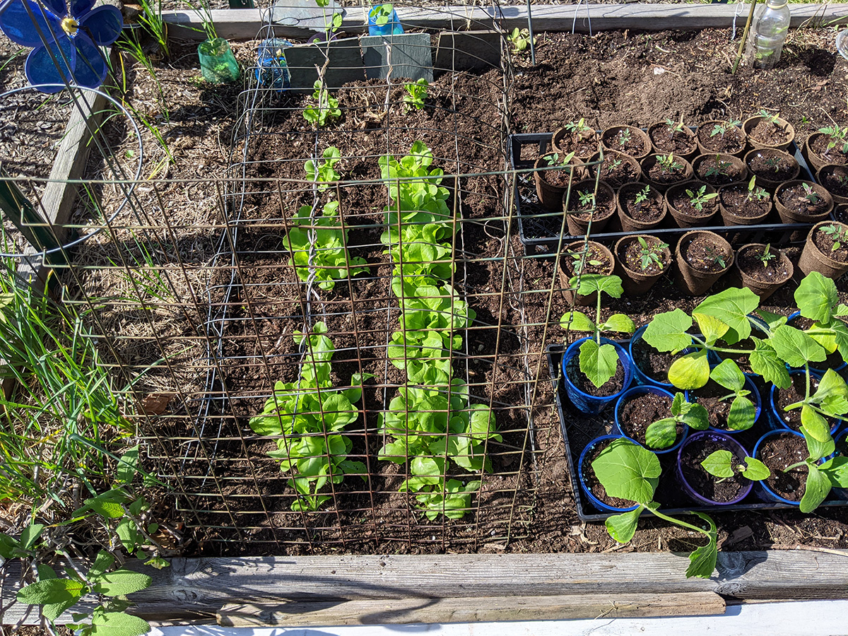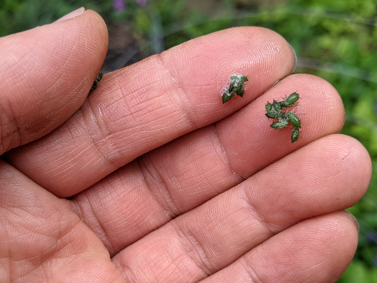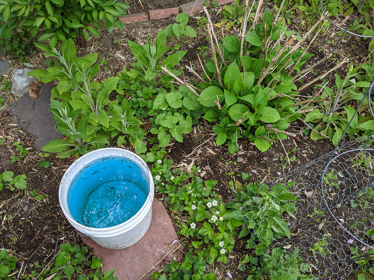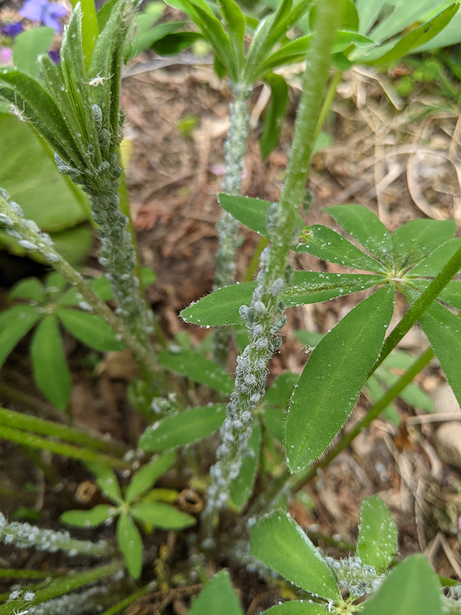 while inspecting the backyard, i noticed an aphid infestation on the large lupine in the southern perennial bed. i went inside and grabbed the insecticidal soap. these are fat lupine aphids (grape-seed size), the same ones we got last year. insecticidal soap will kill them on contact (they also lose their powdery coating), it's just an annoyance and we have to keep vigilante otherwise they come right back.