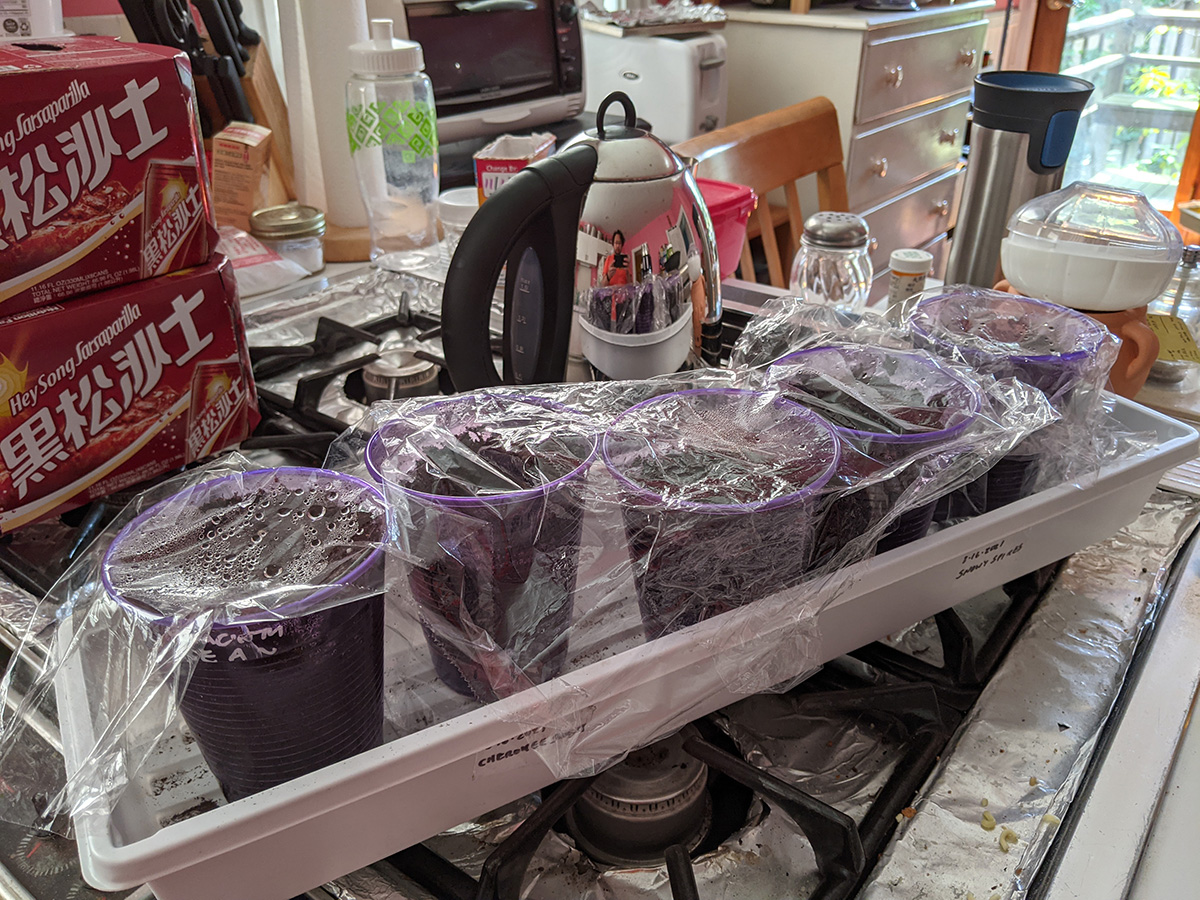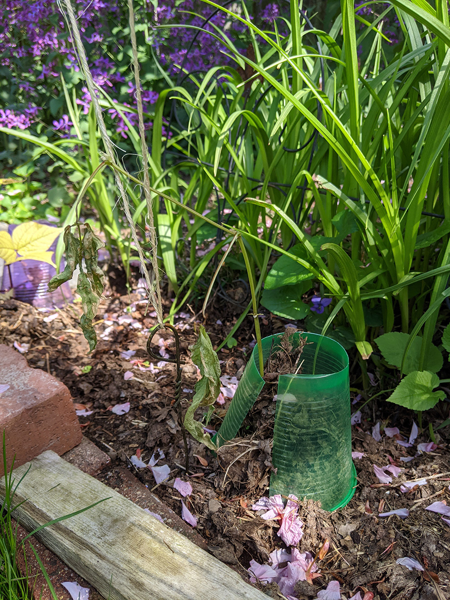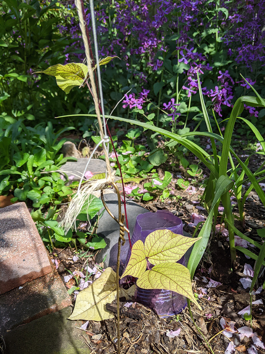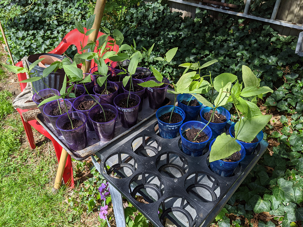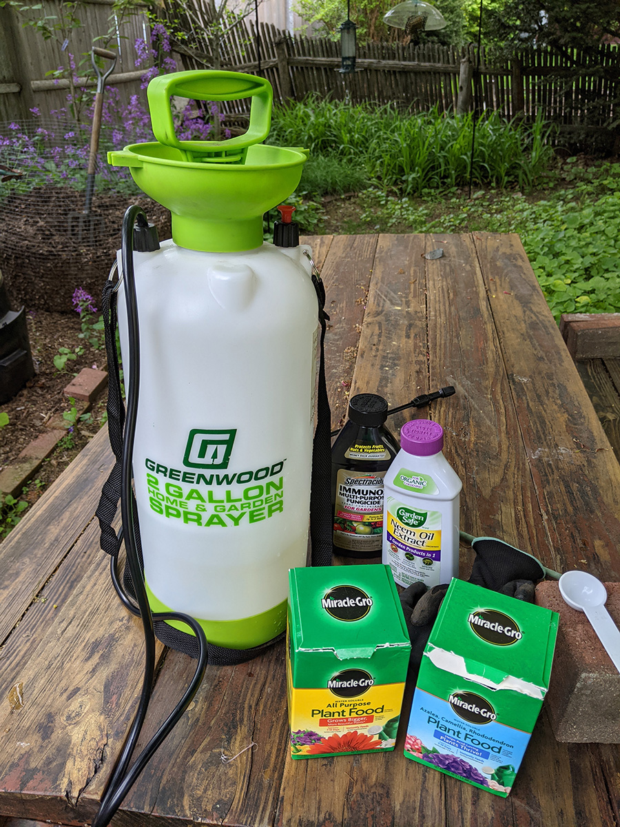 so much of today was about spraying and fertilizing. i mixed a gallon of immunox (2btsp) and sprayed the grapes. 1 gallon is a bit much, i kept spraying the grapevines multiple times until i finally ran out of fungicide; next time i only need to make 1/2 gallon. next i made 1/2 gallon of neem oil solution and sprayed the jasmines and gardenia. once that was done, i applied miracle-gro water soluble plant food to the various plants: all purpose solution for the jasmines (making sure to dilute it for potted plants), chrysanthemums, and peonies; acid-loving plant food for the hydrangeas and the frontyard holly. i also wanted to spray some copper solution on the cherry and plum trees to act as a basic fungicide, but our backyard neighbor was working in his garden and i didn't want to spray while he was there, in case of drifting. i also divided some hyacinth bean seedlings, turned 3 sprouted pots into 6 seedlings.