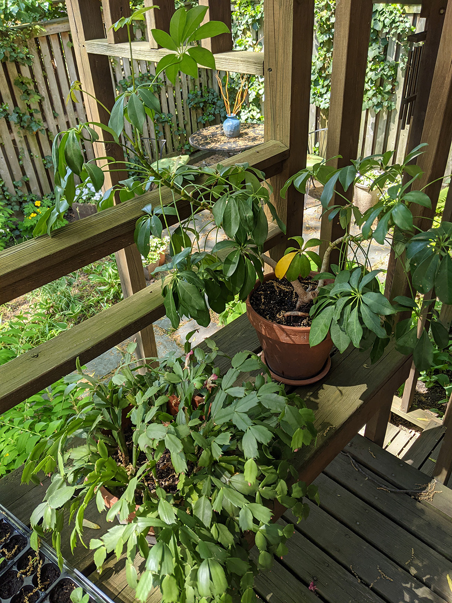 first thing i did when i arrived was to go down to the basement and start moving out all the houseplants from the grow room. the weather has warmed up enough such that the jasmines and gardenia can start living outside; the cactuses we might wait for another week or two, though the forecast for next week certainly looks warm enough (60°+ nights) that we can move them out as well.