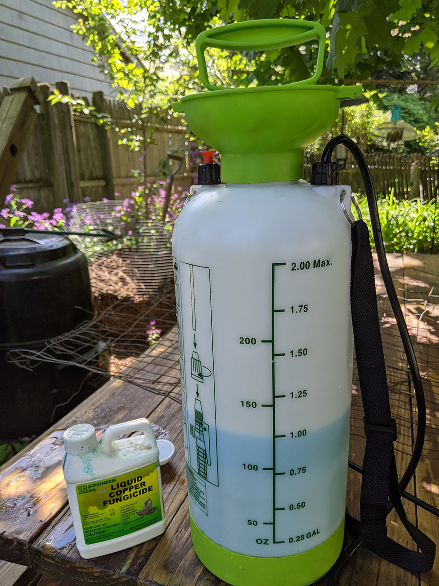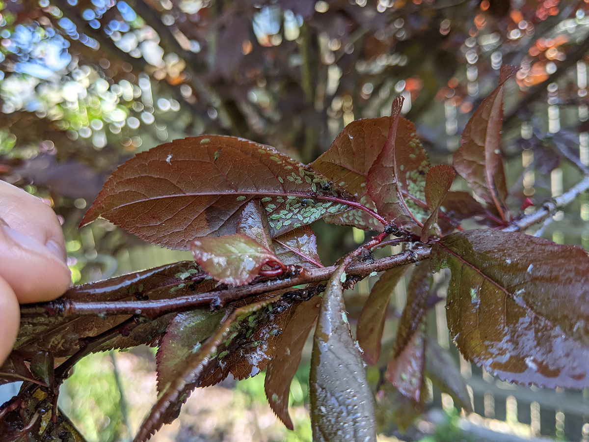 i mixed up a gallon solution of copper (4tsp of concentrate) to spray on the flowering cherry and plum. this is to prevent black knot, but i couldn't find any literature that specifically said that copper could treat black knot, but i know copper is a general fungicide, and something is better than nothing, especially given the previous trees had a massive black knot outbreak. i started with the kwanzan cherry, using a ladder to get to the top of the tree, before moving onto the cherry plum. i noticed what looked to be black clumps on some of the stems. i thought maybe it was some plant disease but when i took a closer look, i realized it was a massive aphid infestation. i mixed up a new batch of insecticidal soap and began spraying. they were mainly confined to the shadier western side of the tree. there were so many aphids, i could hear them falling off the tree. afterwards i tried rinsing them off with the garden hose, but they were still clinging on. using a hand sprayer on such a large tree was too much work; i decided to come back tomorrow and spray the tree again with neem oil using the pump sprayer.