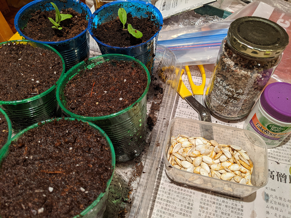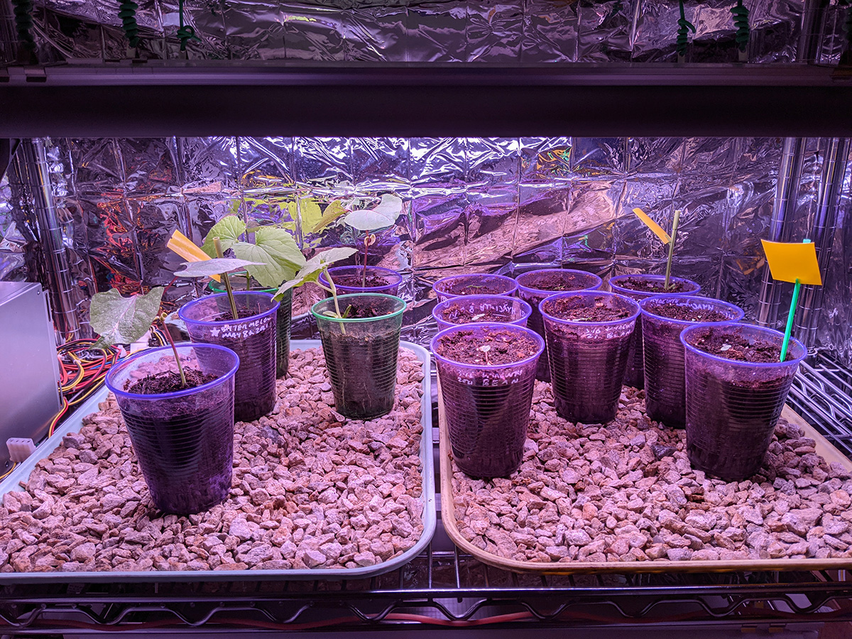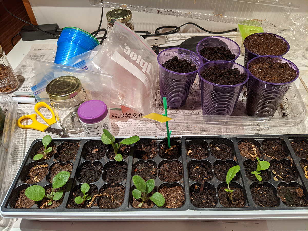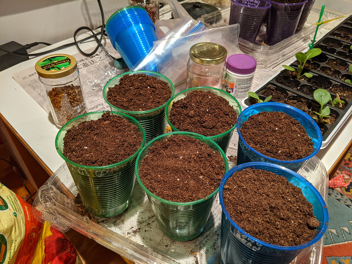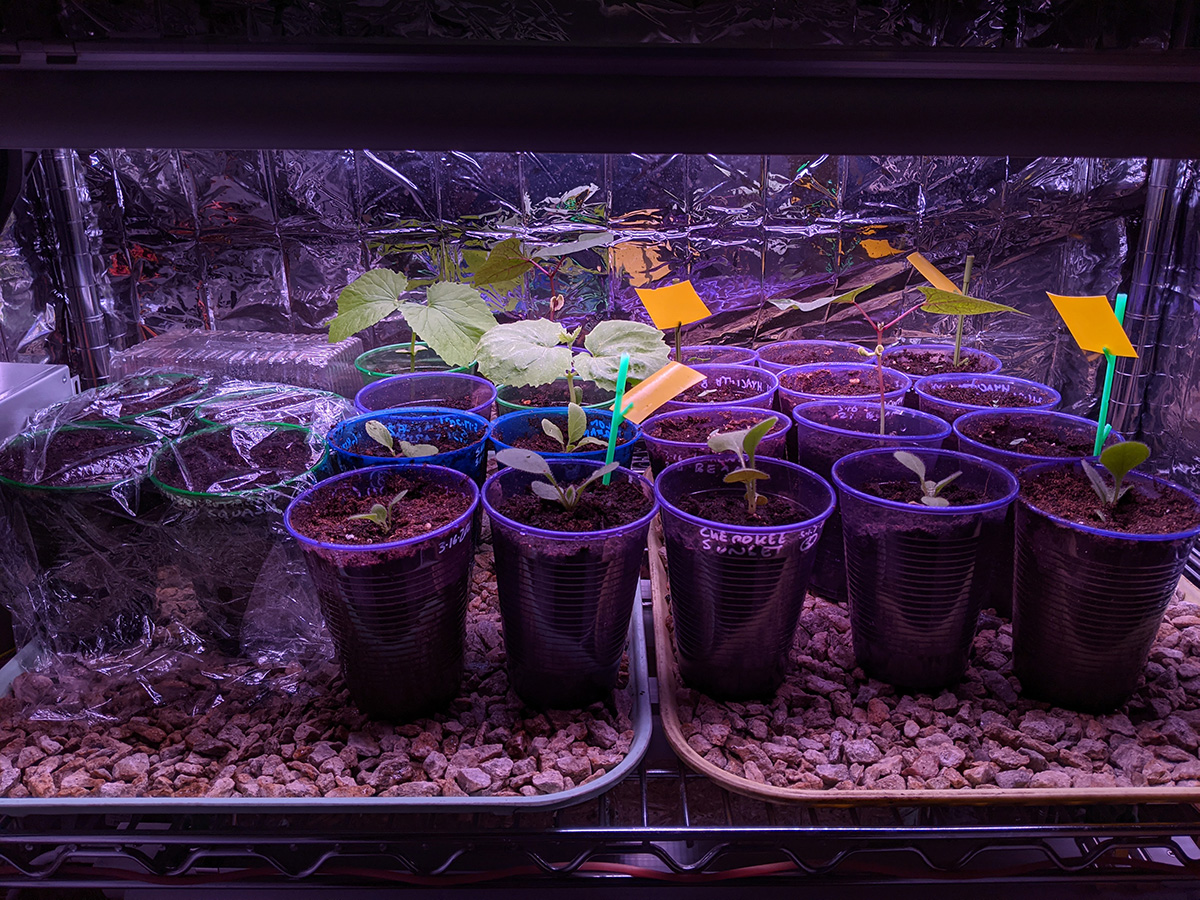 first thing i did when i got back home was move in all my seedlings from the backyard porch. i transplanted the perennial seedlings from the starter trays into individual cups: 5 'cherokee sunset' rudbeckias, 2 snowy spires. i also planted 4 buttercup squashes and filled a dozen starter cells with nigella seeds, my 3rd batch. finally i moved all the plants back into my grow closet. i'm only using a single shelf, but with 3 strip lights. i made sure to water with Bti treated water and set up some yellow sticky traps to control the fungus gnats.