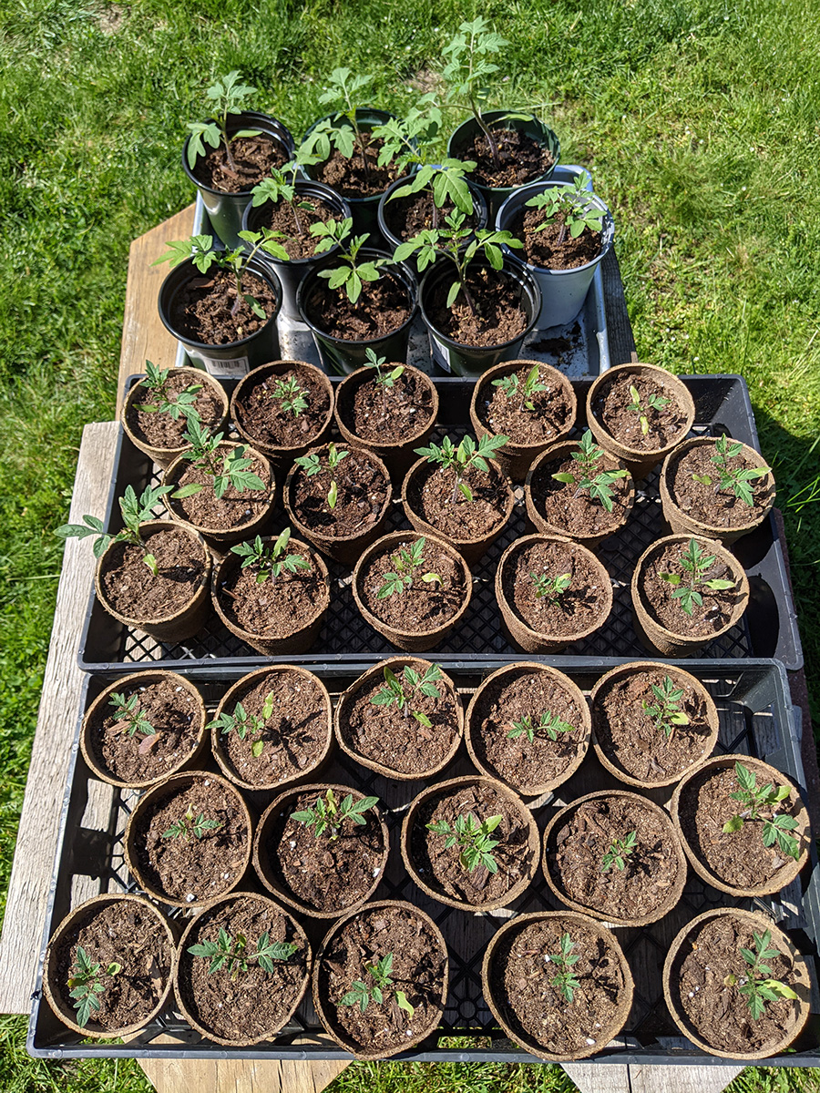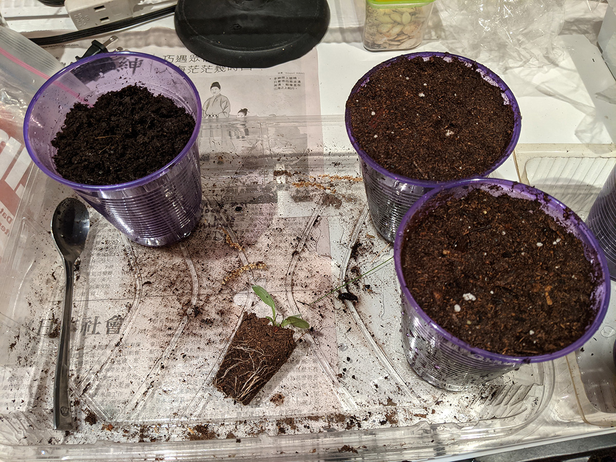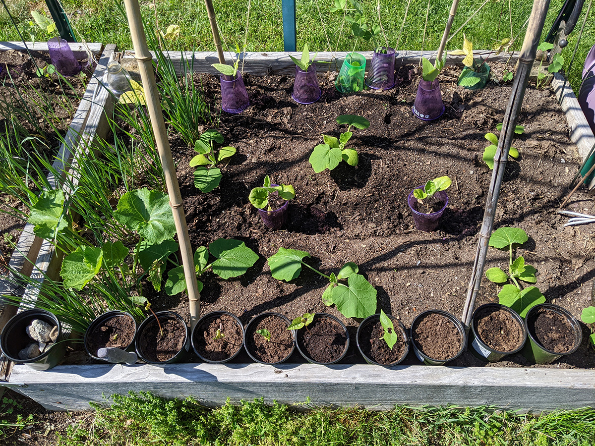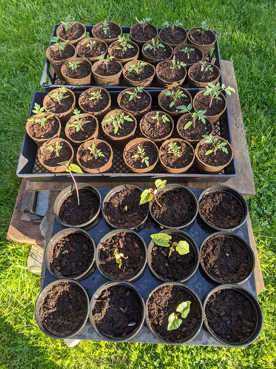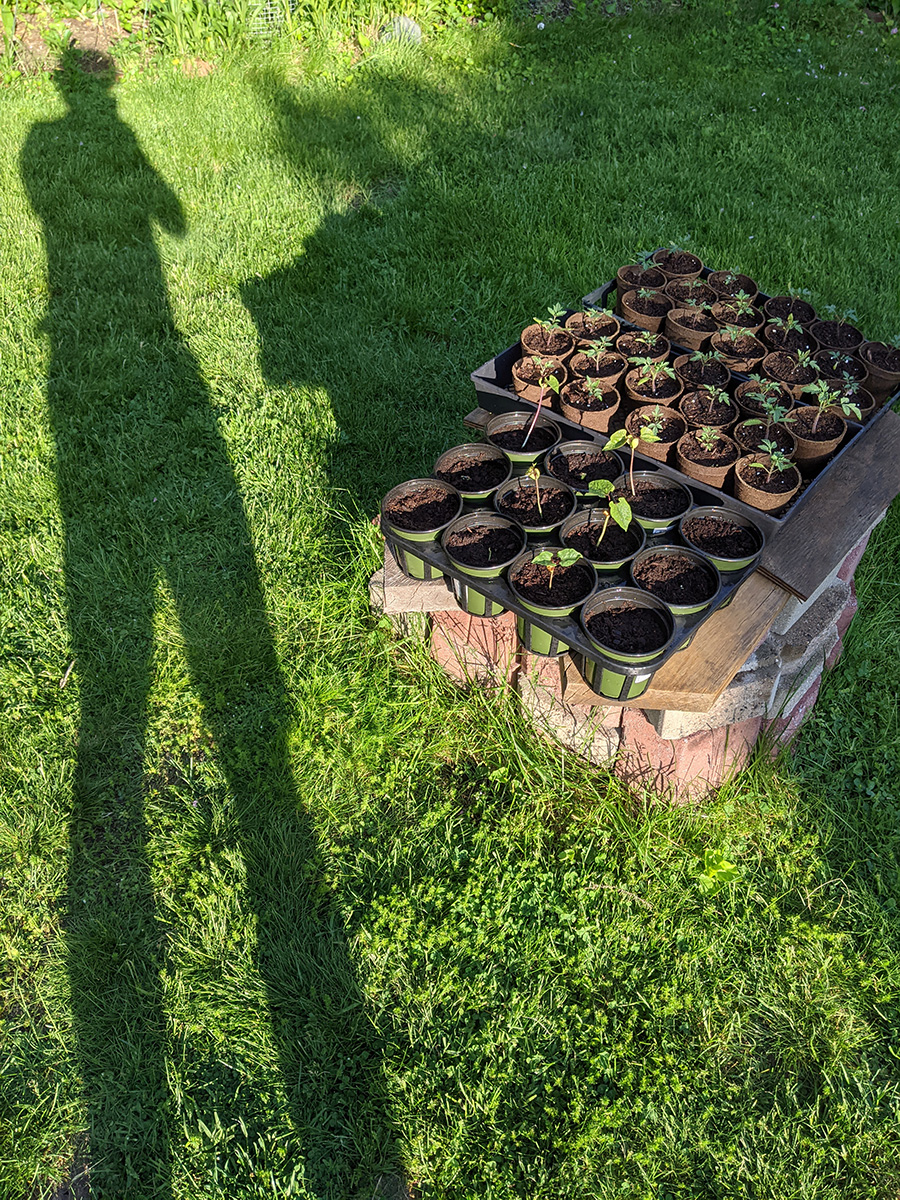 first thing i did when i got back home was move in all my seedlings from the backyard porch. i transplanted the perennial seedlings from the starter trays into individual cups: 5 'cherokee sunset' rudbeckias, 2 snowy spires. i also planted 4 buttercup squashes and filled a dozen starter cells with nigella seeds, my 3rd batch. finally i moved all the plants back into my grow closet. i'm only using a single shelf, but with 3 strip lights. i made sure to water with Bti treated water and set up some yellow sticky traps to control the fungus gnats.