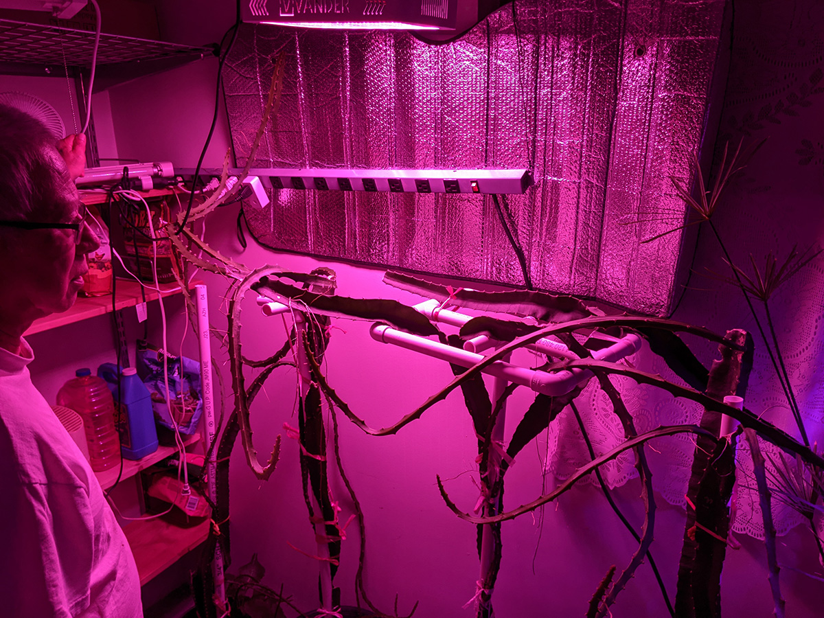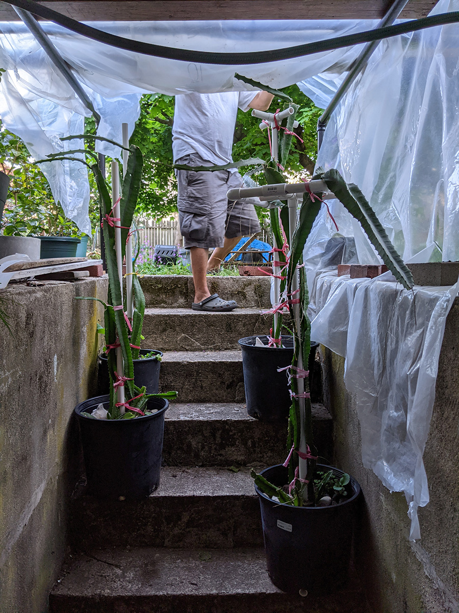 after dinner we went down to the basement grow room to move the 4 dragonfruit cactuses outside. under the blurple led grow lamp, the cactuses continued growing but forming long and thin tendrils instead of thick meaty limbs. my father pruned off all the tendrils so the cactuses would be easier to move outside. we placed them in the basement stairwell, a clear plastic tarp giving them some protection from the cold, as this is their first time being outside since the end of last season.