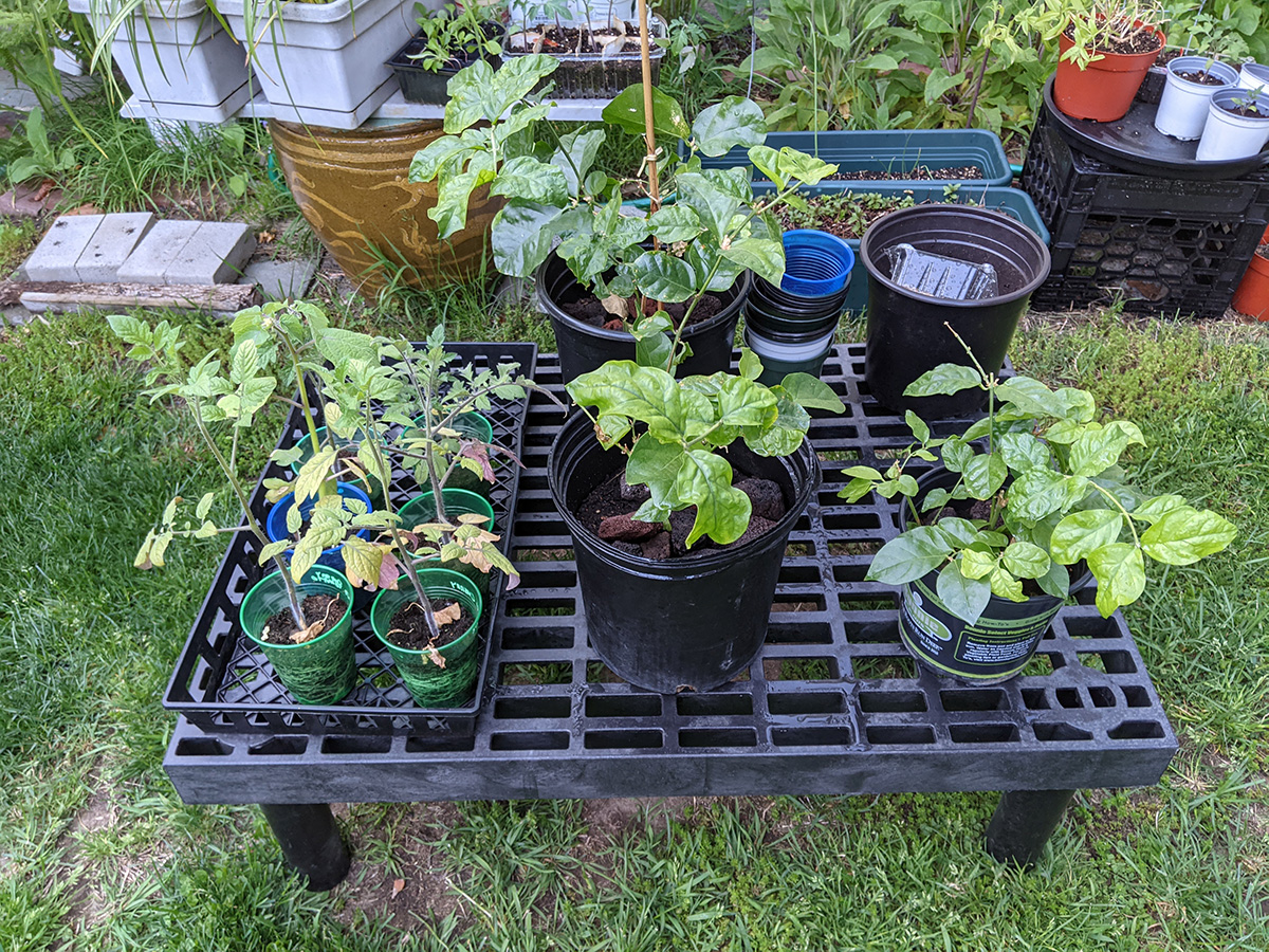my father had brought home a garden center plastic bench display table. it's perfect for our jasmines because we can keep them outside off of the grass and the table has holes to allow drainage.
