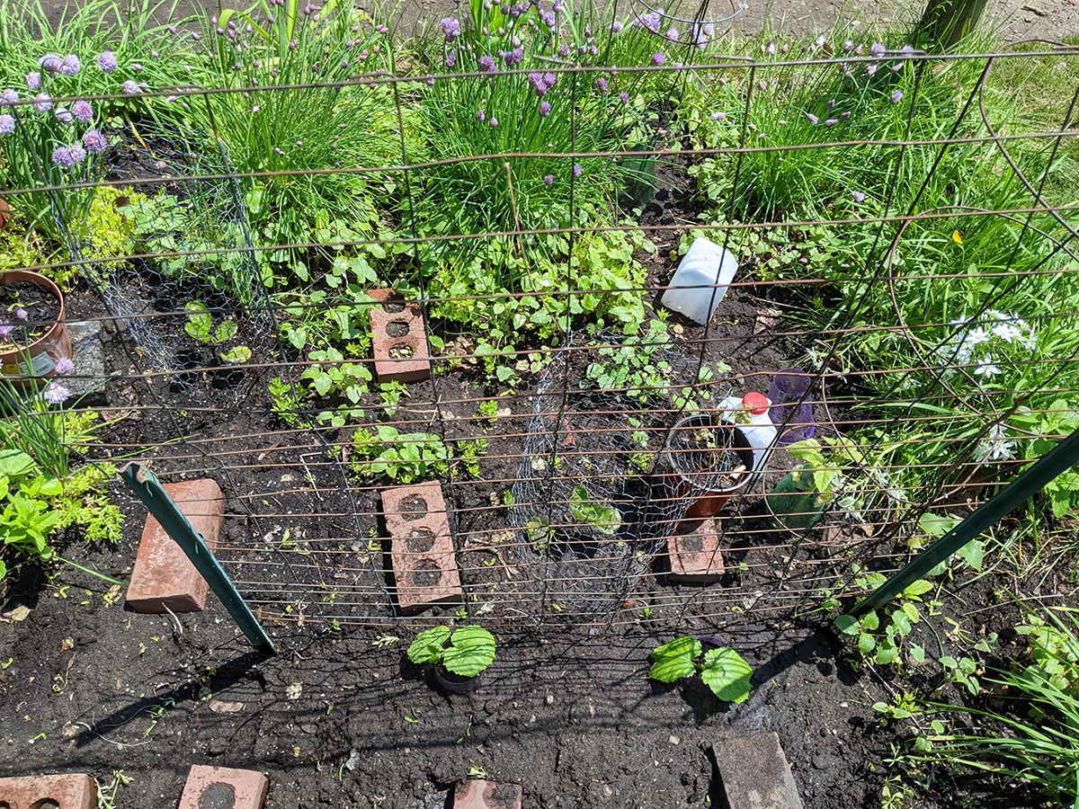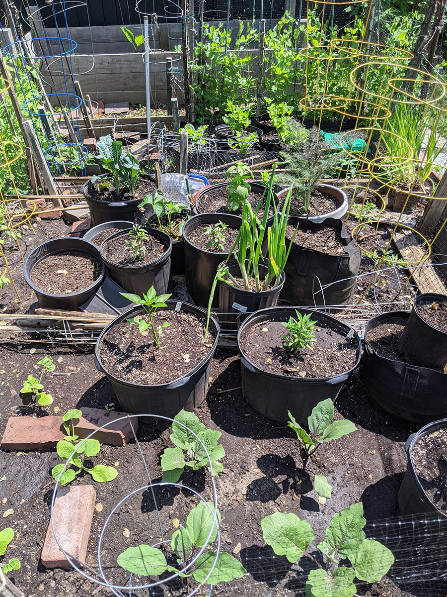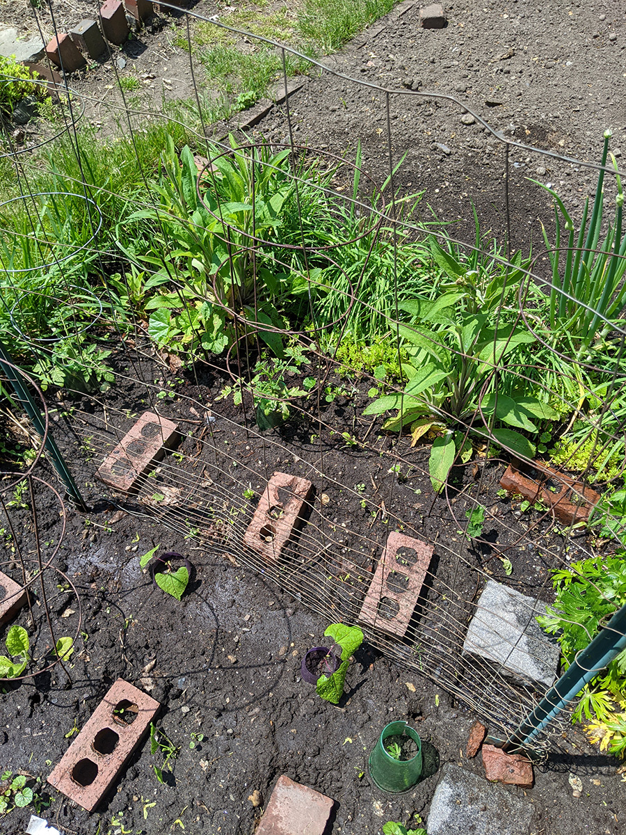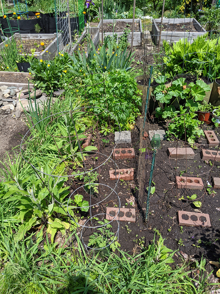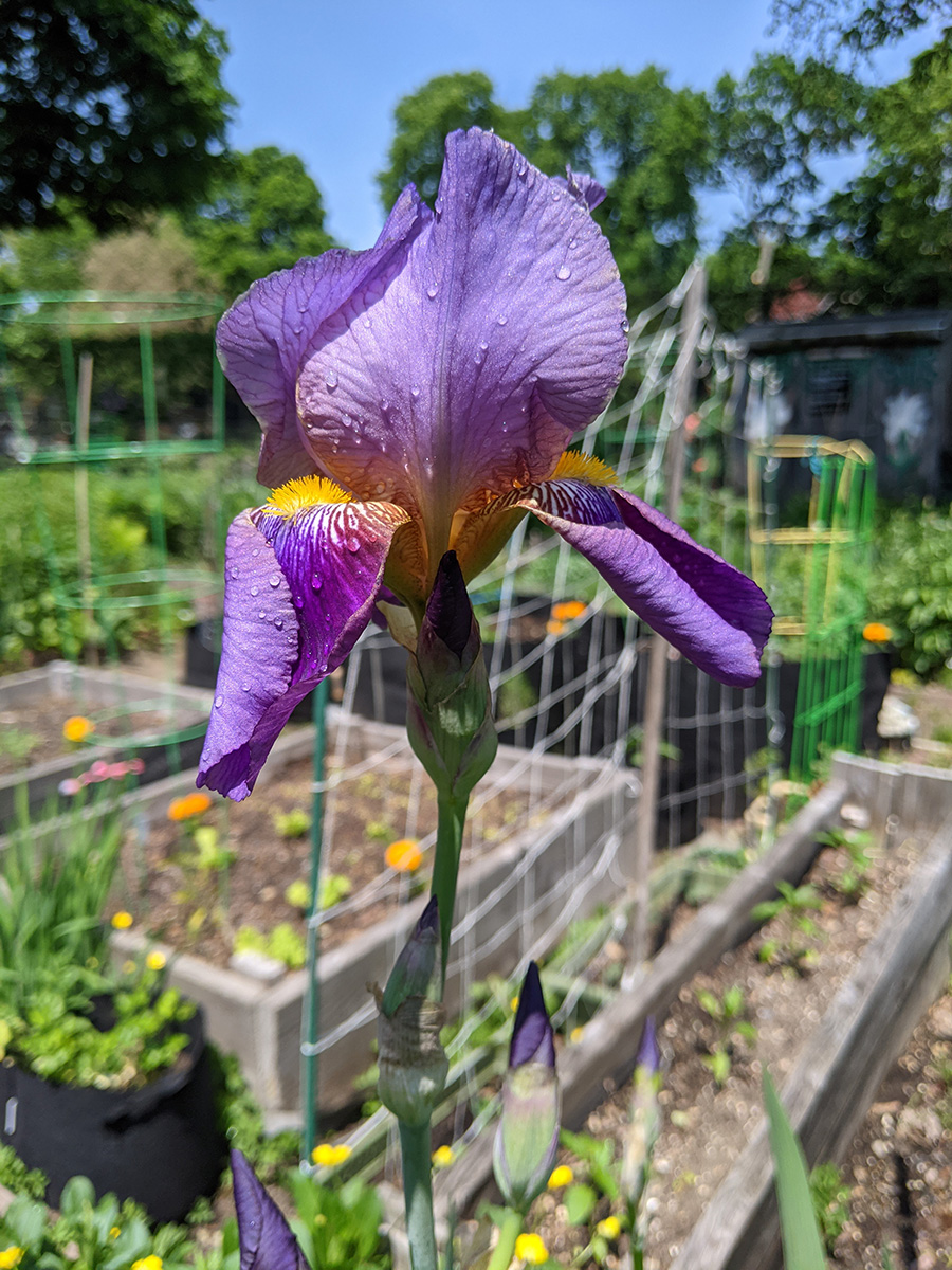 i walked down to the community garden (without mask) in the late morning to plant my hyacinth beans and bitter melons. i planted the two hyacinth beans on the western side (taller trellis) while the two bitter melons on the eastern side (more sun). not much else was happening in my plot, the bearded irises at the far end of my garden have started to bloom.