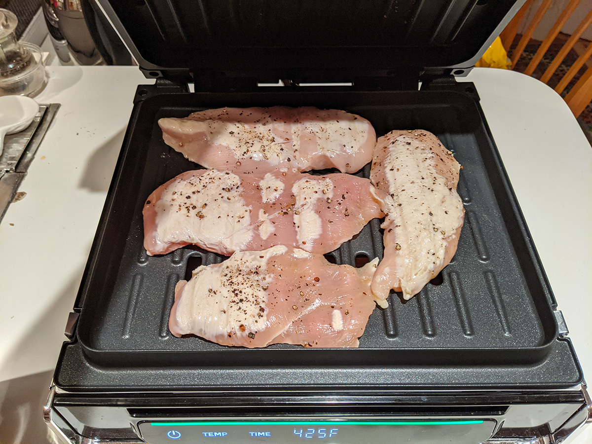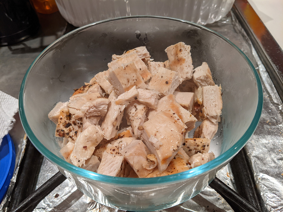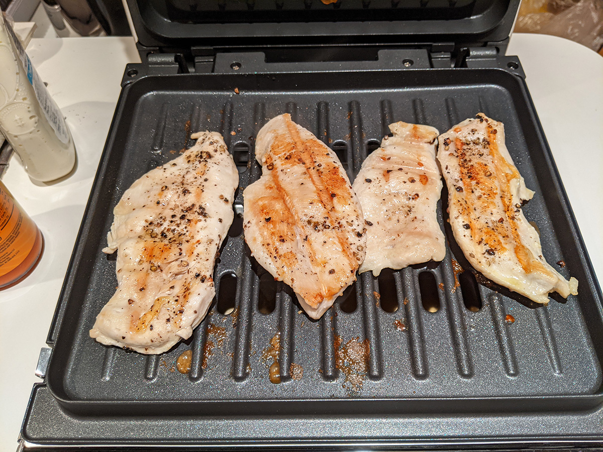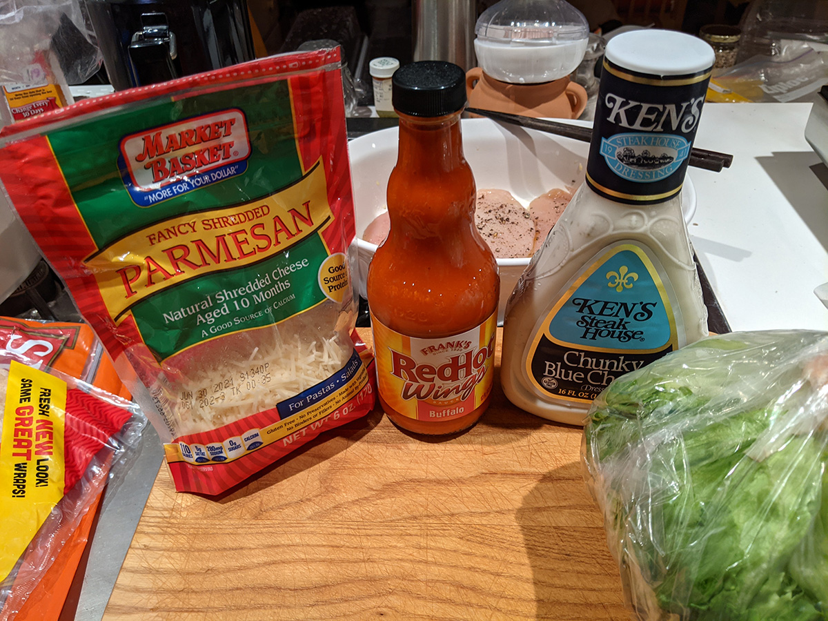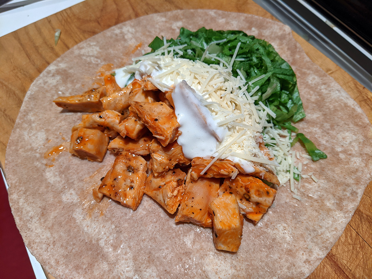 i started making dinner around 8:30pm. buffalo chicken wrap is simple: grill the chicken cutlets on the smokeless foreman, chop into bit size pieces and mix with some red hot buffalo wings sauce, assemble in flour tortilla with chopped lettuce, parmesan cheese, and blue cheese dressing, then roll up and eat. i had a hard time rolling up the wrap, i think the secret is to warm up the tortilla. the chicken tasted rubbery, maybe i overcooked it. the recipe i found said to use rotisserie chicken, or maybe shred the chicken next time instead of grilling and cutting it into pieces. i grilled all my chicken so i have enough ingredients to make a few more wraps for the rest of the week.