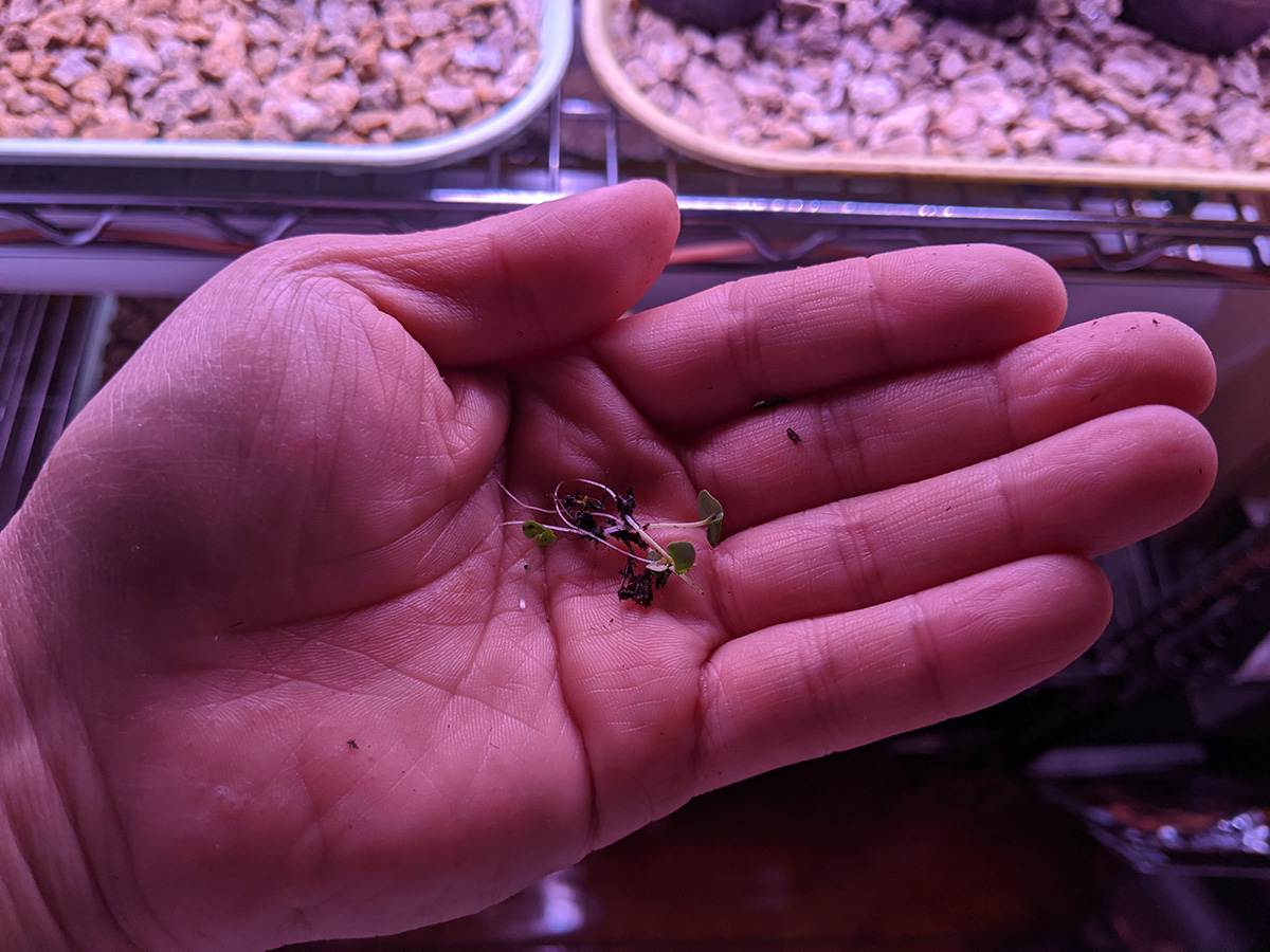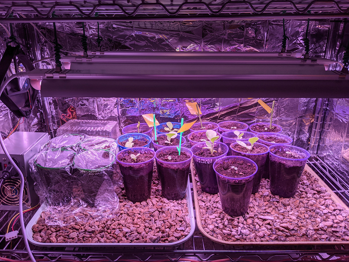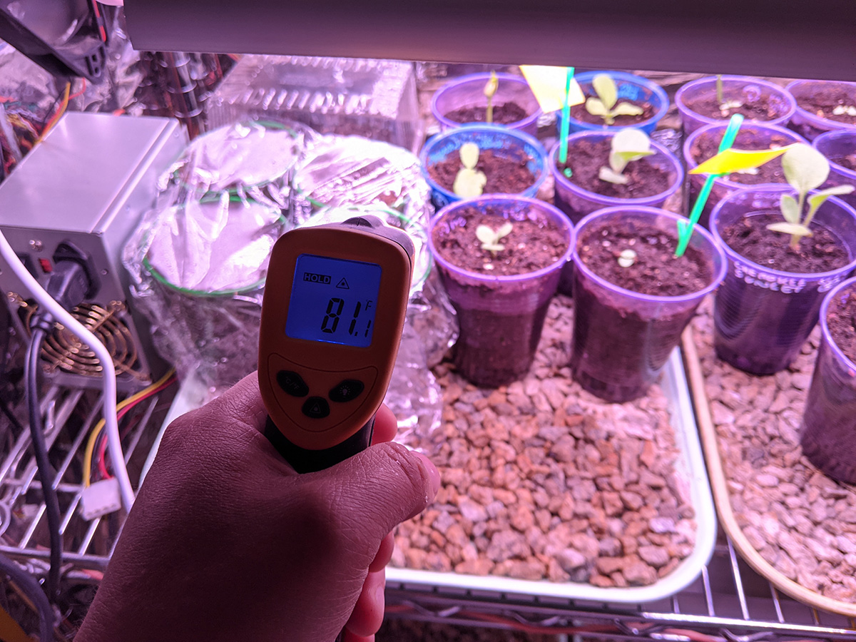 inside my grow closet it was toasty warm: 81°F underneath the syran wrapped buttercup squash seeds, with 75°F elsewhere in the closet, a few degrees higher than my room temperature. i also thinned out the thai basil, leaving a seedling per pot (8).