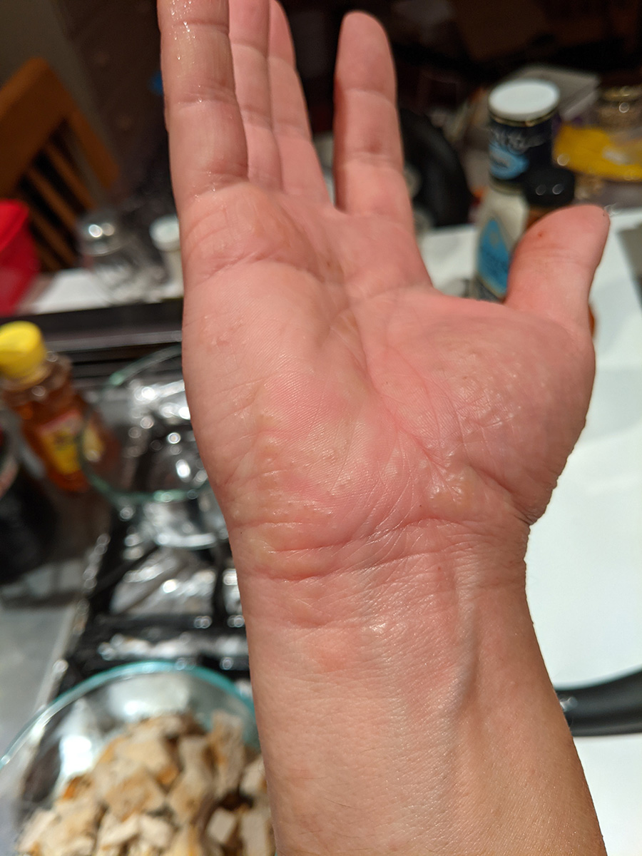 i pull up some weeds with my bare hand, and the next day i start seeing blisters. a few at first, but then it gets worse. the more i scratch the more they come. i find the only thing that will relieve the itching is rinsing with cold water. i also sleep with my hand outside the blanket, otherwise the warmth will trigger a nocturnal scratching fit until i wake up with a bloody hand. maybe i should be wearing sleep mittens? however, this only happens once, because after that, i wear gloves all the time when i'm working in the garden.