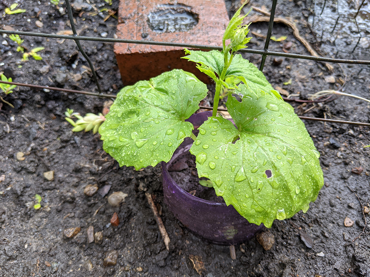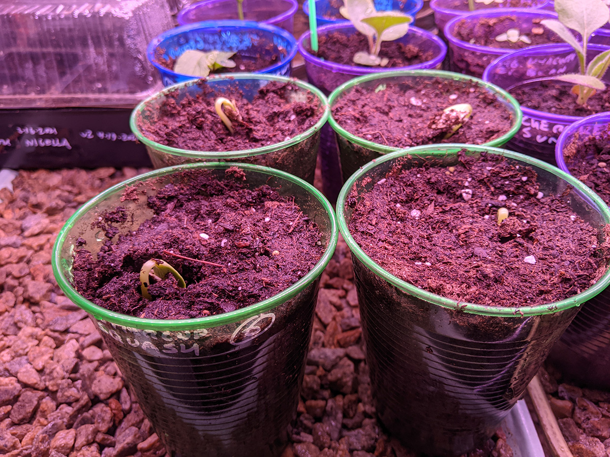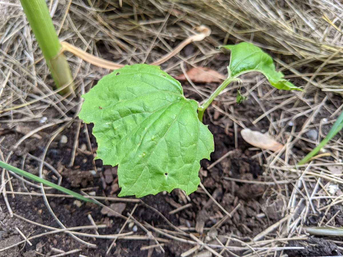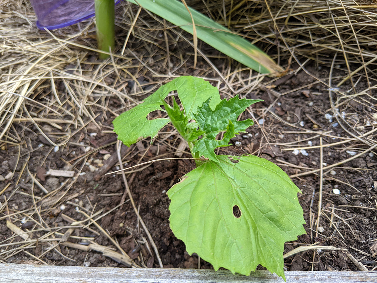 my father also showed me that something (most likely slugs) had been feeding on the bitter melons. one of them lost its tip, while two others are still okay. i have a backup bitter melon seedling in my grow closet, if the damaged seedling doesn't make it, we can always swap it out.