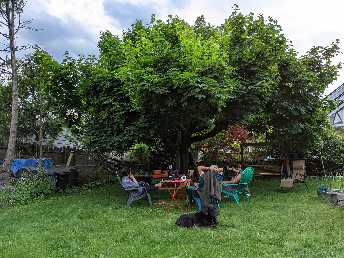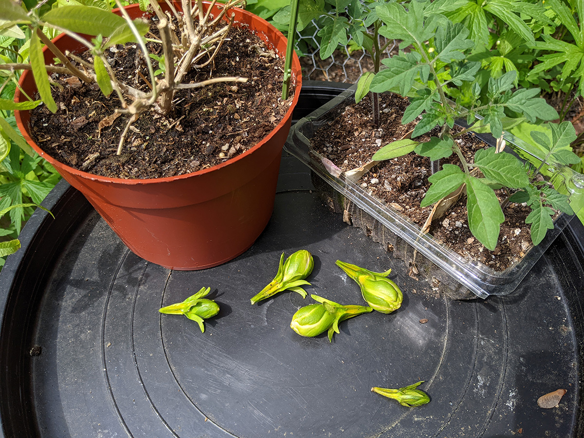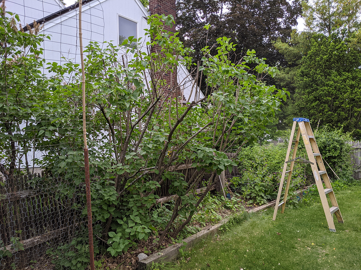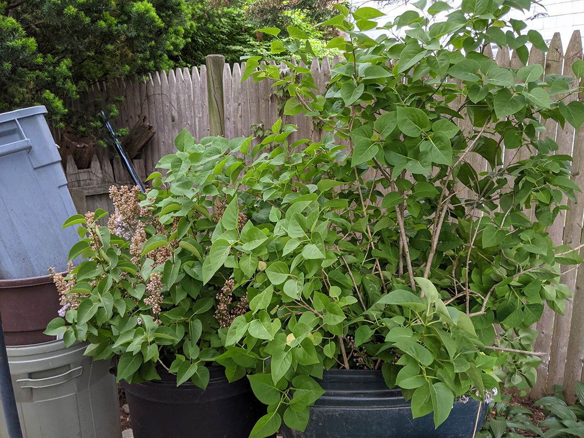 afterwards while everyone else were chatting outside, my father and i pruned a little bit of the kwanzan cherry tree. up on the ladder, i discovered some black aphid colonies on the very tip of a few high branches. i grabbed some insecticidal soap and sprayed them. they seem to be the handiwork of ants, which makes me think i might need to do something about the colony setting up a nest below the tree. i also got some soap in my eye. afterwards we moved onto the lilac bush. all the flowers had already wilted, so it was time to prune. we cut a great deal, nearly half, the lilac looking very sparse now. but it's for the greater good, new branches will develop during the summer, along with new flower buds for next season. we're hoping to get even more lilacs in 2022.