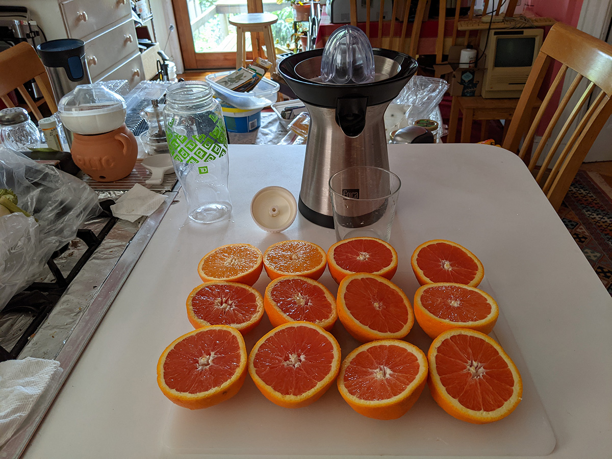 i biked down to the community garden to water my plants. that couple who have the plot next to mine were there planting their dahlias. they were standing in front of my plot, speaking with anne marie. i waited finished for them to finish before i could water. returning to the house again, i used the bathroom and took a shower before cutting up 6 cara cara oranges and squeezing out a fresh container of juice. i packed up my saddlebags and finally left for belmont around noontime.
