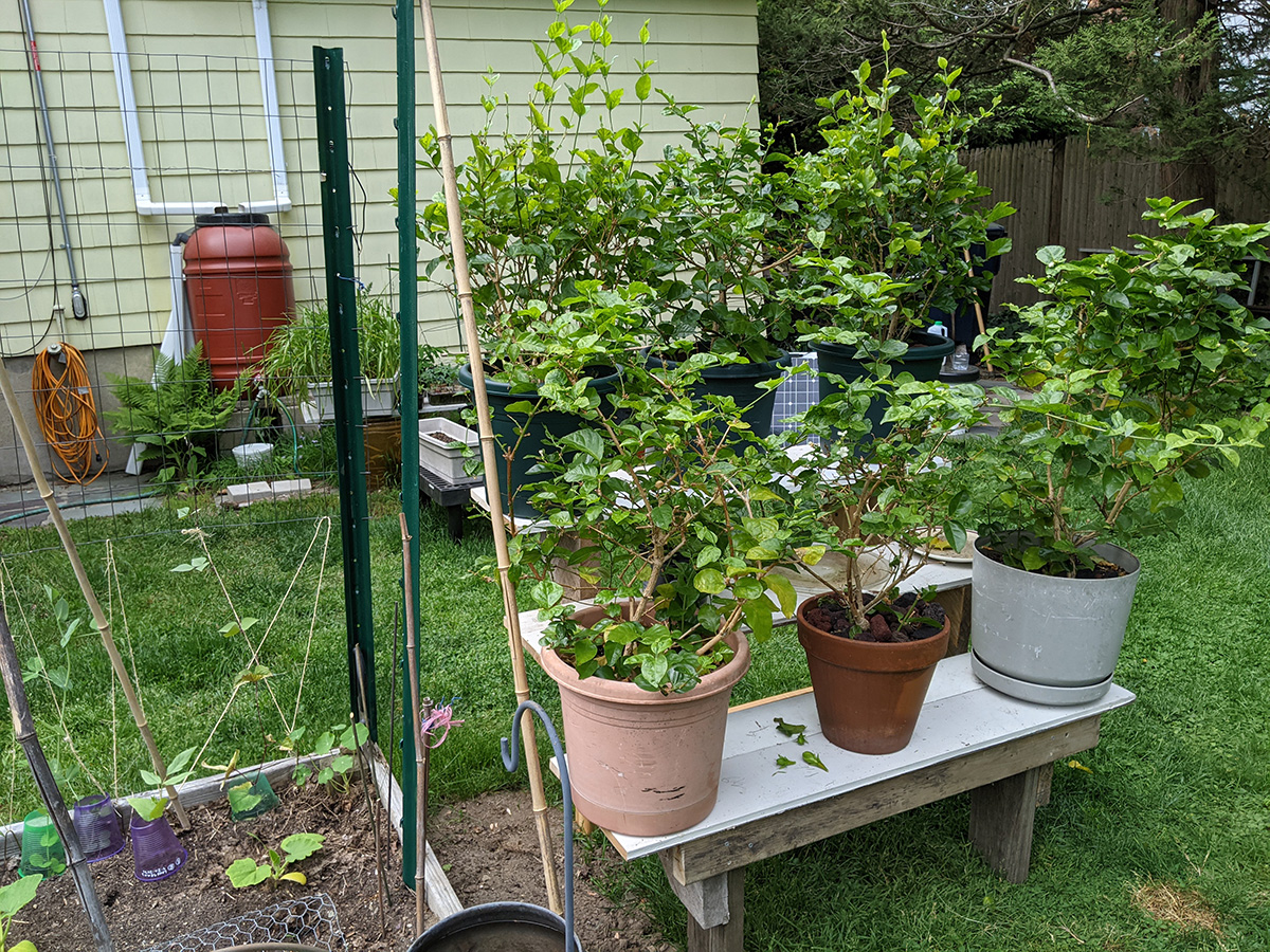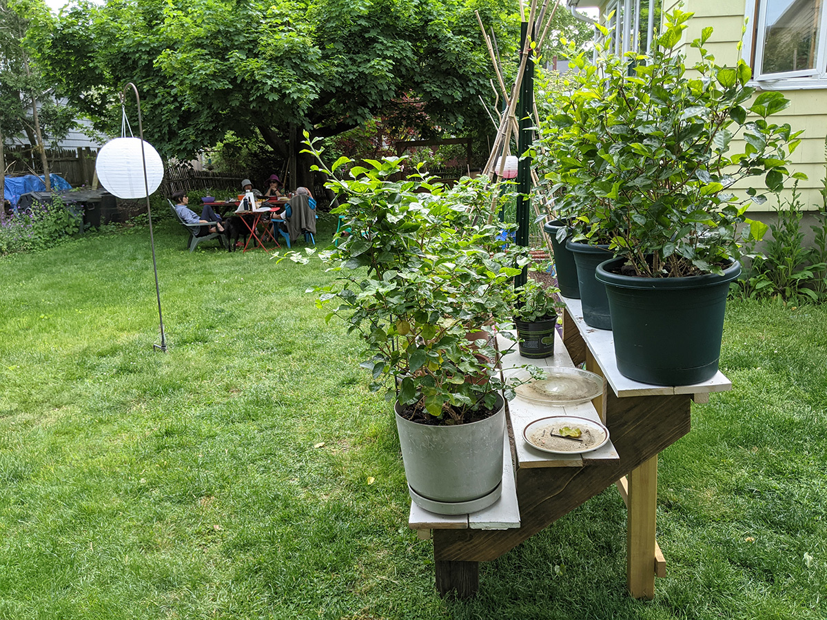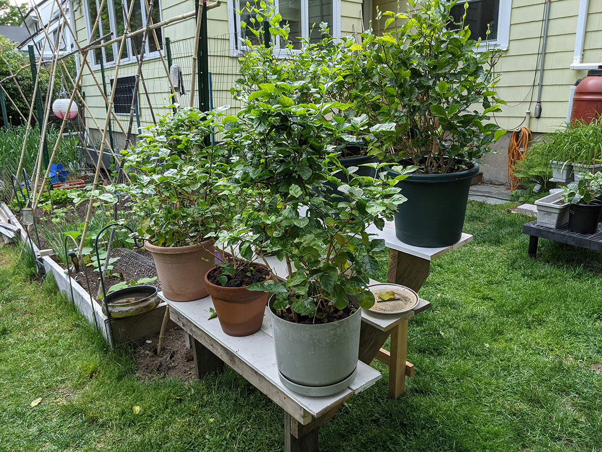 as for the stand, it works, made entirely from leftover pieces of wood, including the two staircase stringers we used to make the tiers. we discovered it's difficult to fill the stand with 9 potted plants, as the middle row can get pretty crowded. instead, 3 large potted plants on the top, 3 large potted plants on the bottom, and smaller plants on the middle step. one advantage of having the plants be up higher is its easier for me to inspect them for mealybugs. also thing we noticed is many of the jasmines are losing their leaves, especially the bottom leaves. they too did not like the transfer to being outside.