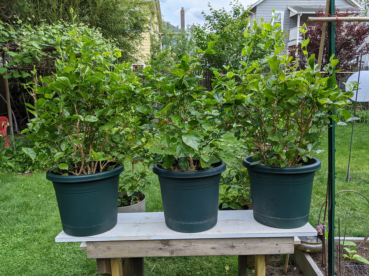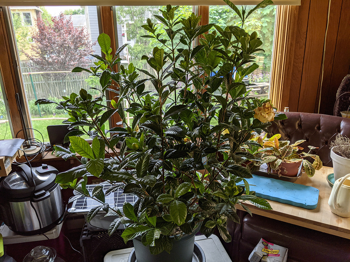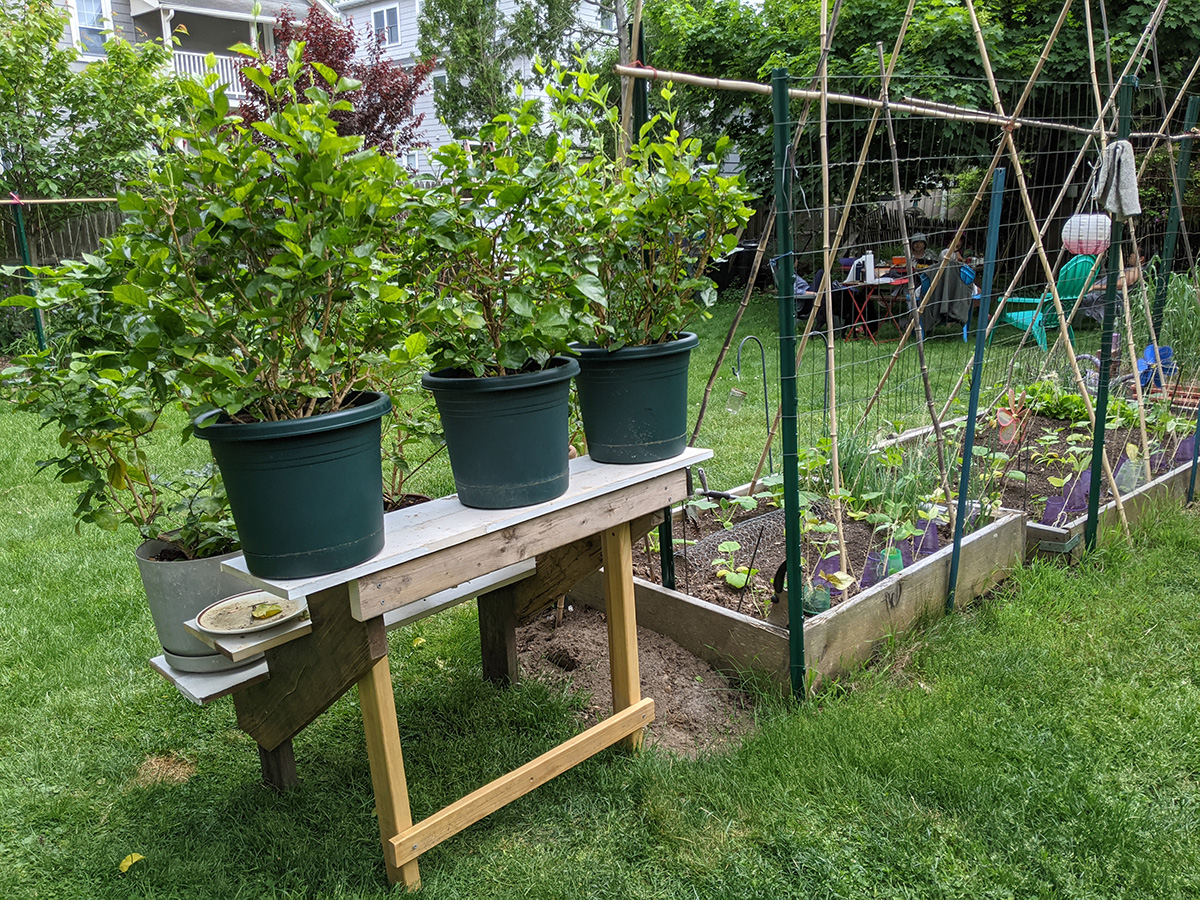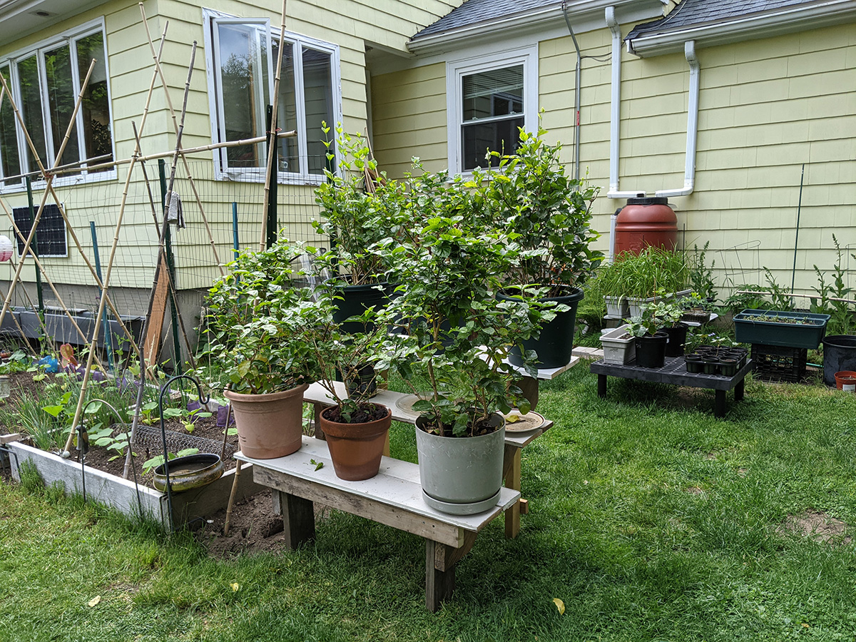 as for the stand, it works, made entirely from leftover pieces of wood, including the two staircase stringers we used to make the tiers. we discovered it's difficult to fill the stand with 9 potted plants, as the middle row can get pretty crowded. instead, 3 large potted plants on the top, 3 large potted plants on the bottom, and smaller plants on the middle step. one advantage of having the plants be up higher is its easier for me to inspect them for mealybugs. also thing we noticed is many of the jasmines are losing their leaves, especially the bottom leaves. they too did not like the transfer to being outside.