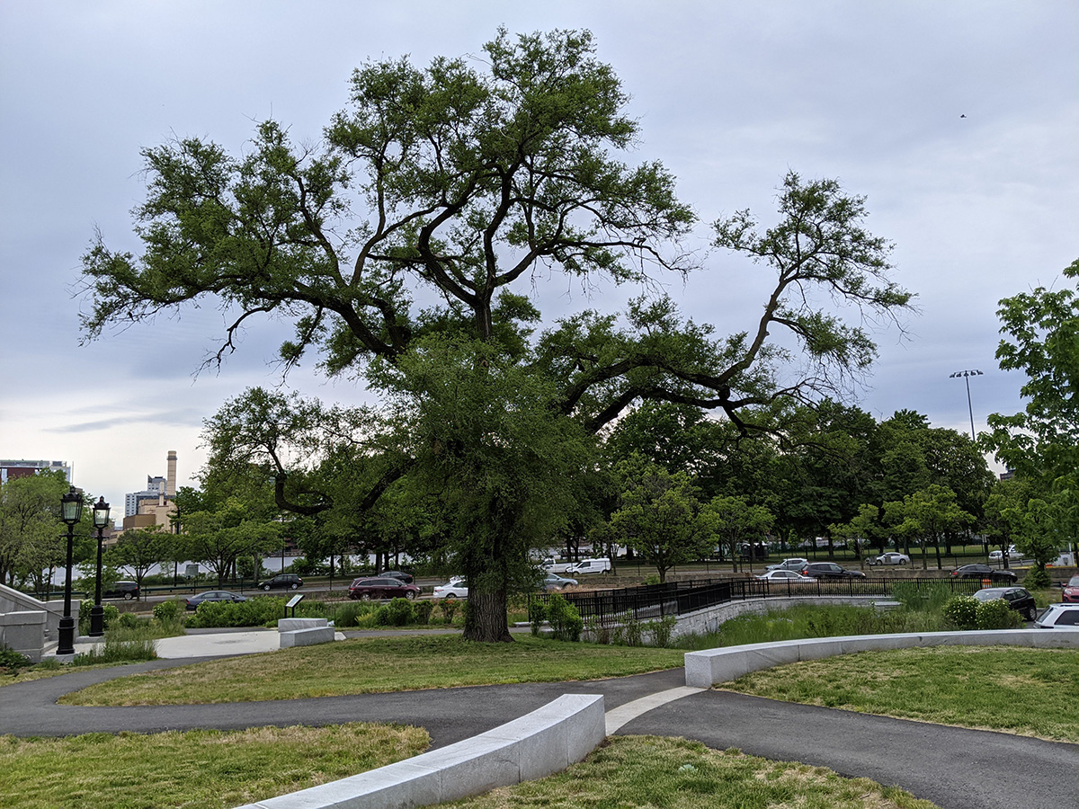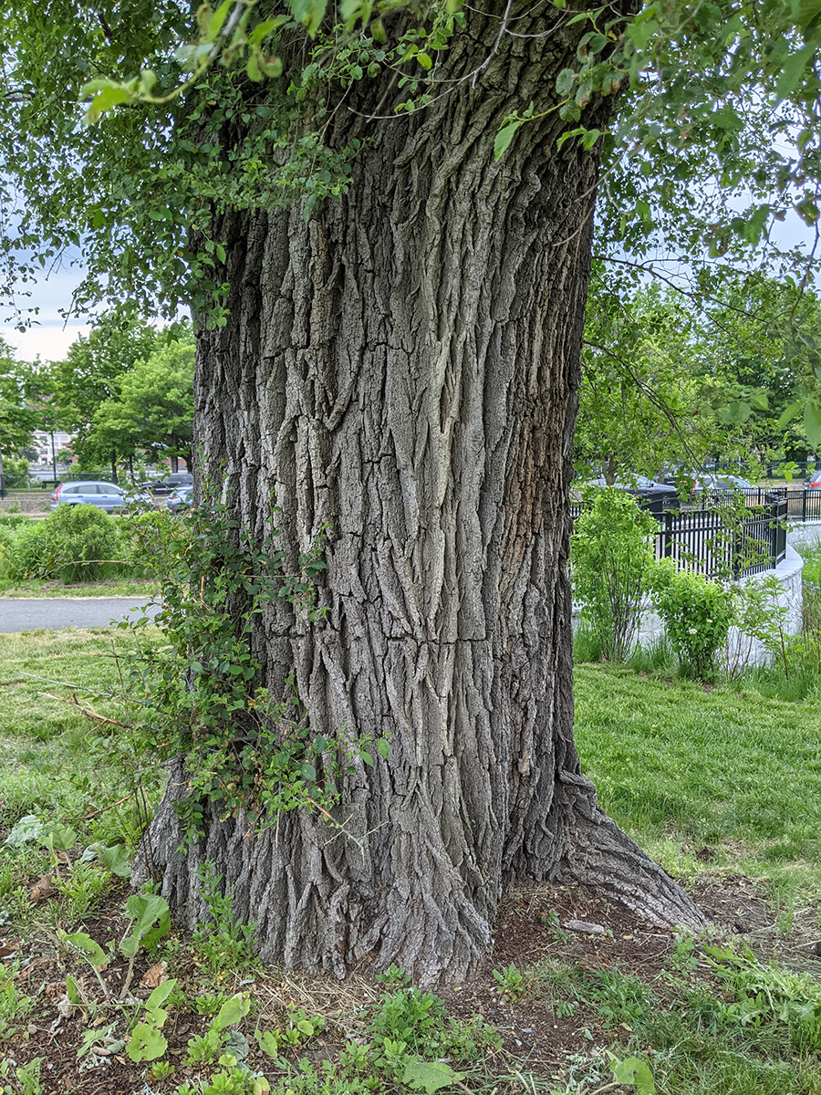 i left boston by 3pm. i stopped briefly at the foot of the longfellow bridge to check out lynn's favorite tree. it looks to be an elm but i'm not 100% sure even after examining the leaves, which seem smaller than the typical elm. i also saw some elm seedpods in the grass, but the rain and mowing had gotten rid of much of them, and i couldn't be sure they were just blown there. i didn't see any seed pods on the branches though.