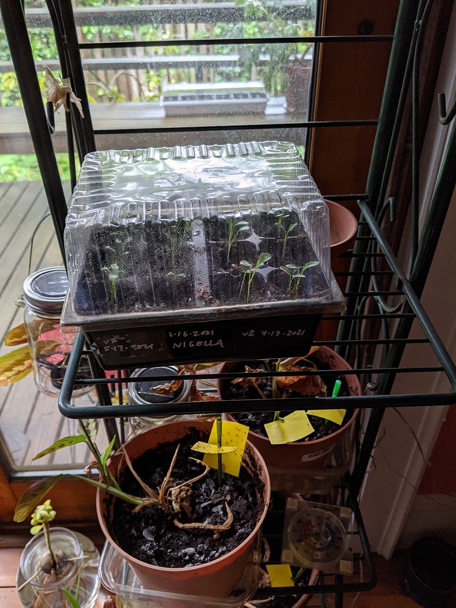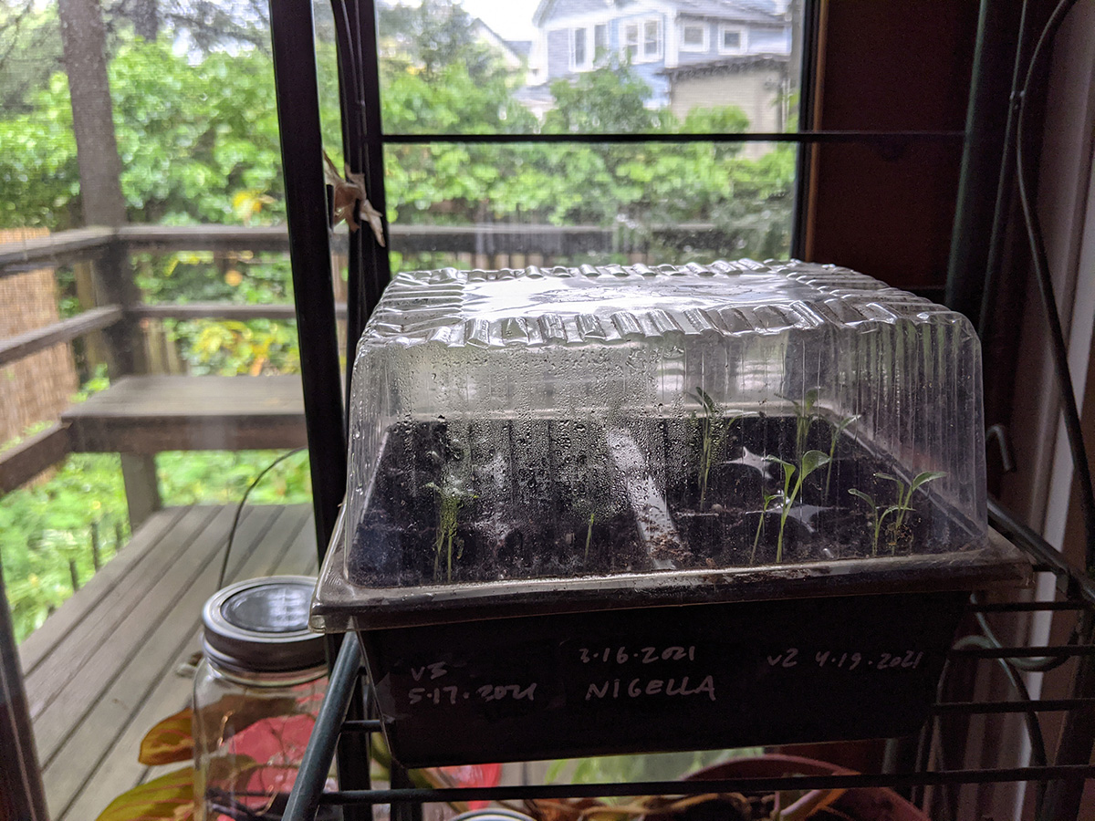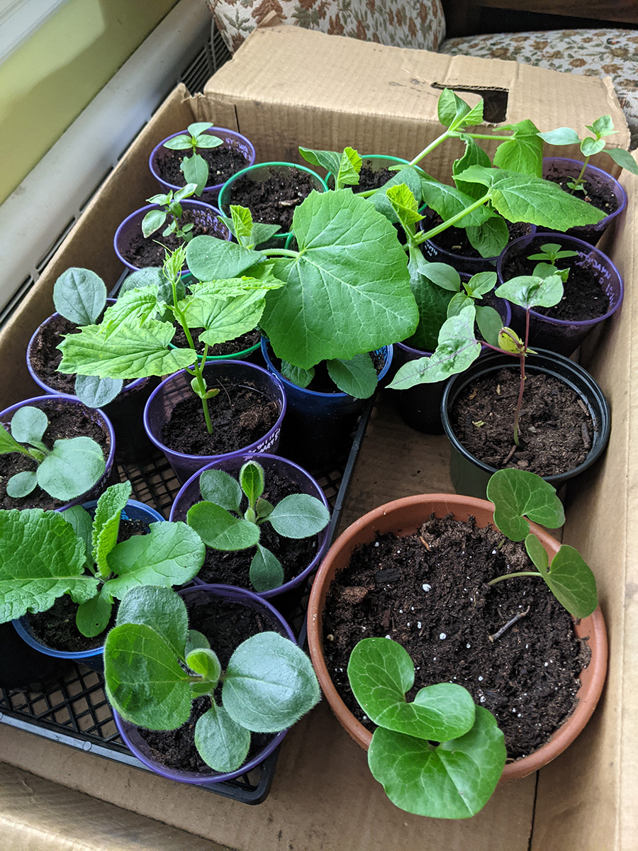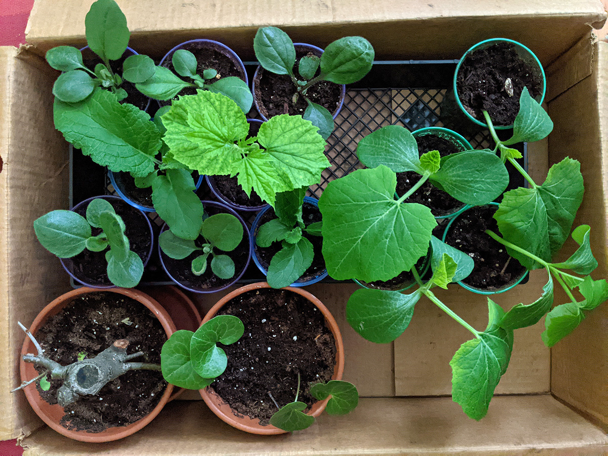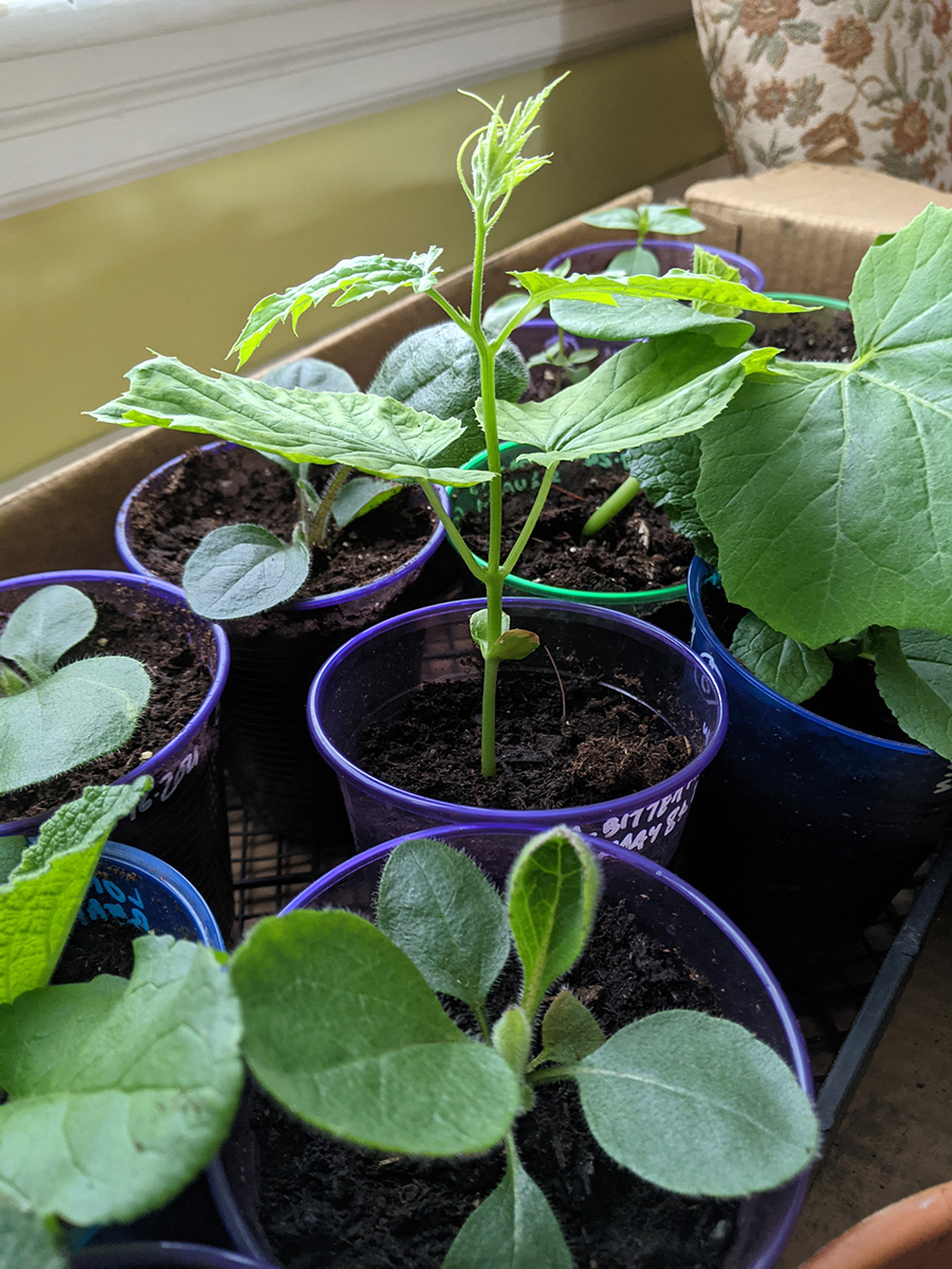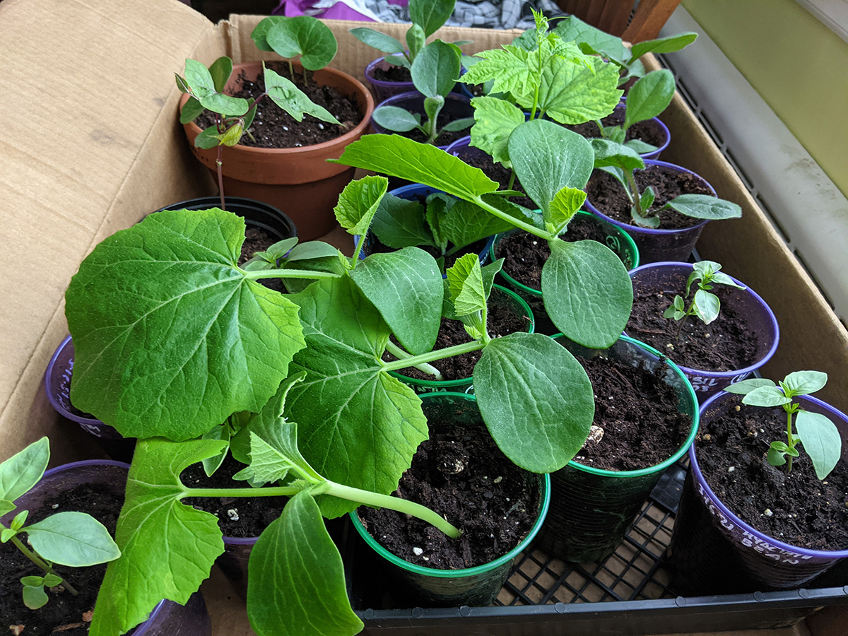 my father came to pick me up in the late morning because it was raining, and i moved out the last of my grow closet seedlings, including 4 buttercup squashes, 1 bitter melon, 6 thai basils, 5 rudbeckia 'cherokee sunset', and 2 snowy spires.